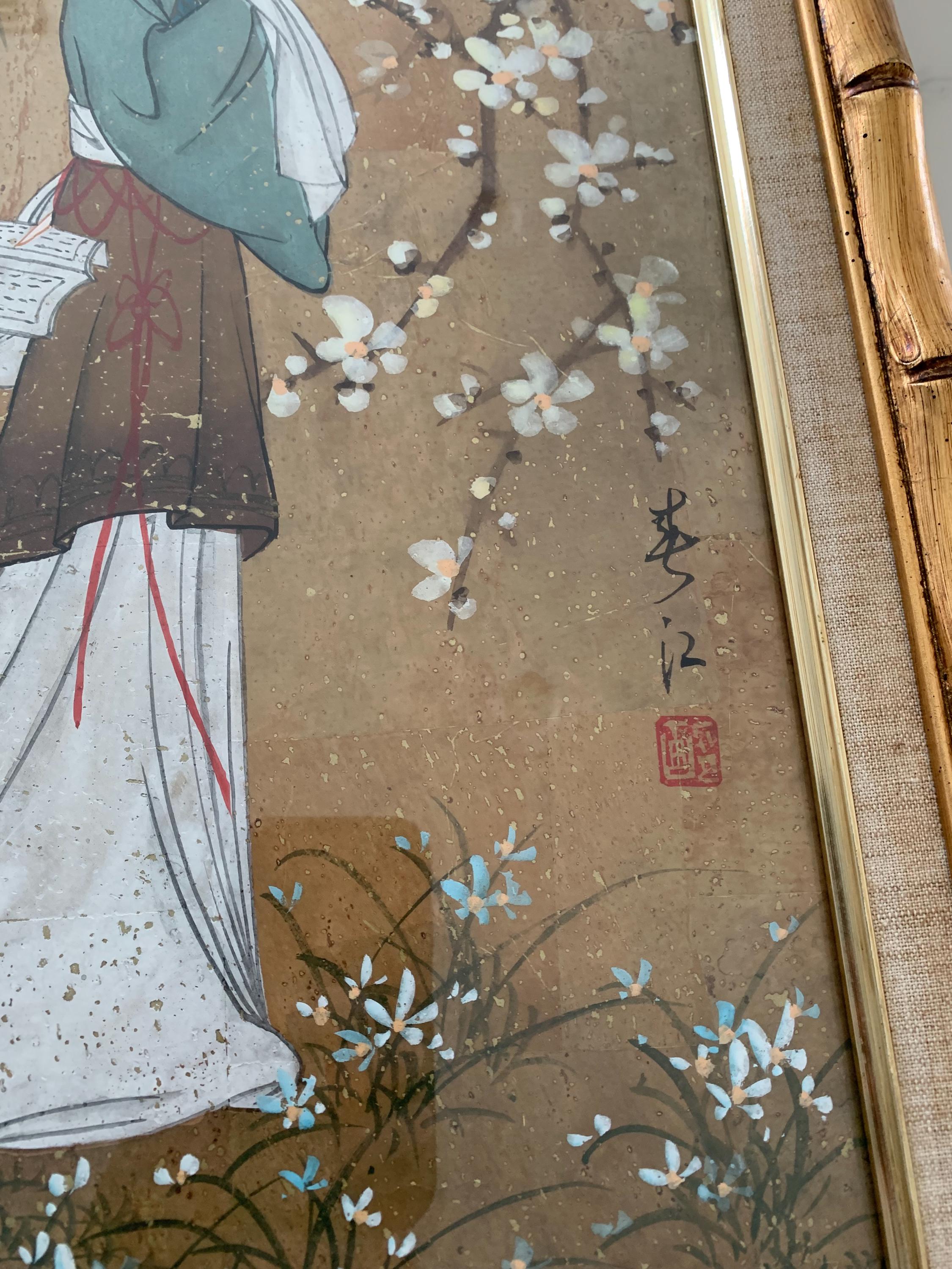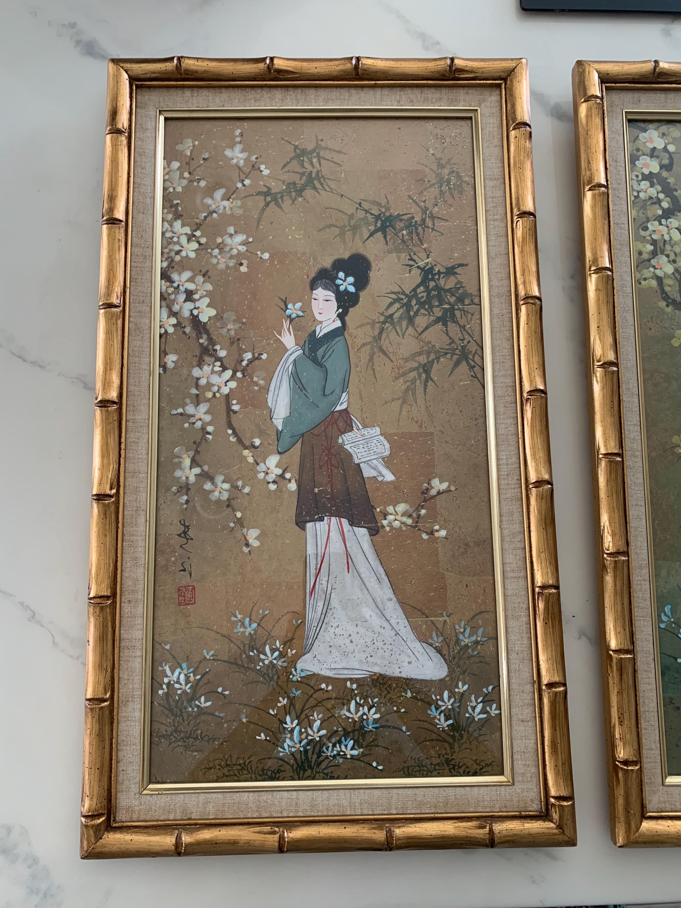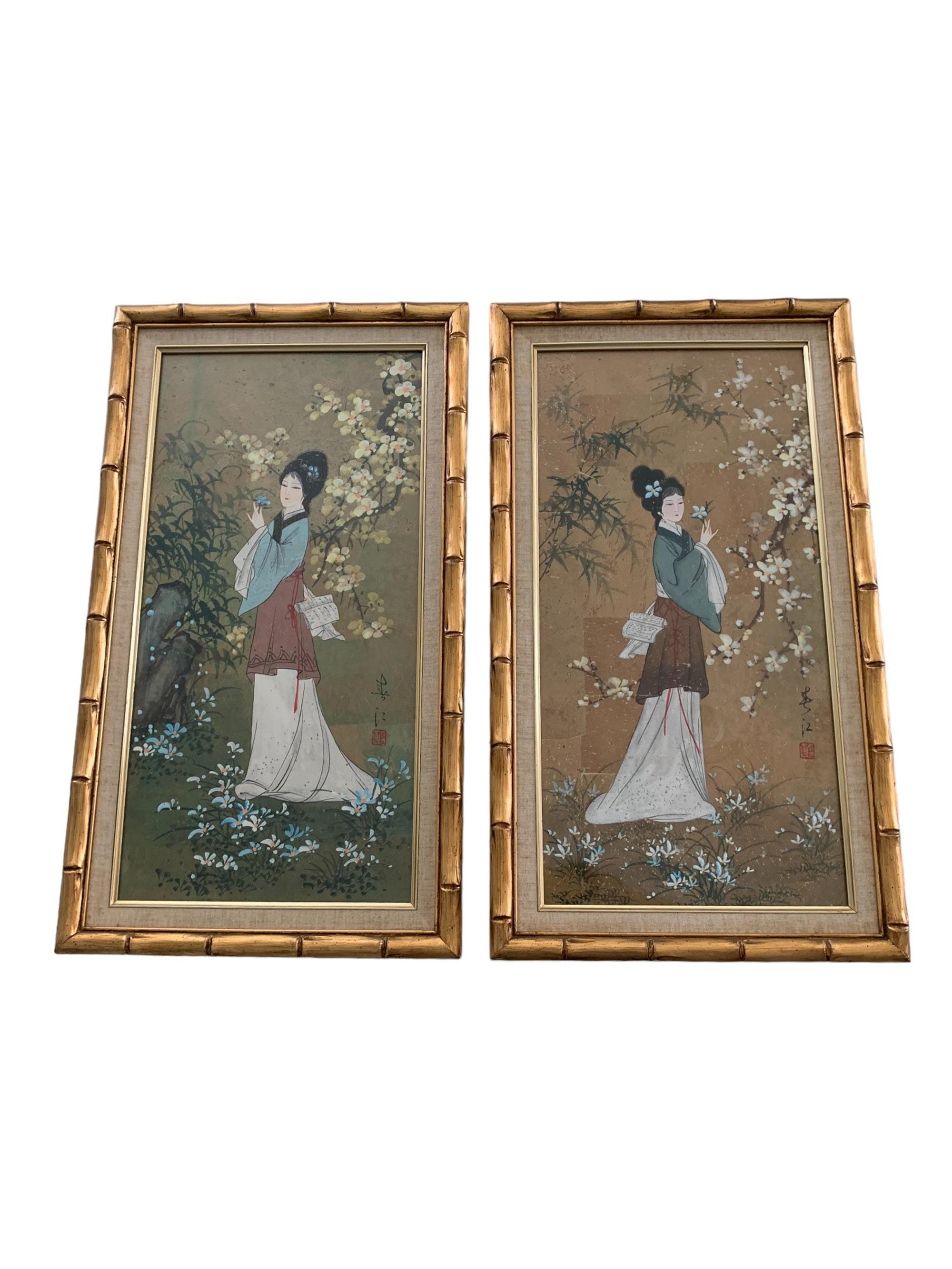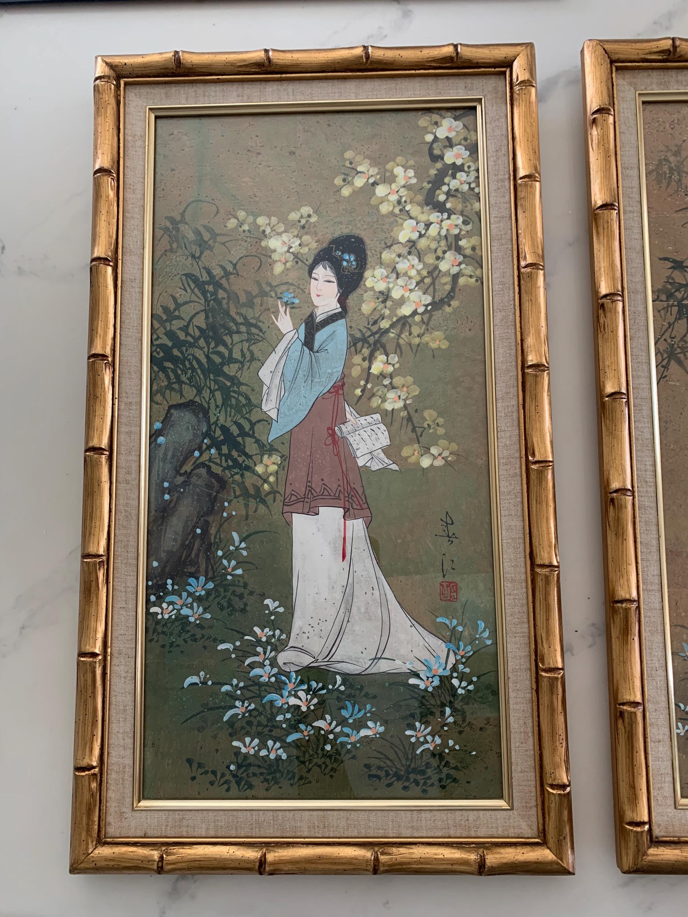 Just the right amount of glitz and chinoiserie for an entry way or powder room! Encased in a gold faux bamboo frame are two gouache watercolor paintings depicting females amongst cherry blossoms and bamboo. They are both signed by the artist
