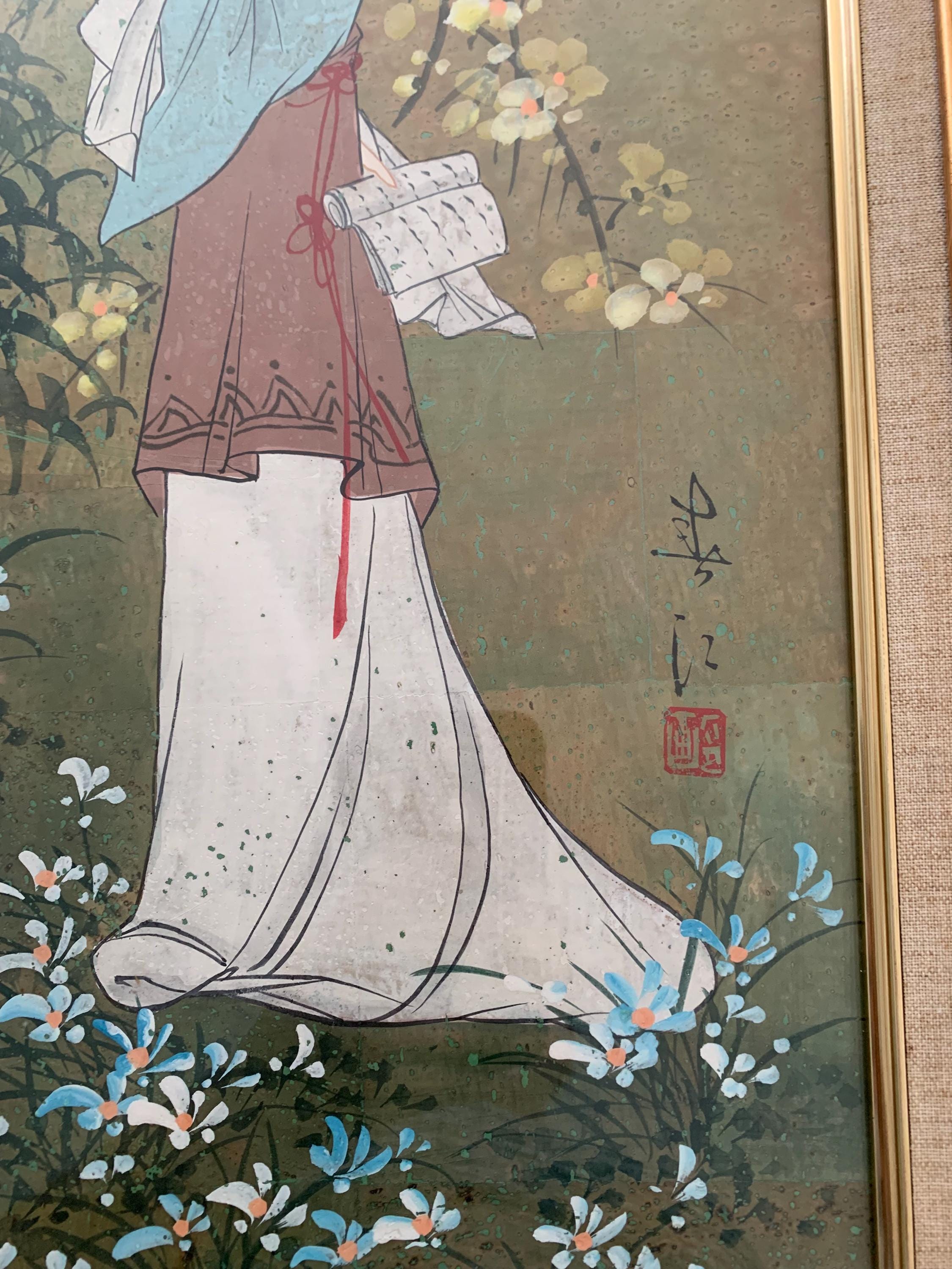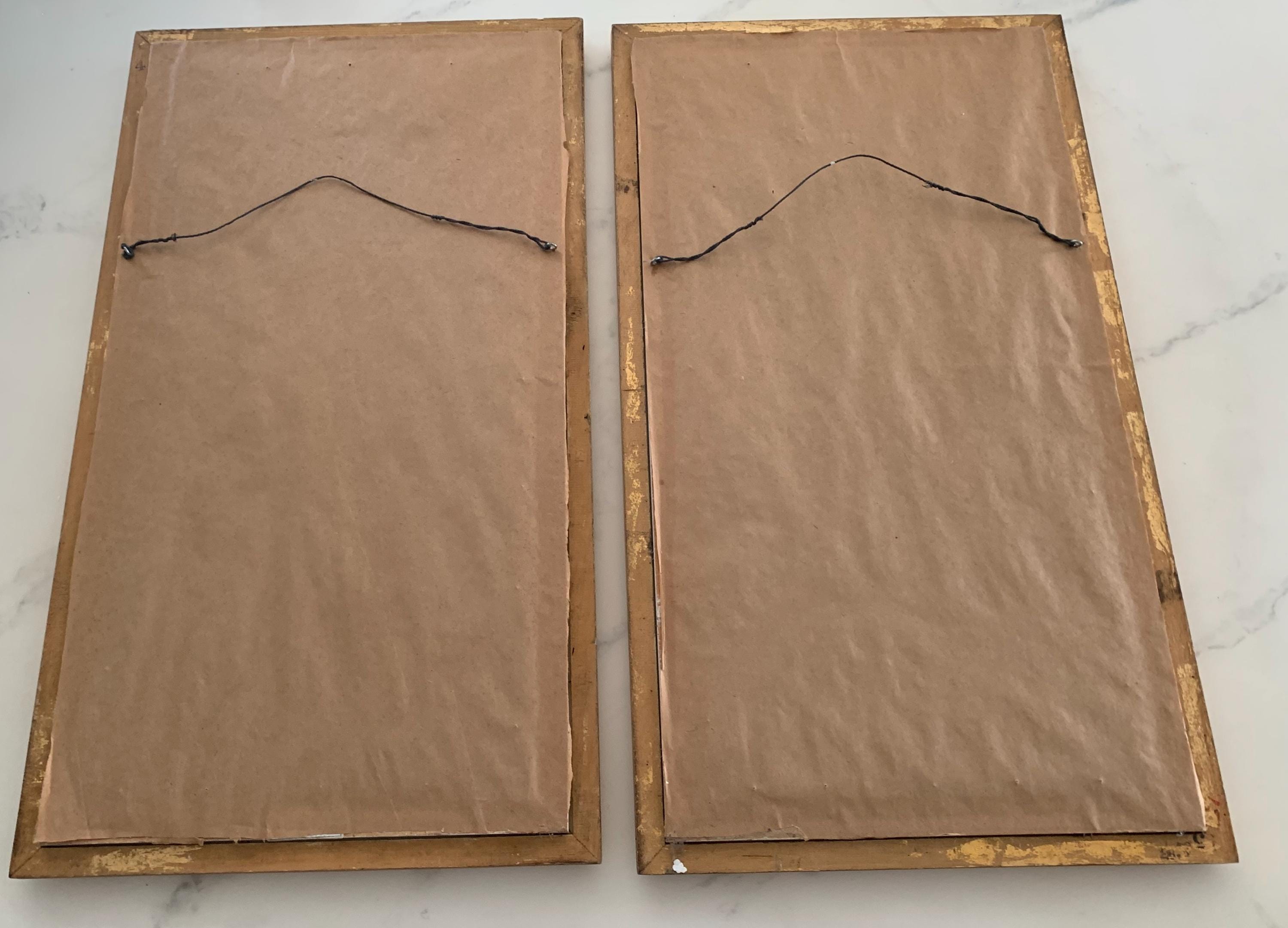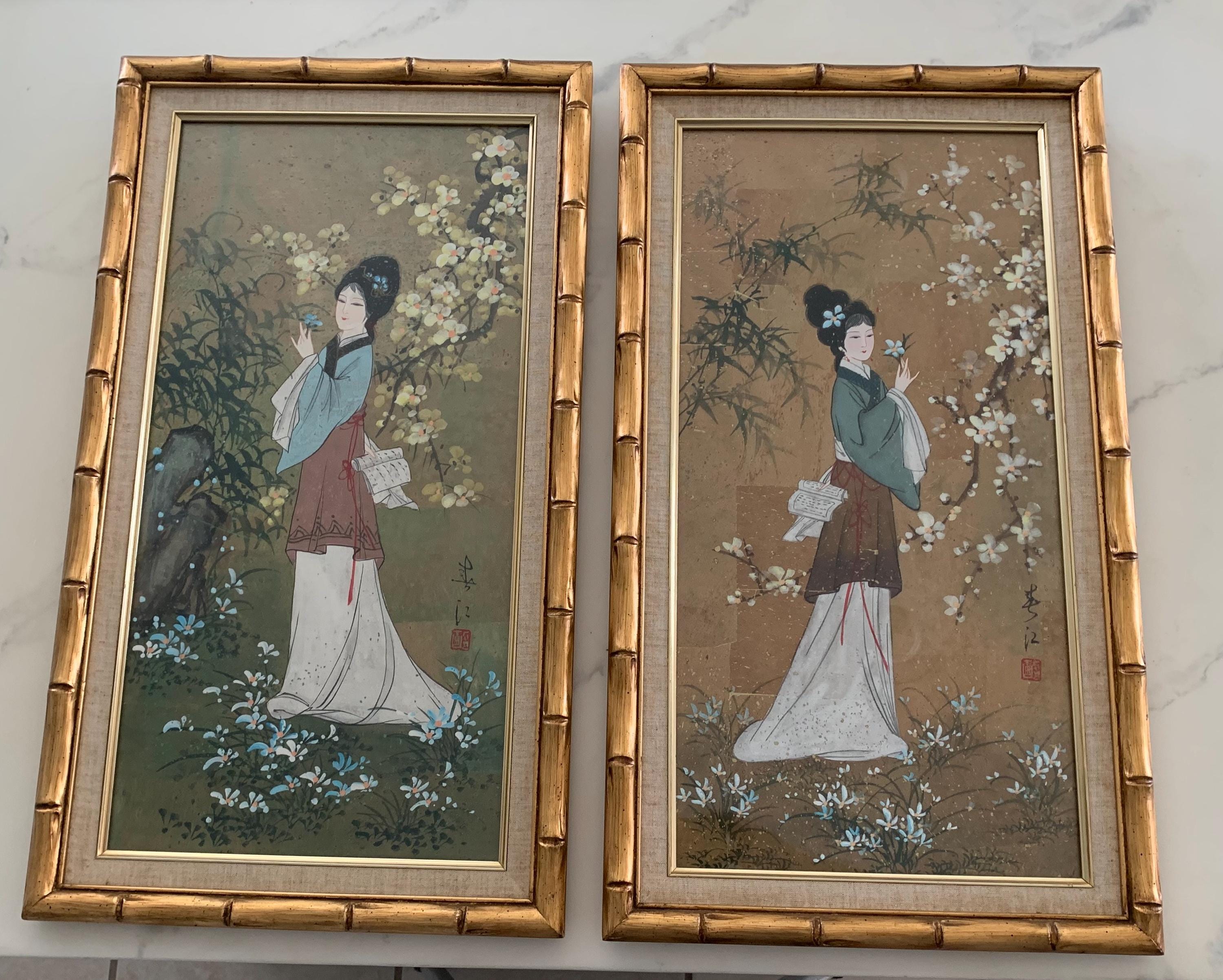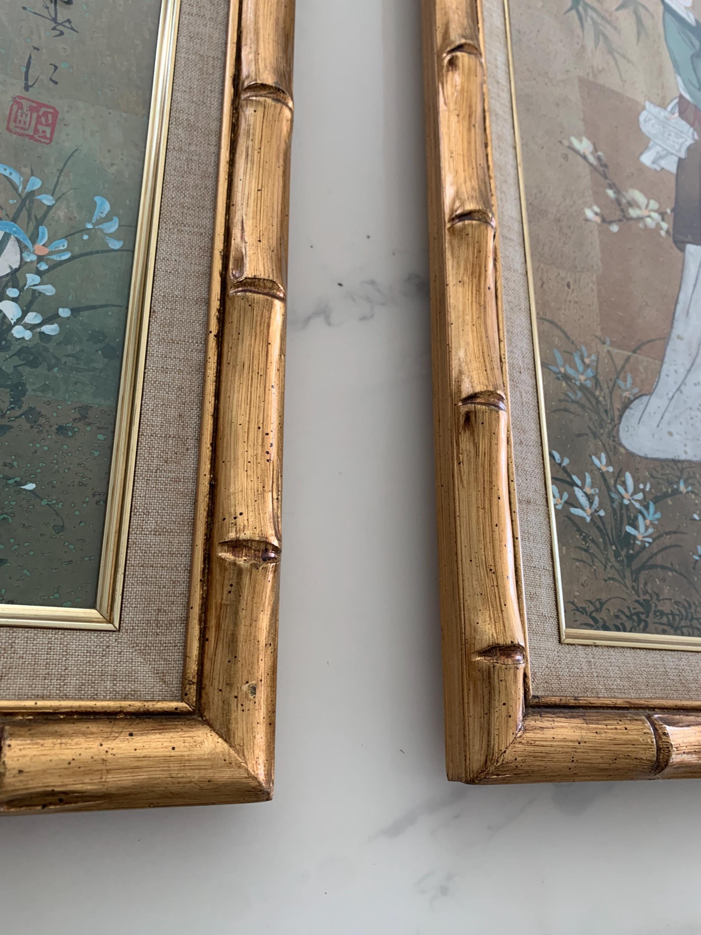 Just the right amount of glitz and chinoiserie for an entry way or powder room! Encased in a gold faux bamboo frame are two gouache watercolor paintings depicting females amongst cherry blossoms and bamboo. They are both signed by the artist