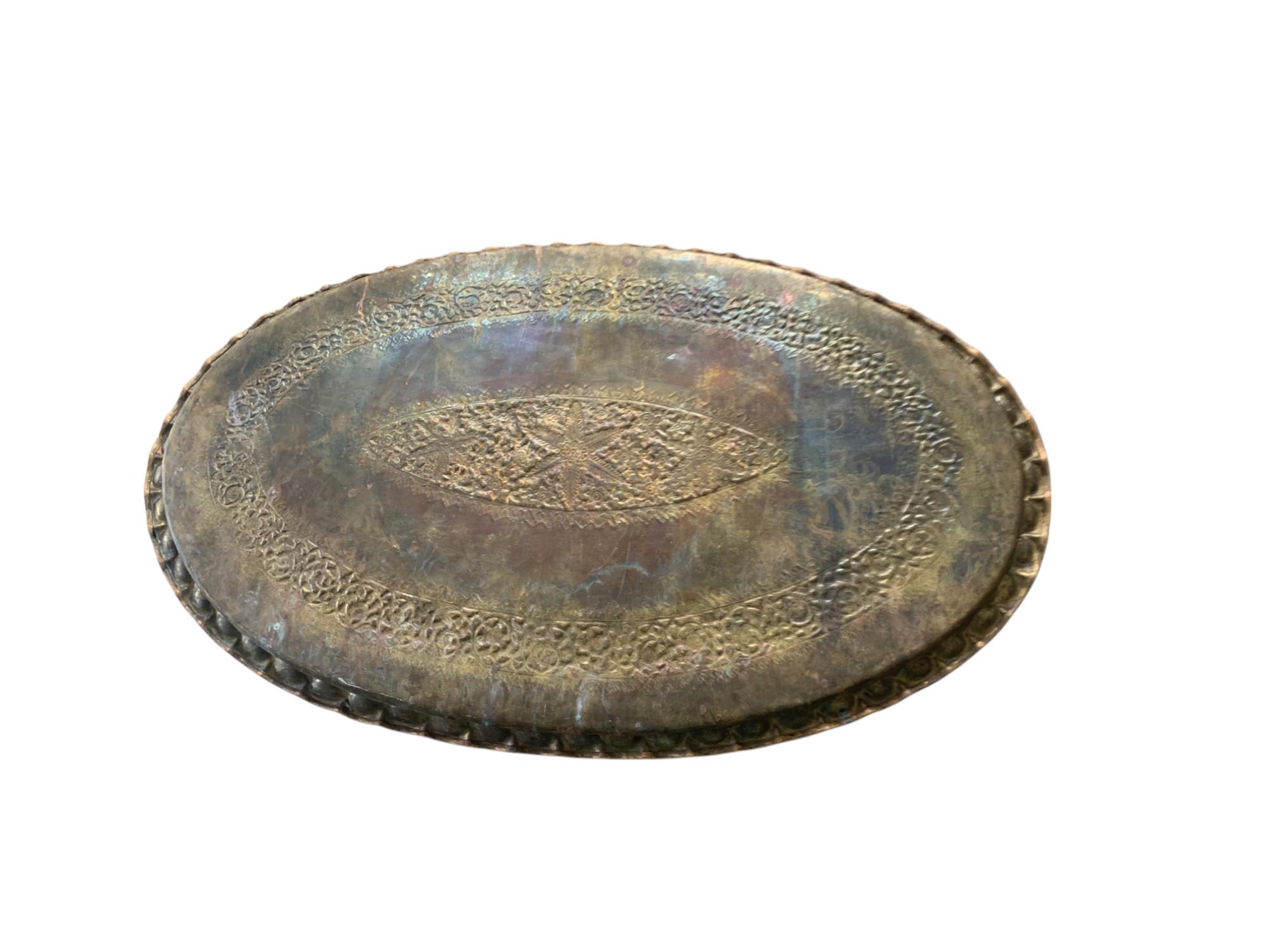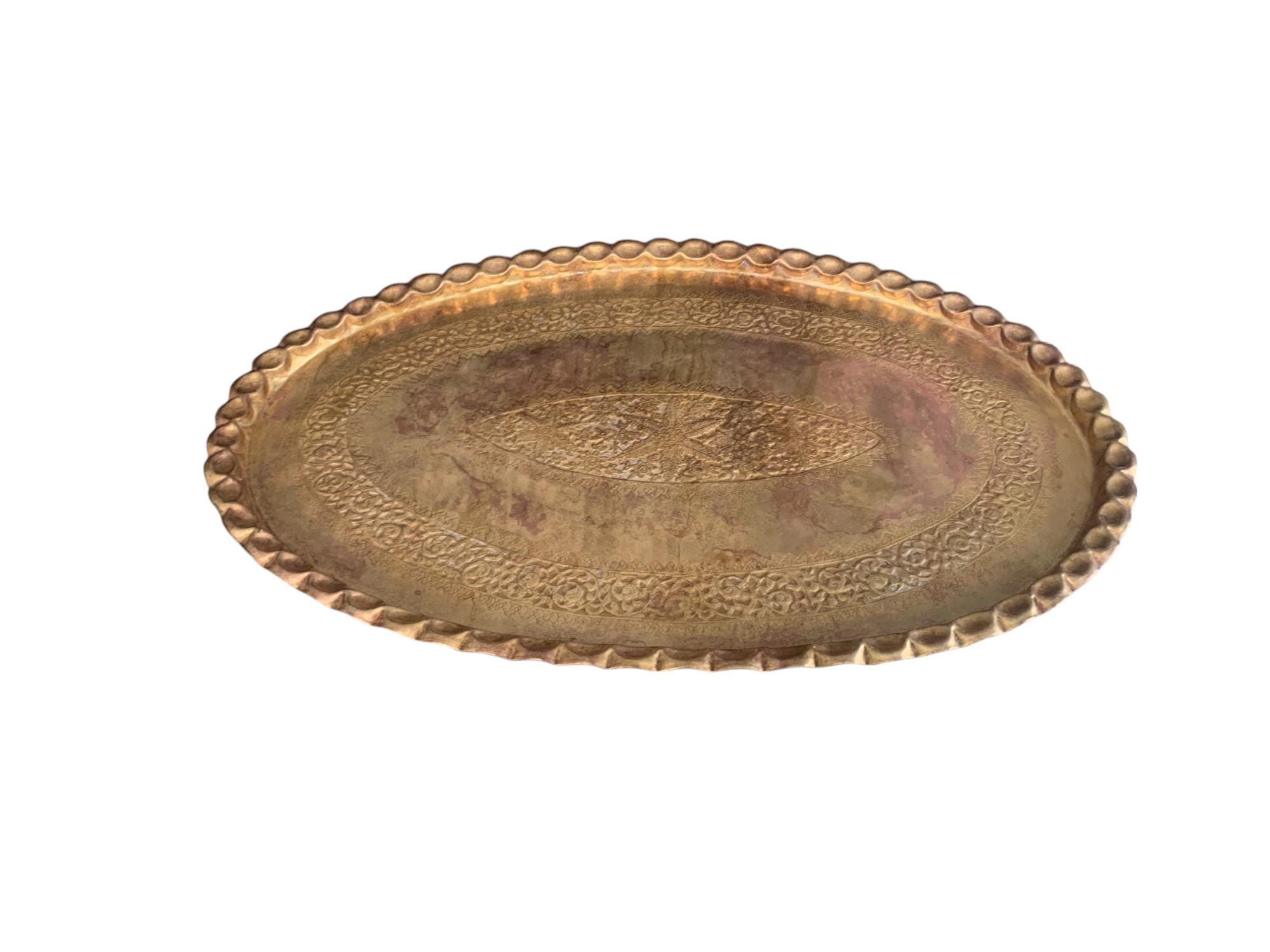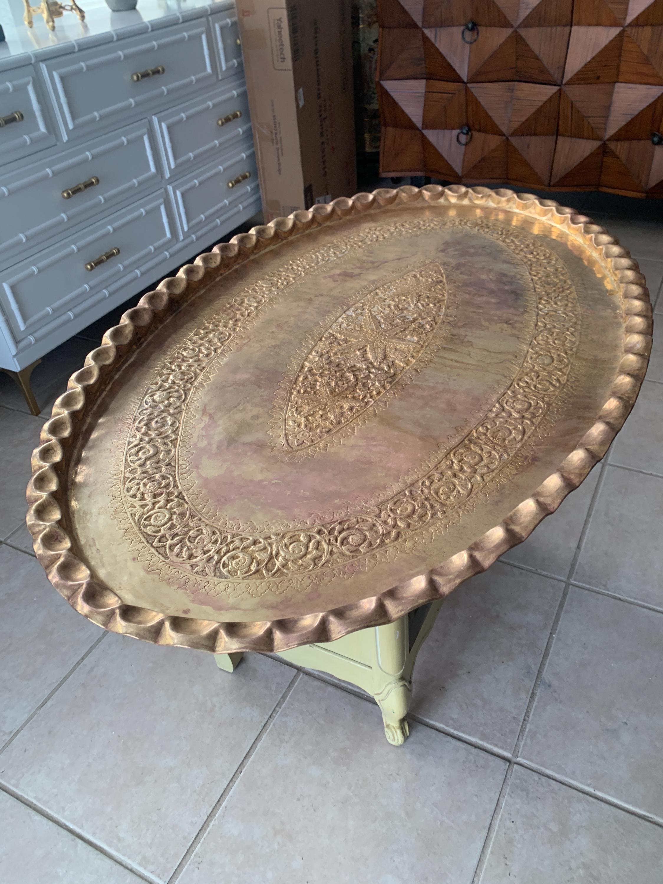 Explore the timeless elegance of the Mid-Century Oval Brass Tea Tray Table top, a stunning piece that merges function with the chic design of the past. Measuring an ample 46 inches in width, this coffee table top provides generous space for your books, beverages, and decorative items. The oval shape creates a soft, inviting contour, while the brass handle adds a touch of sophistication and durability. . Whether used as a centerpiece or a practical surface, this brass-accented table is a versatile addition to your home.