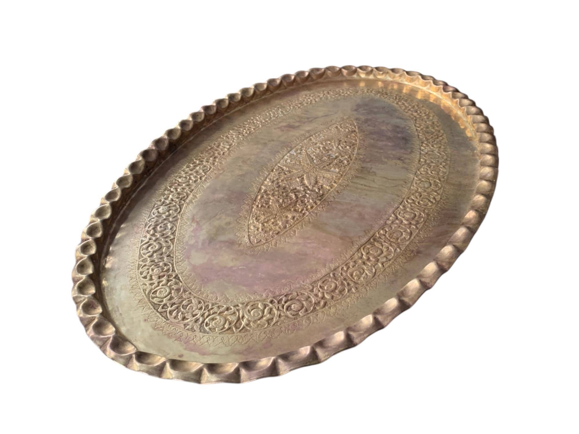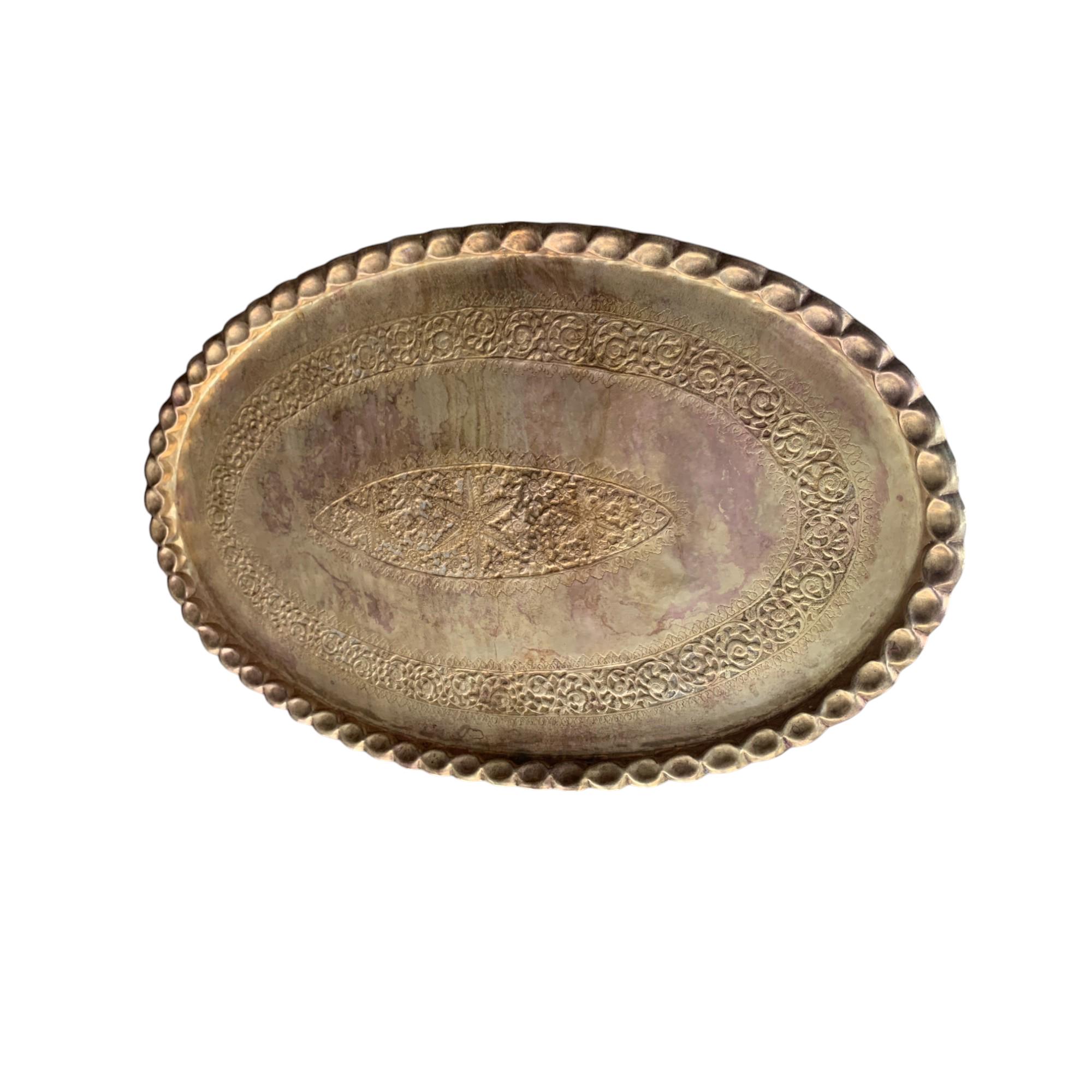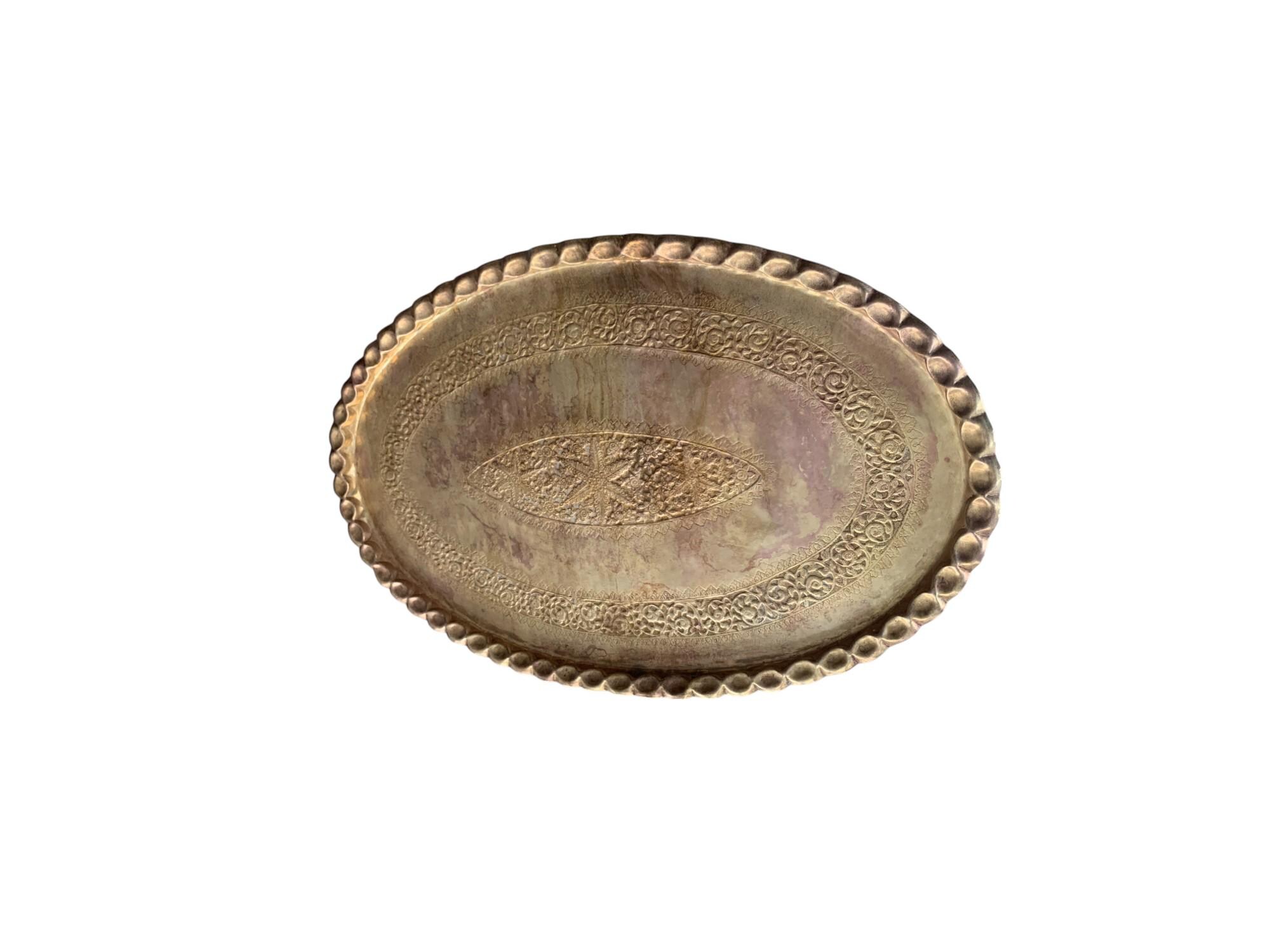 Explore the timeless elegance of the Mid-Century Oval Brass Tea Tray Table top, a stunning piece that merges function with the chic design of the past. Measuring an ample 46 inches in width, this coffee table top provides generous space for your books, beverages, and decorative items. The oval shape creates a soft, inviting contour, while the brass handle adds a touch of sophistication and durability. . Whether used as a centerpiece or a practical surface, this brass-accented table is a versatile addition to your home.