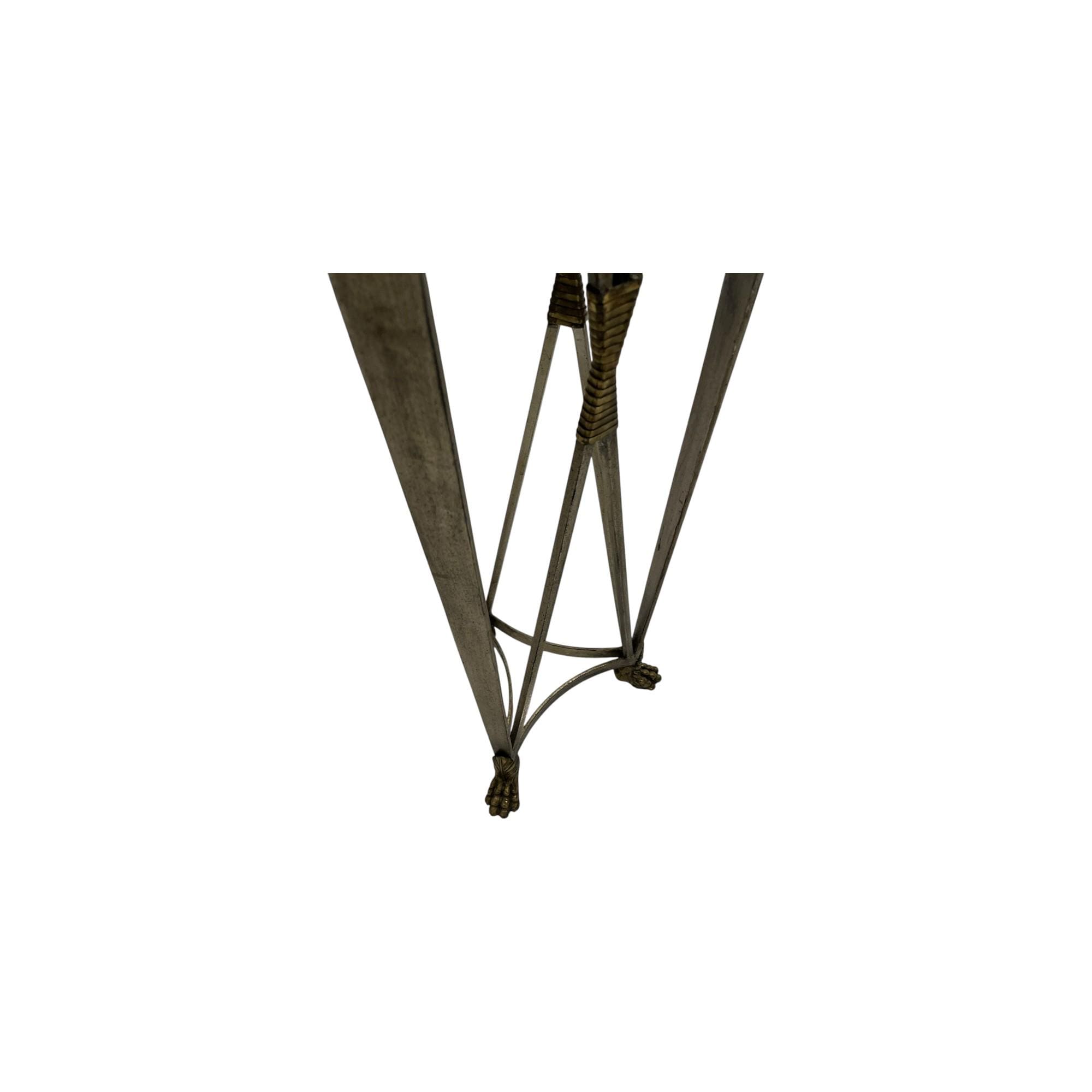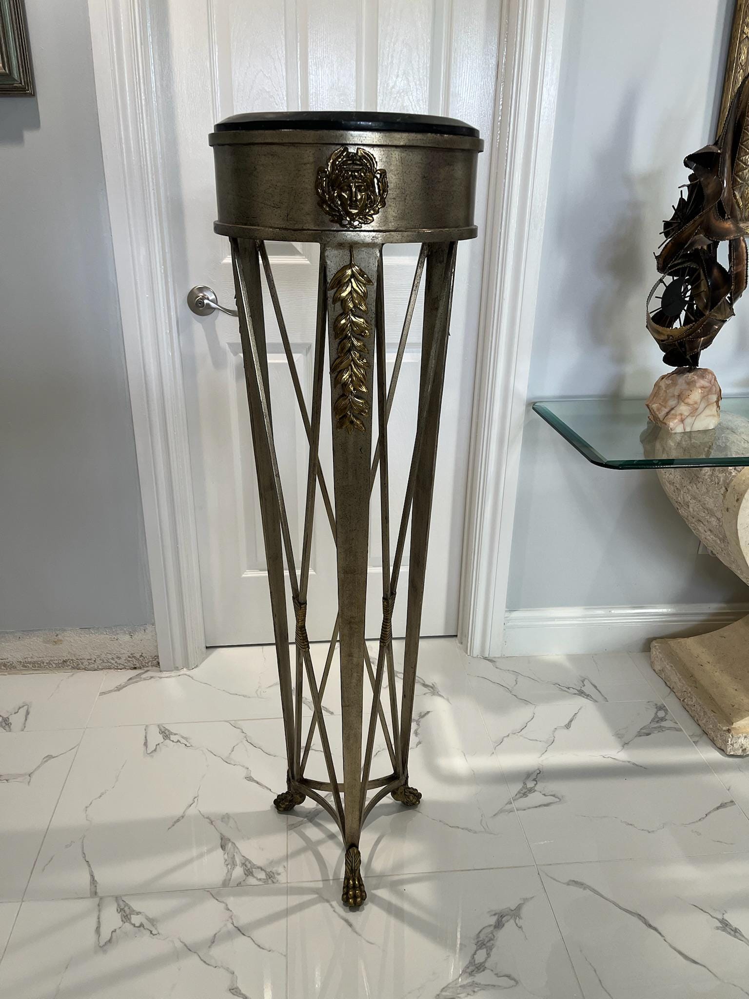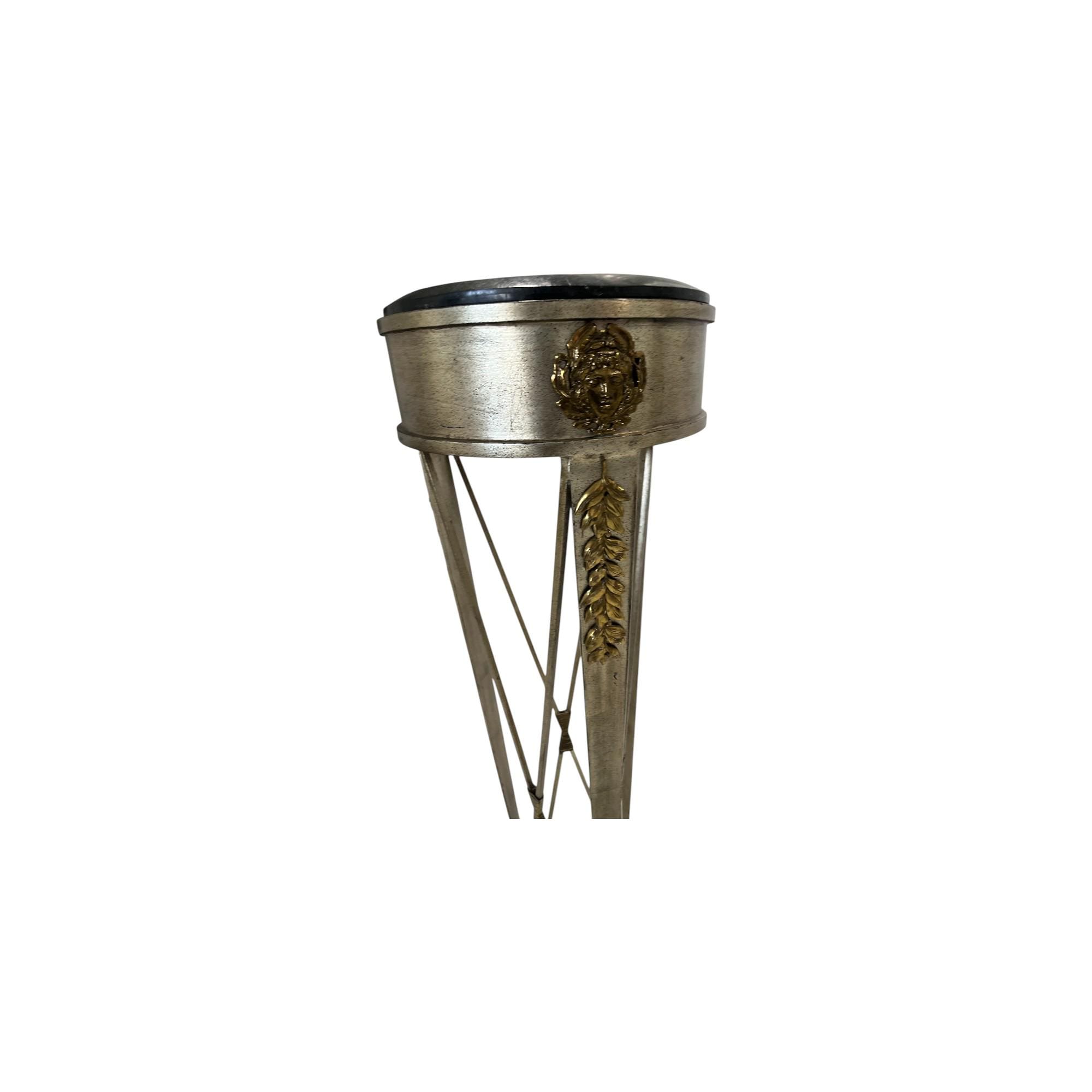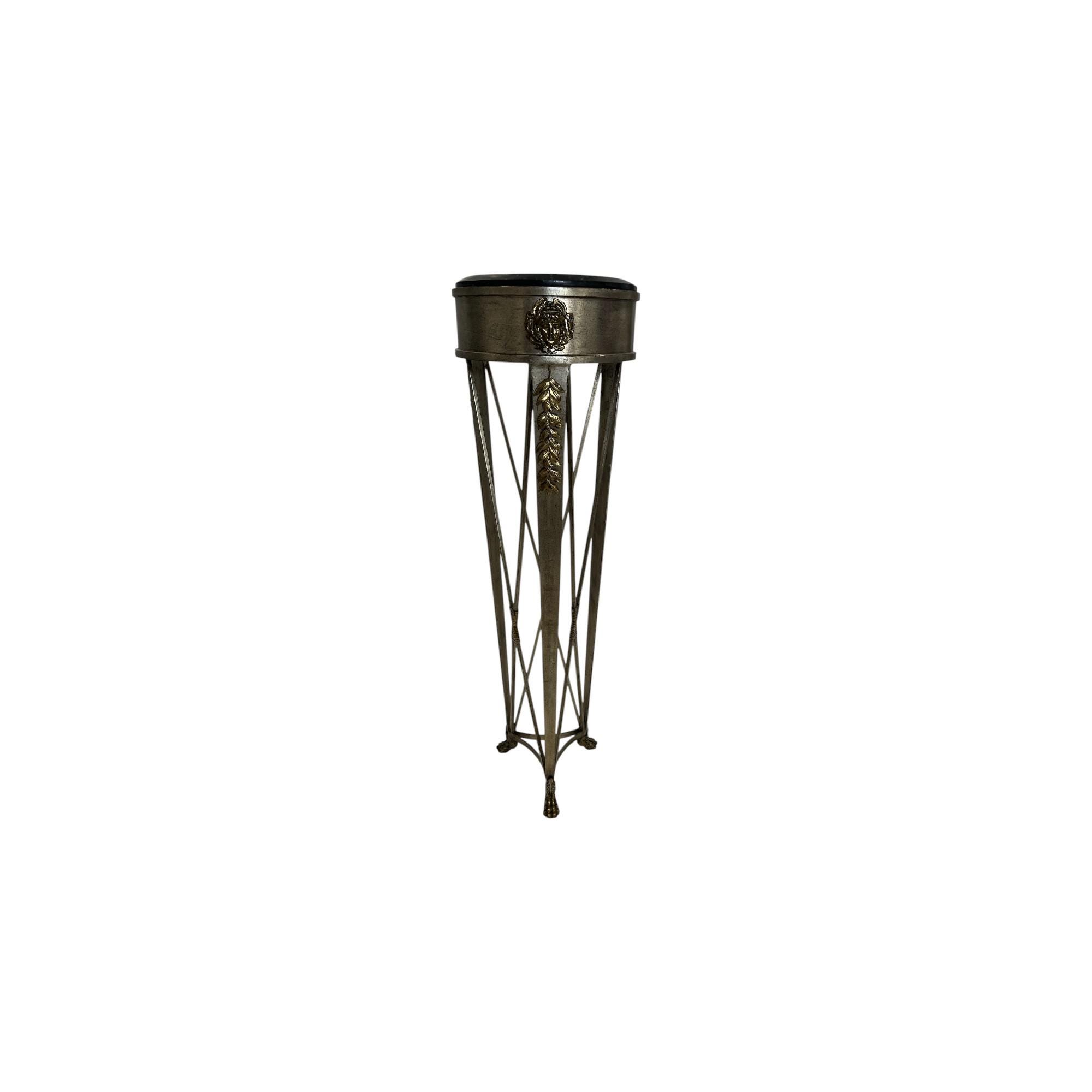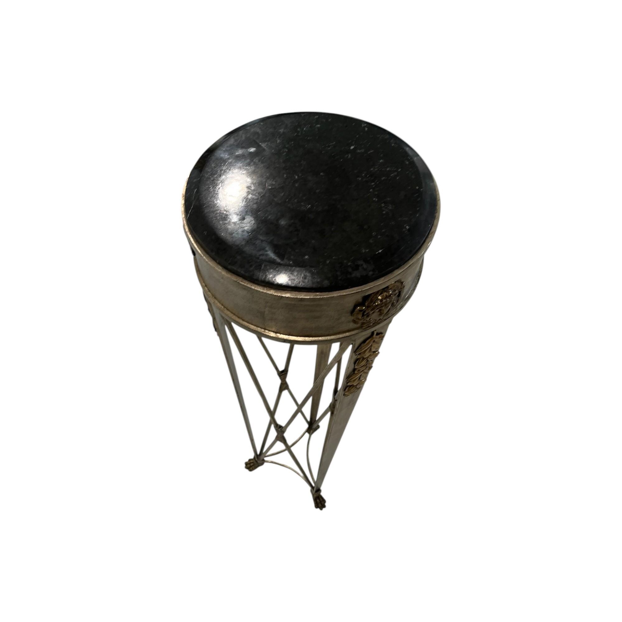 Tall Neoclassical gueridon or directoire-style pedestal in silver painted metal with paw feet, brass mounts and tessellated faux-marble top