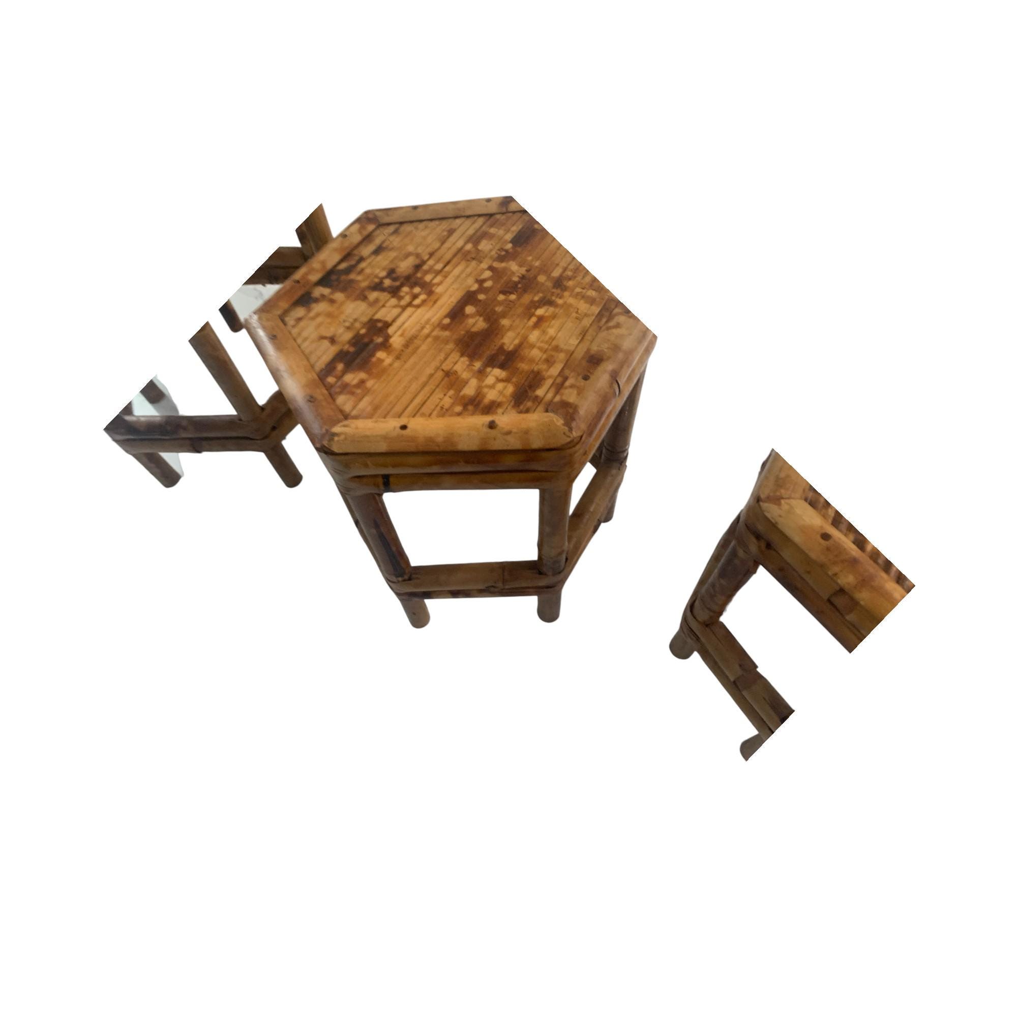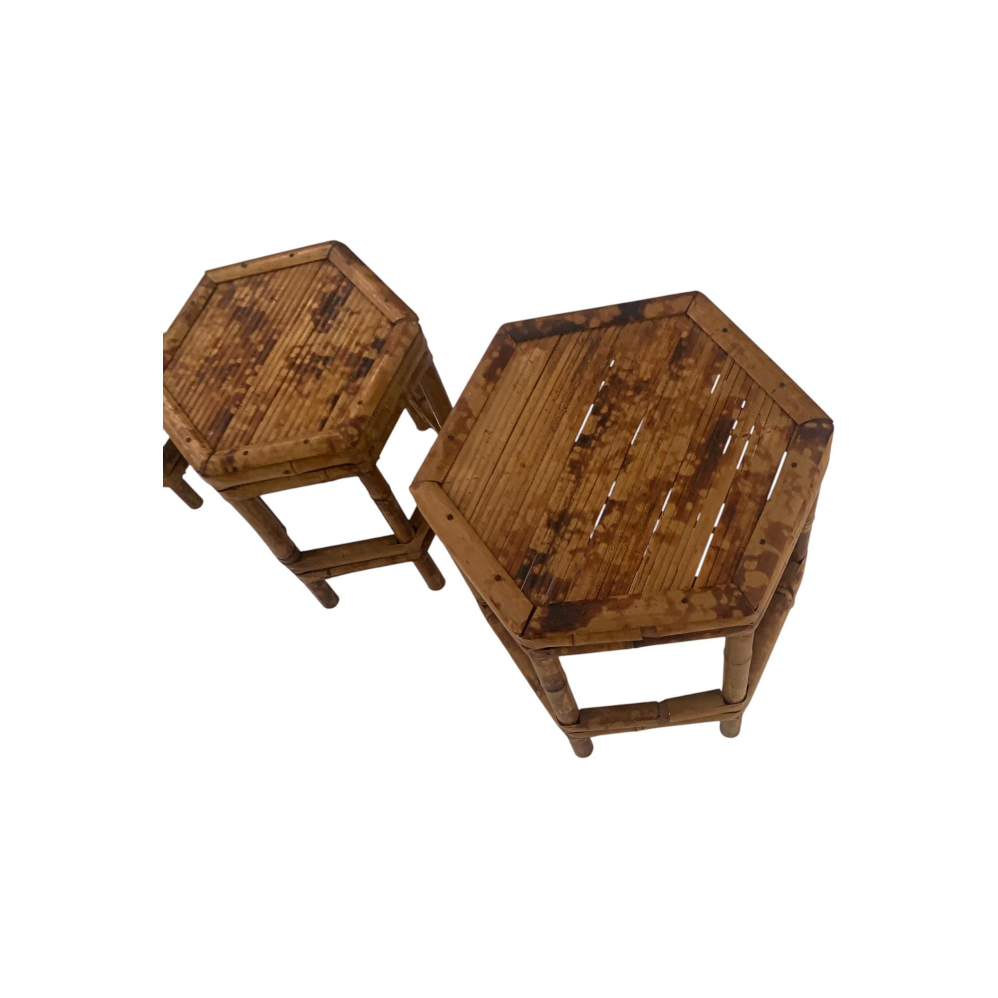 These vintage tortoise shell burnt bamboo plant stands are a stylish addition to any indoor or outdoor space. The hexagonal pattern and retro style give them a unique and charming look, while the medium size makes them versatile for holding a variety of plants. Made of durable bamboo material, these stackable stands are perfect for displaying your favorite greenery in a visually appealing way. Add a touch of vintage flair to your home or garden with this lot of 3 charming plant holders.