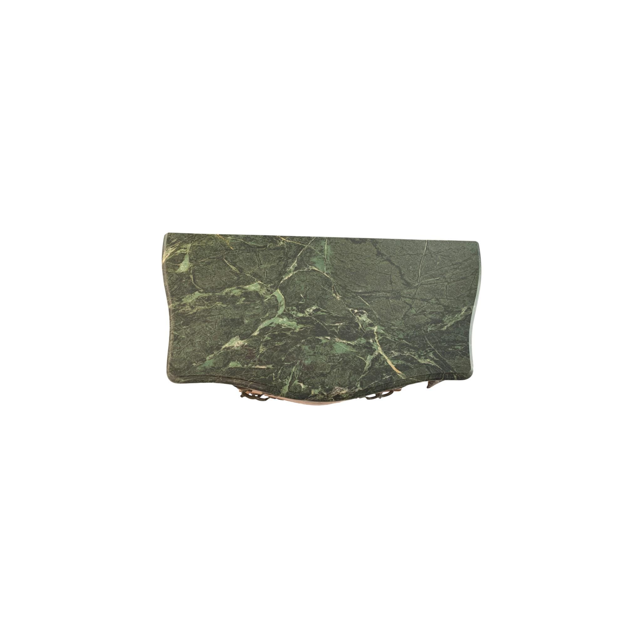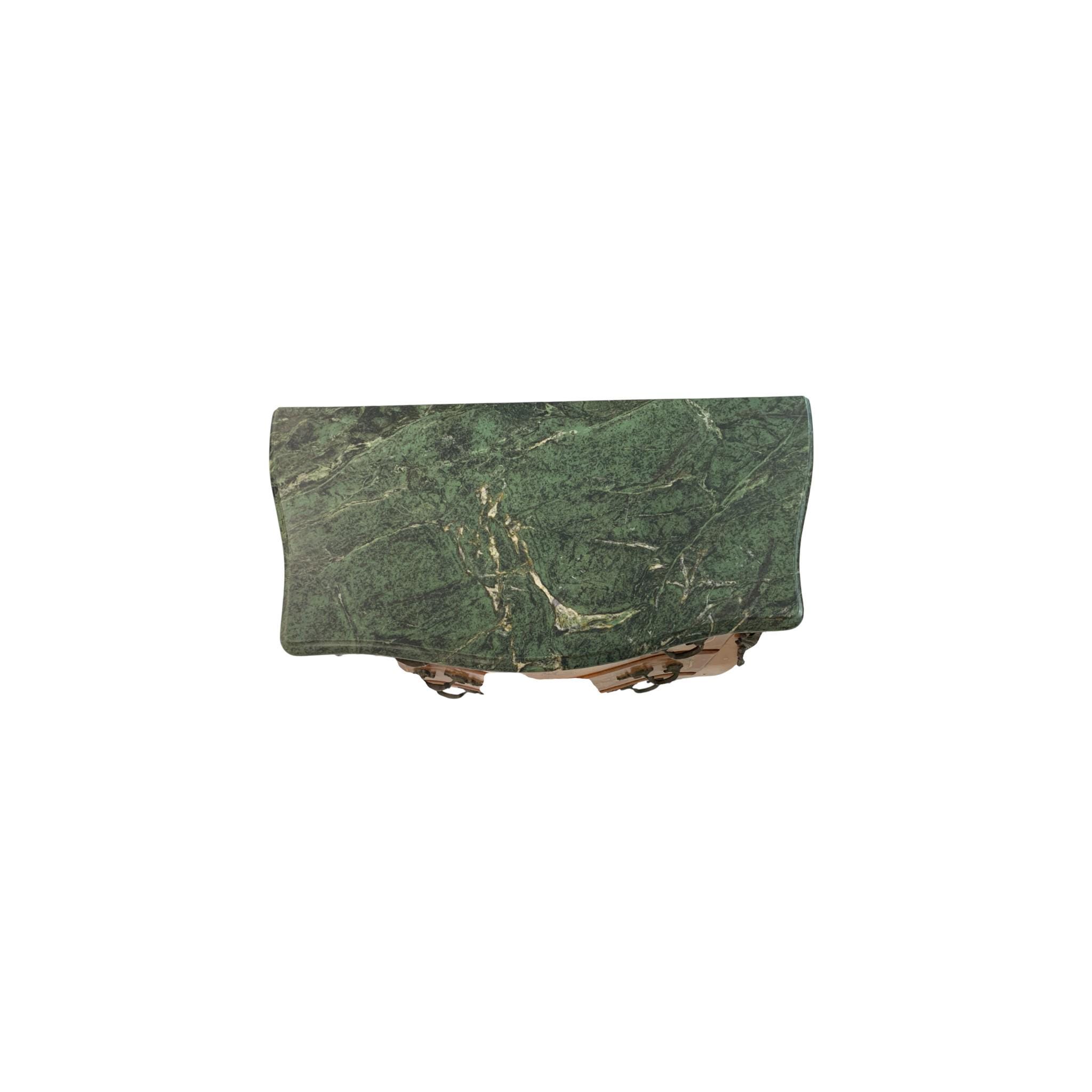 Finished in luxurious Rocco taste, having a shapely bombe (bombay) form case fitted with three spacious drawers, each with beautifully curved serpentine shaped drawer front adorned in sophisticatled contrasting marquetry inlays framed by intricate cross-band inlays, affixed with brass fiolate scroll pulls; flanked by ornate brass ormolu mounts, exuberant scrolling foliate floral marquetry sides, gracefully rising on French bracket feet terminating in ornate sabots; topped with the original fitted verde antico green white veined marble top.