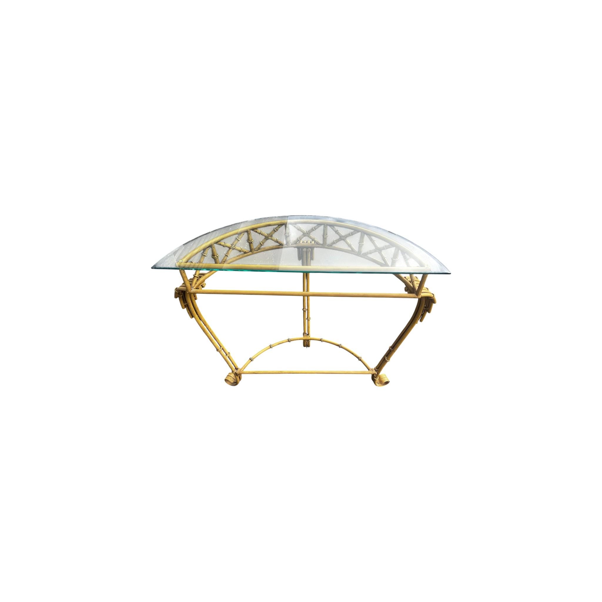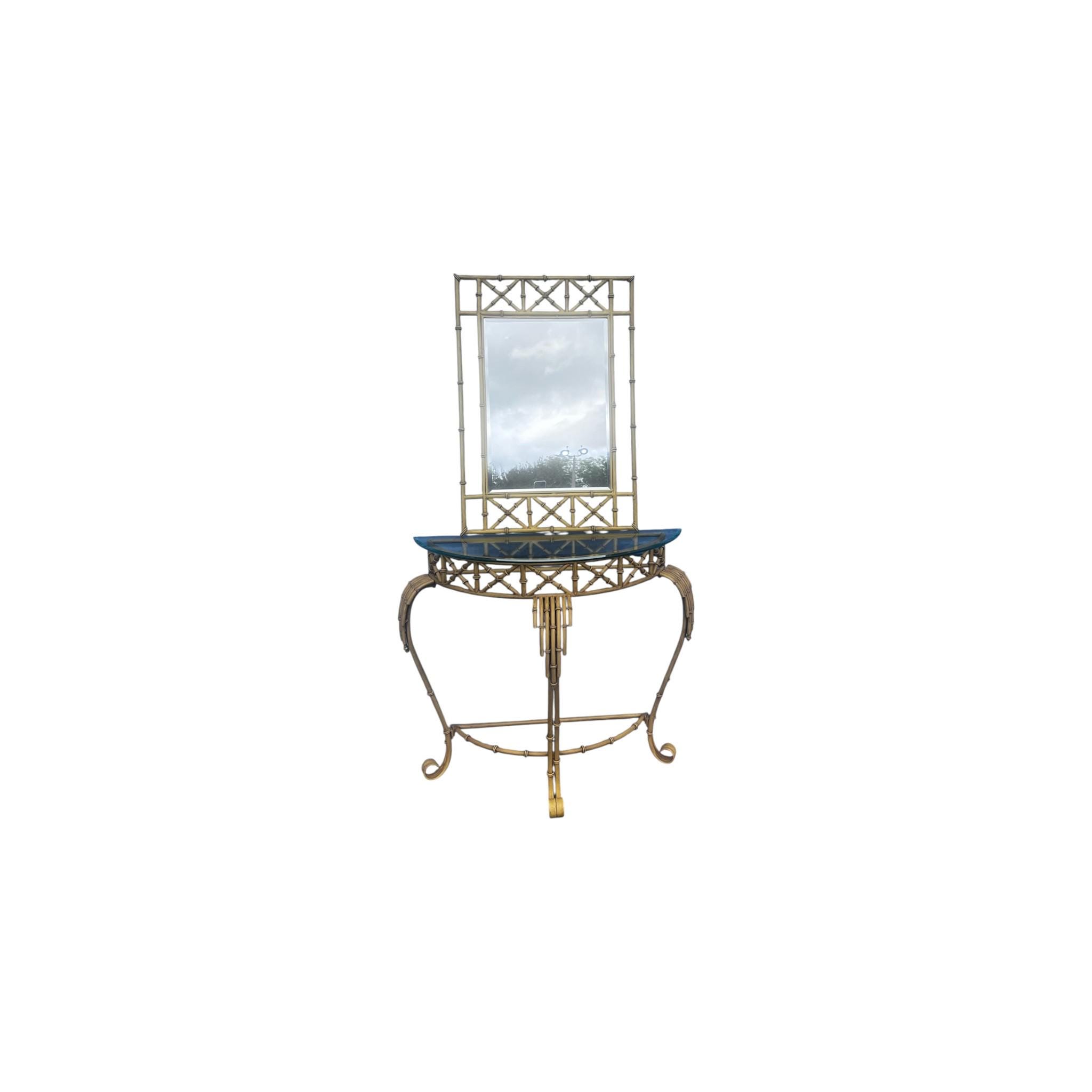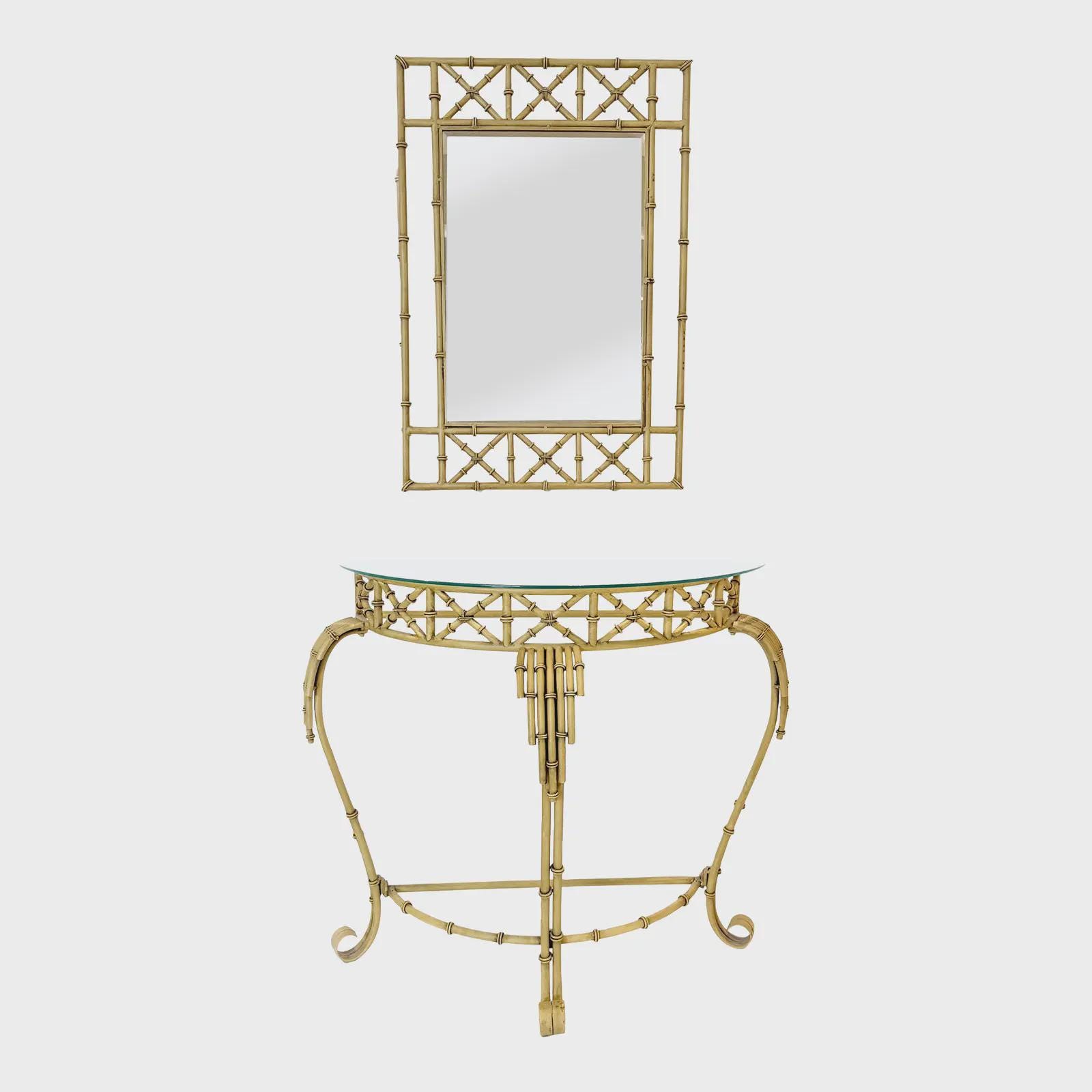 Transform your space with this stunning vintage Hollywood Regency faux bamboo demilune console table and matching mirror. This eye-catching set embodies the luxurious and playful style of the era, making it perfect for adding a touch of Palm Beach elegance or Chinoiserie chic to your home. The metal base has a matte pistachio tan finish and a patina resembling natural bamboo.