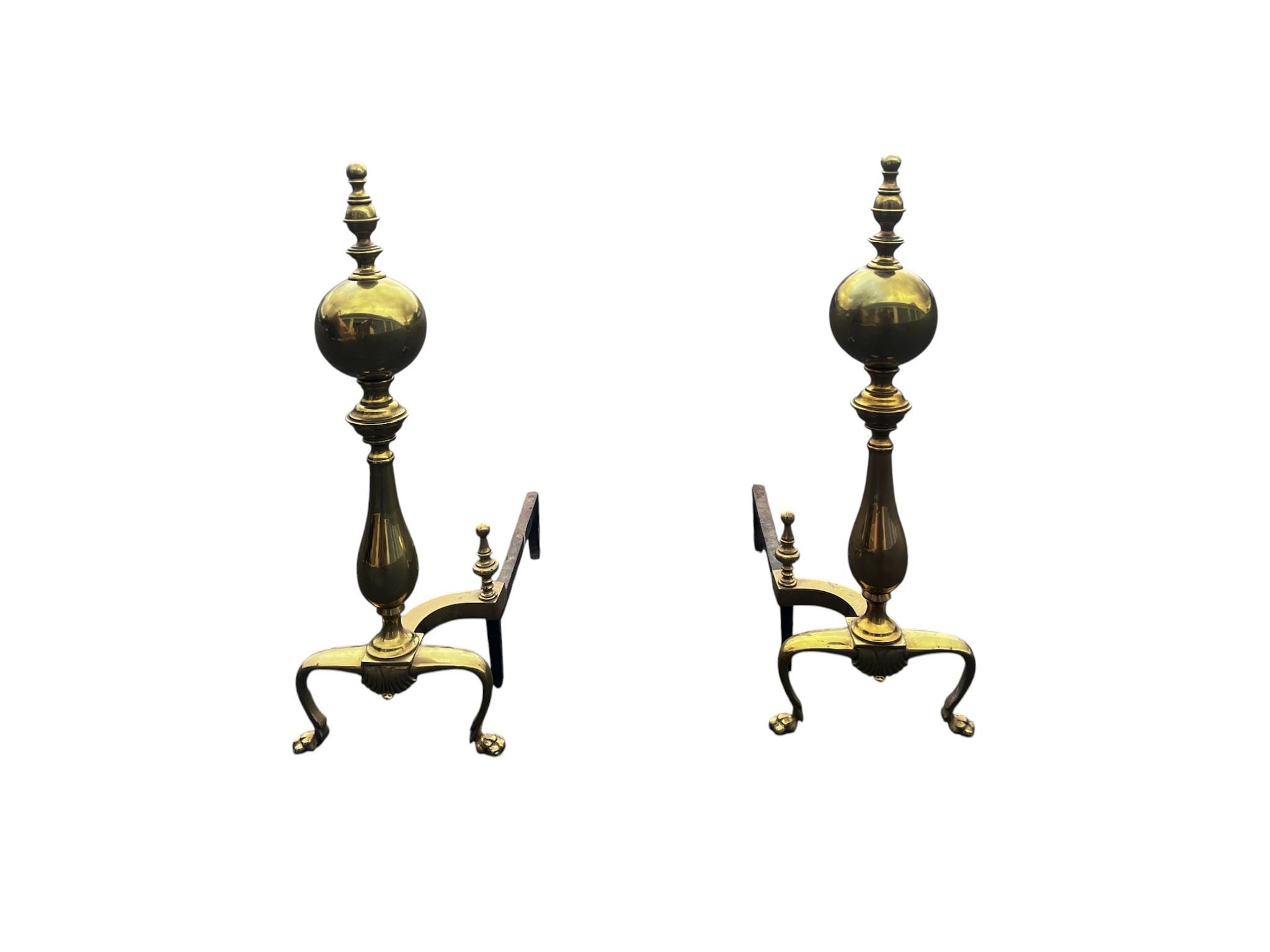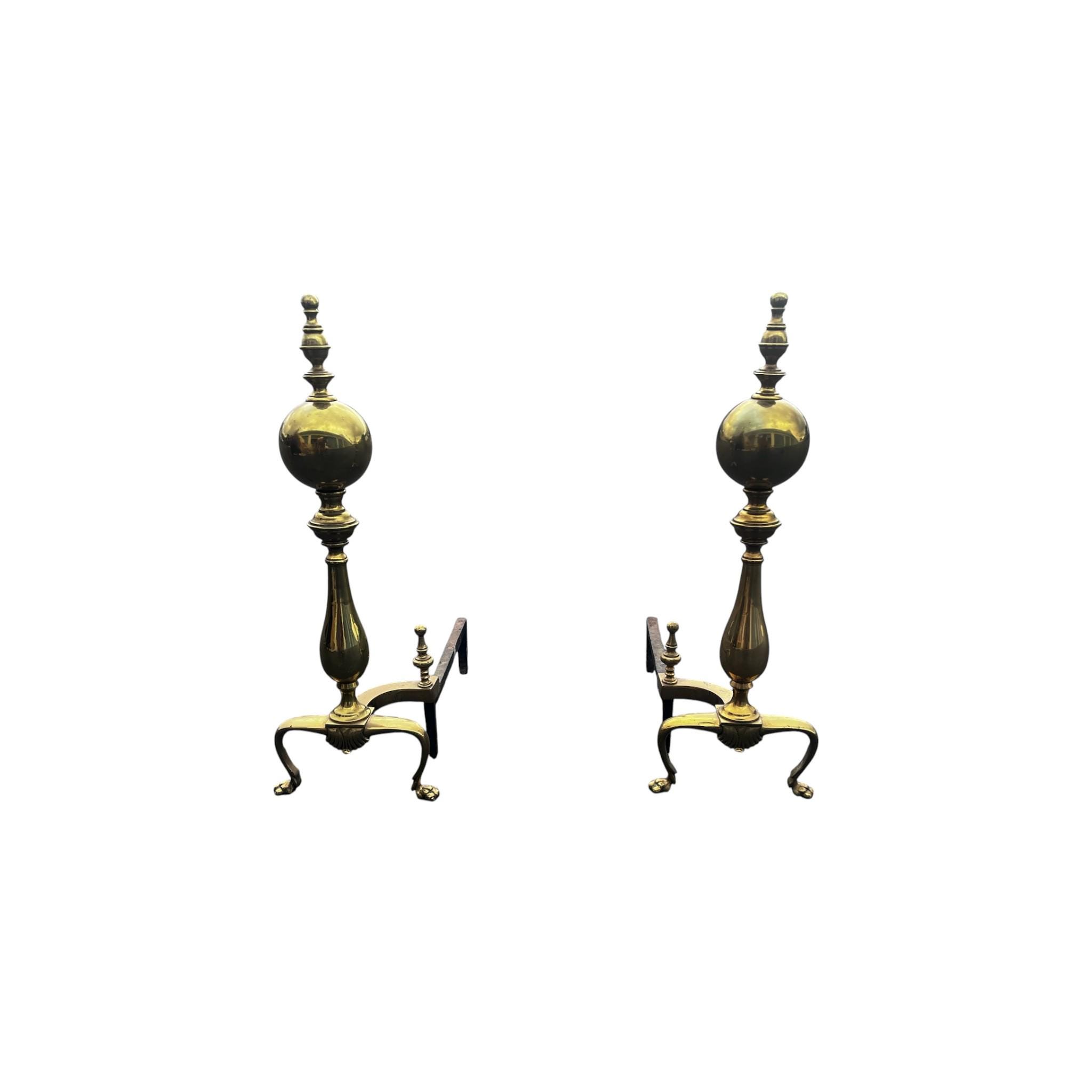 The product is a pair of vintage Chippendale style cannonball brass fireplace andirons, finished in a luxurious gold color. Made of brass, these andirons embody a classic and elegant design that adds a touch of vintage charm to any fireplace. Perfect for those looking to enhance the aesthetic of their home with a touch of historical sophistication, these andirons are a unique and stylish addition to any fireplace or mantel.