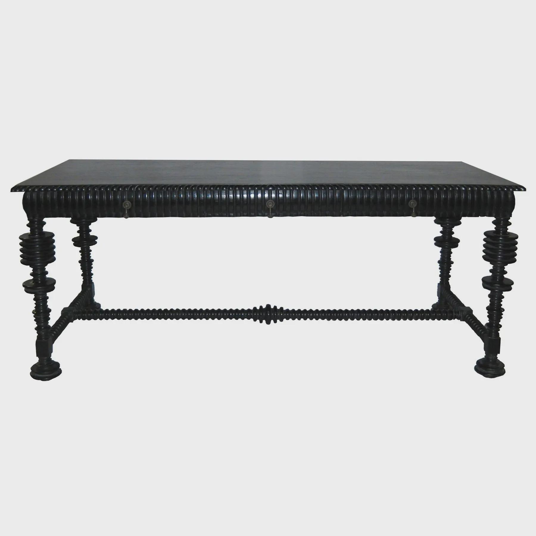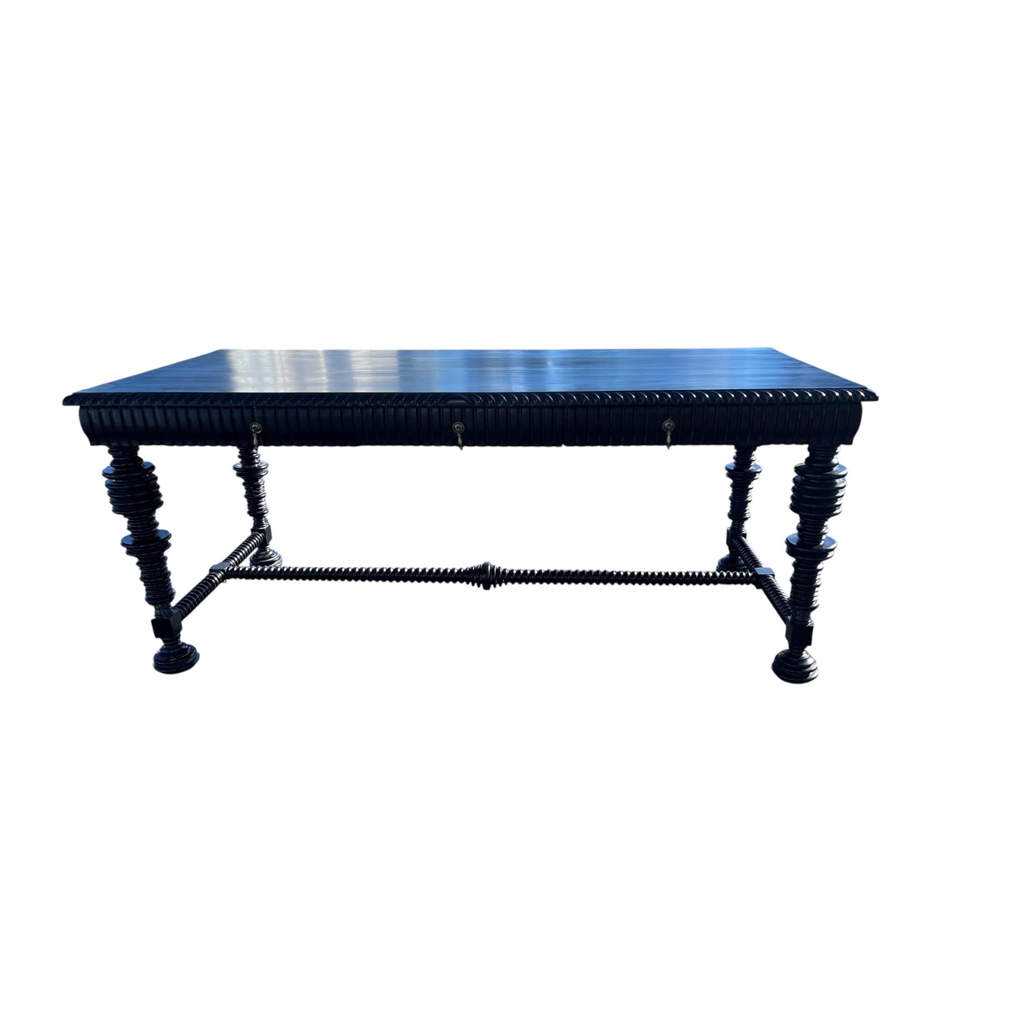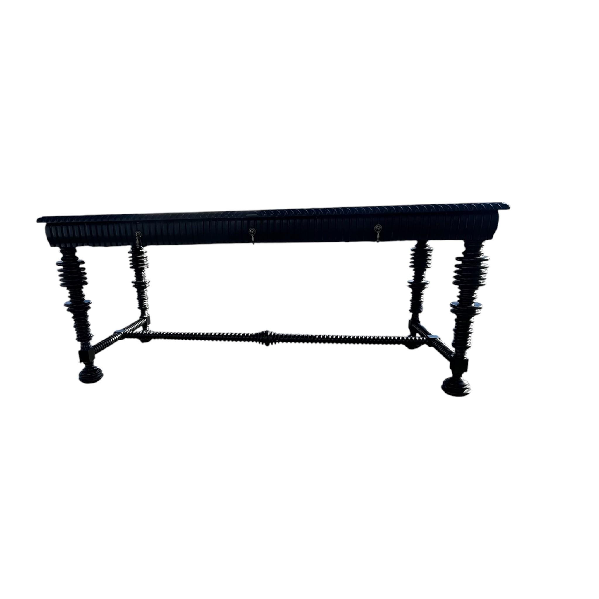 Shipping costs may vary. For long-distance shipping, please message me your zip code for an accurate shipping quote. Free local pickup is available in Bonita Springs, Fl 34134.A sophisticated design mixing the modern spool legs and base with carved apron and top. Three drawers in apron with iron drop pull hardware on one side. Made of mahogany wood in ebony finish which lends a more contemporary feel. By Noir furniture.