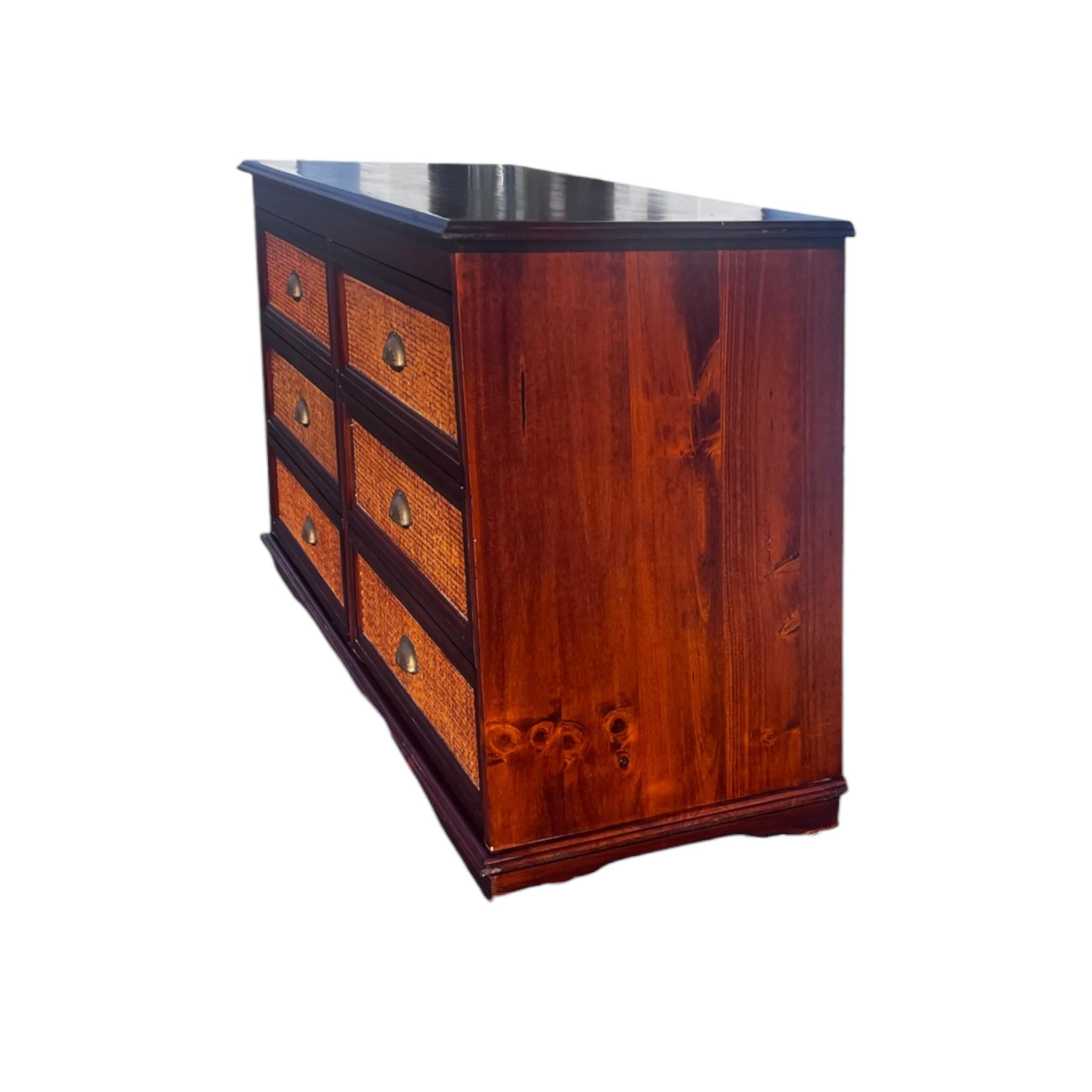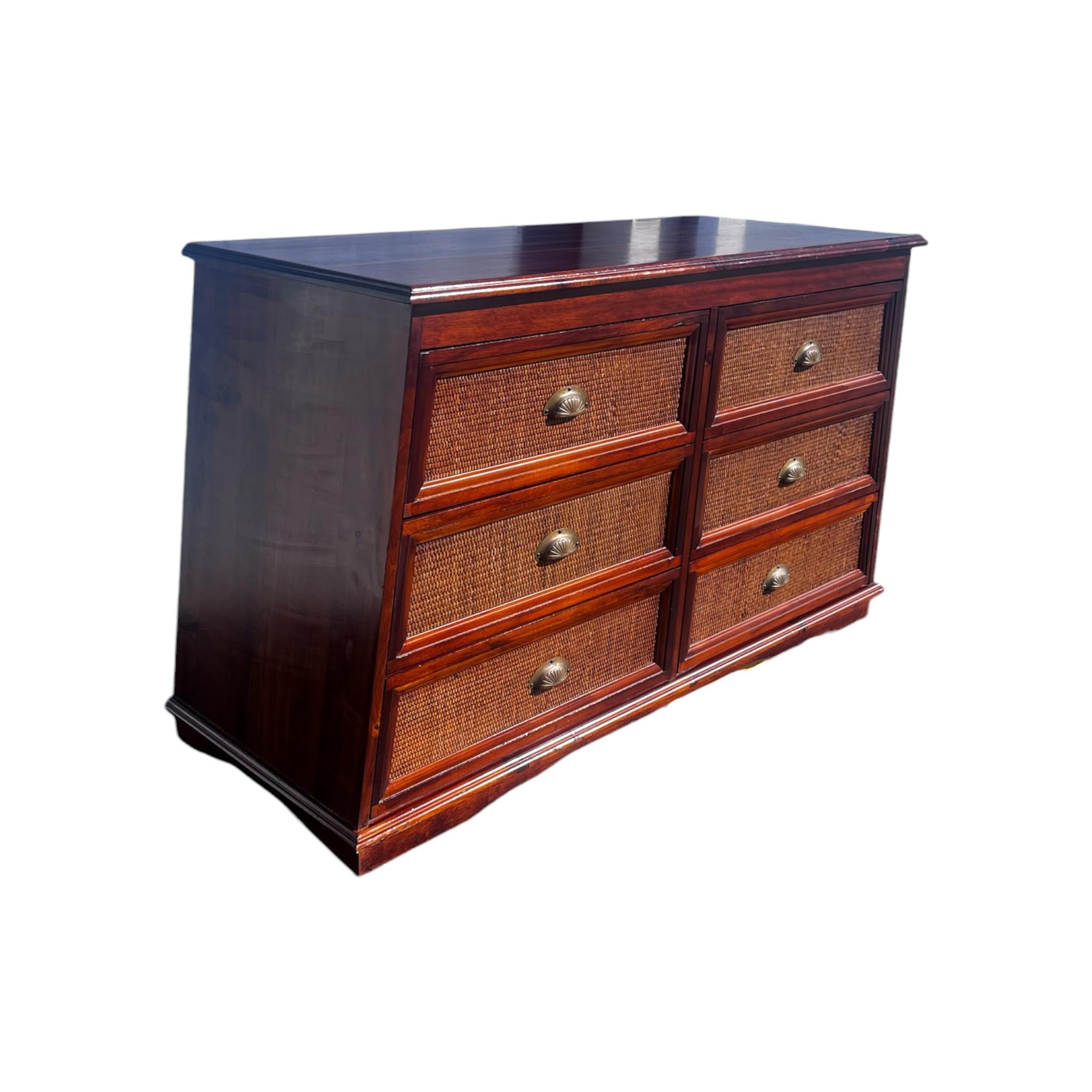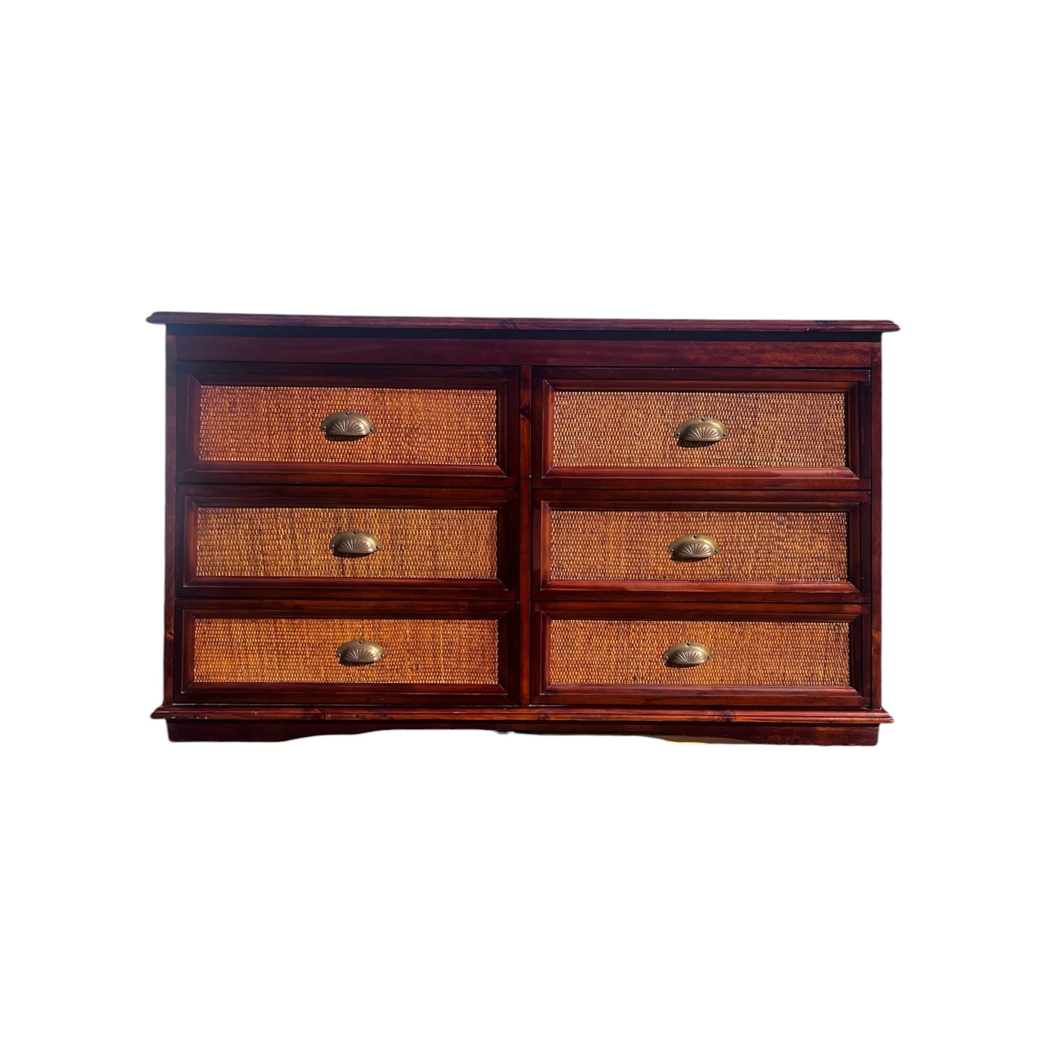 The Pier 1 imports Pyramid collection wicker and wood 6 drawer dresser is a stylish and functional piece of furniture for a bedroom. With a metal handle finish and a rectangular shape, this dresser stands out with its brown color and original design. The dresser is 21 inches long, 33 inches high, and 57 inches wide, providing ample storage space with its six drawers. It is a free-standing unit that requires no additional parts for assembly, making it easy to bring into any room. Whether you are looking to update your bedroom or add a touch of elegance to your home, this dresser from Pier 1 imports is a great choice.