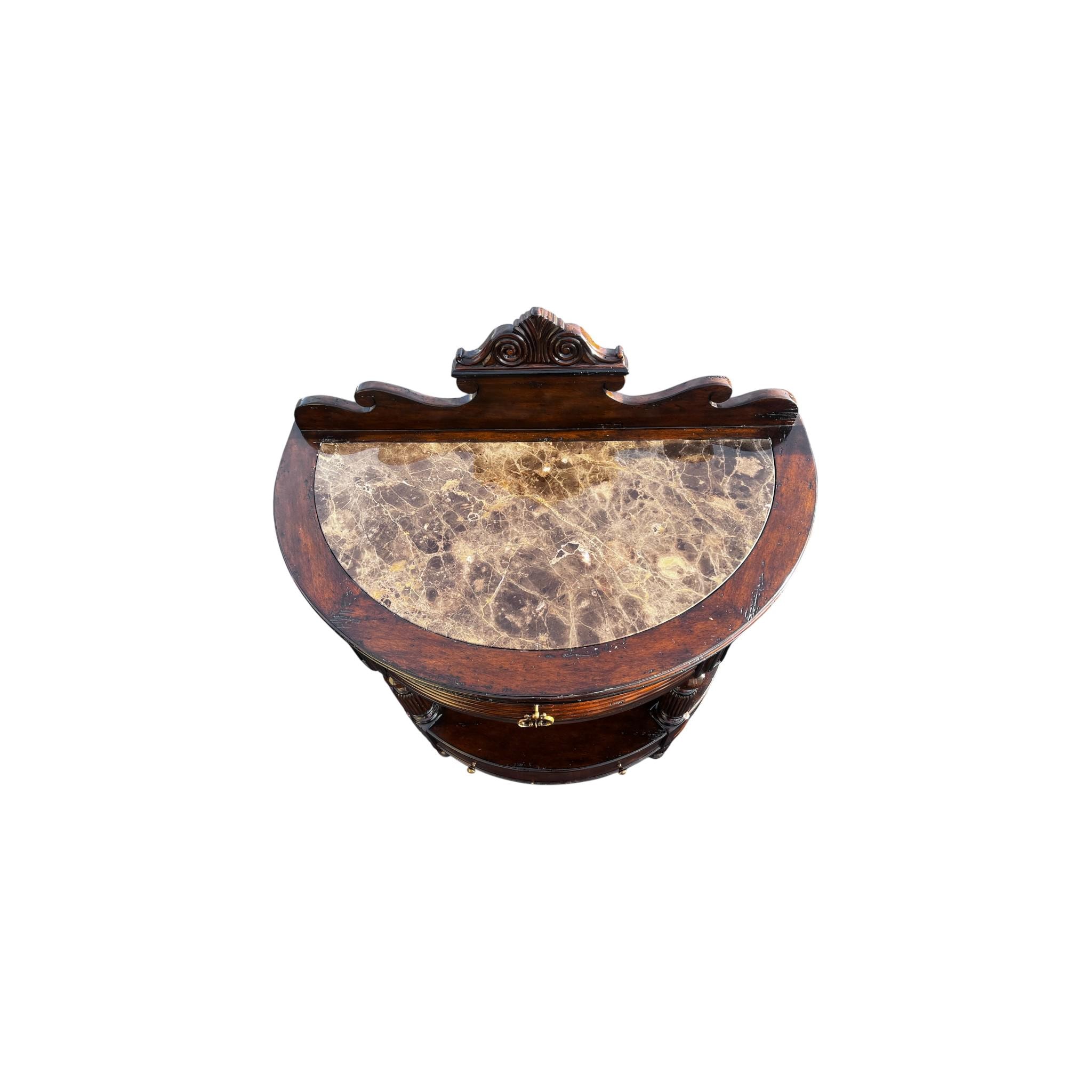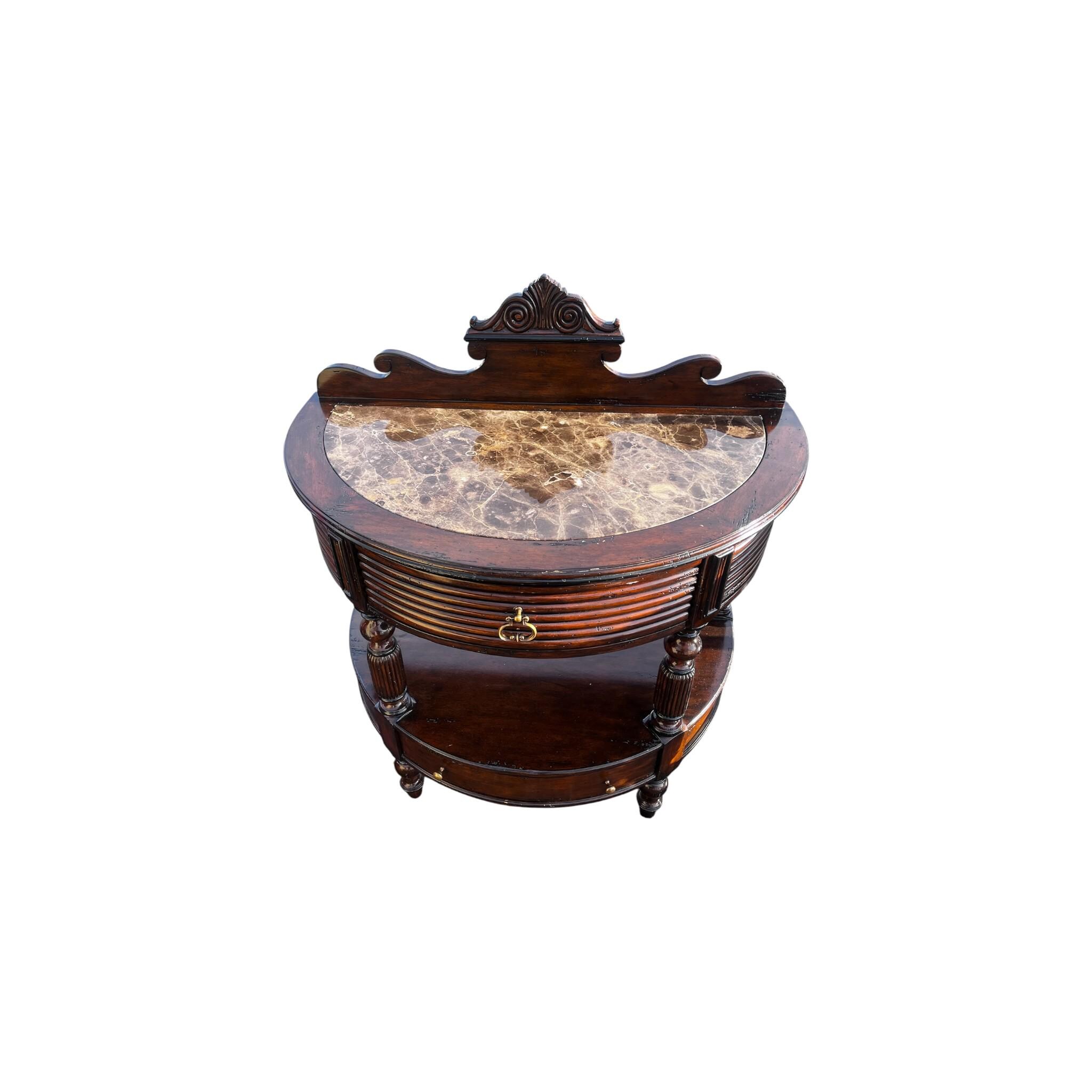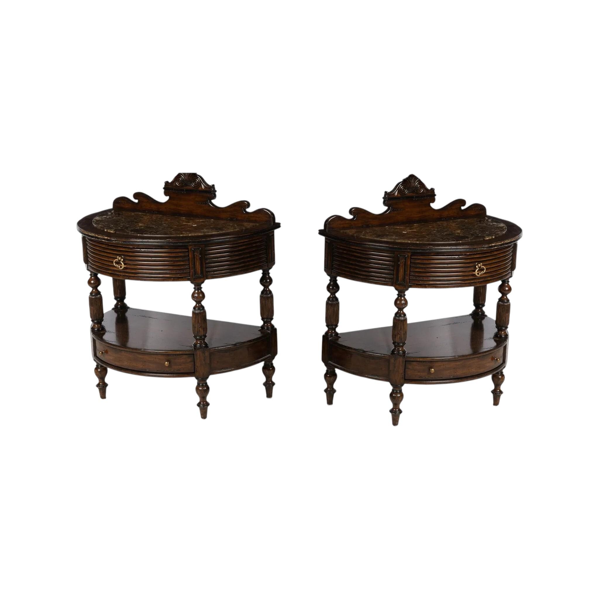 The product is a pair of Marge Carson Demilune Side Tables with marble tops. These antique side tables are fully assembled and feature a unique demilune shape, having marble inlay, a scrolled back crest, both with two tiers and a single top drawer, a bottom tier having a single drawer, both supported on turned feet, single drawer demilune marked to interior , making them perfect for indoor use. With a tabletop material of marble and a brand by Marge Carson, these tables were manufactured during the post-1950 period and feature two drawers for added storage. The dimensions of the tables are 21 inches in length, 42.5 inches in height, and 38 inches in width, making them a stylish and functional addition to any home.