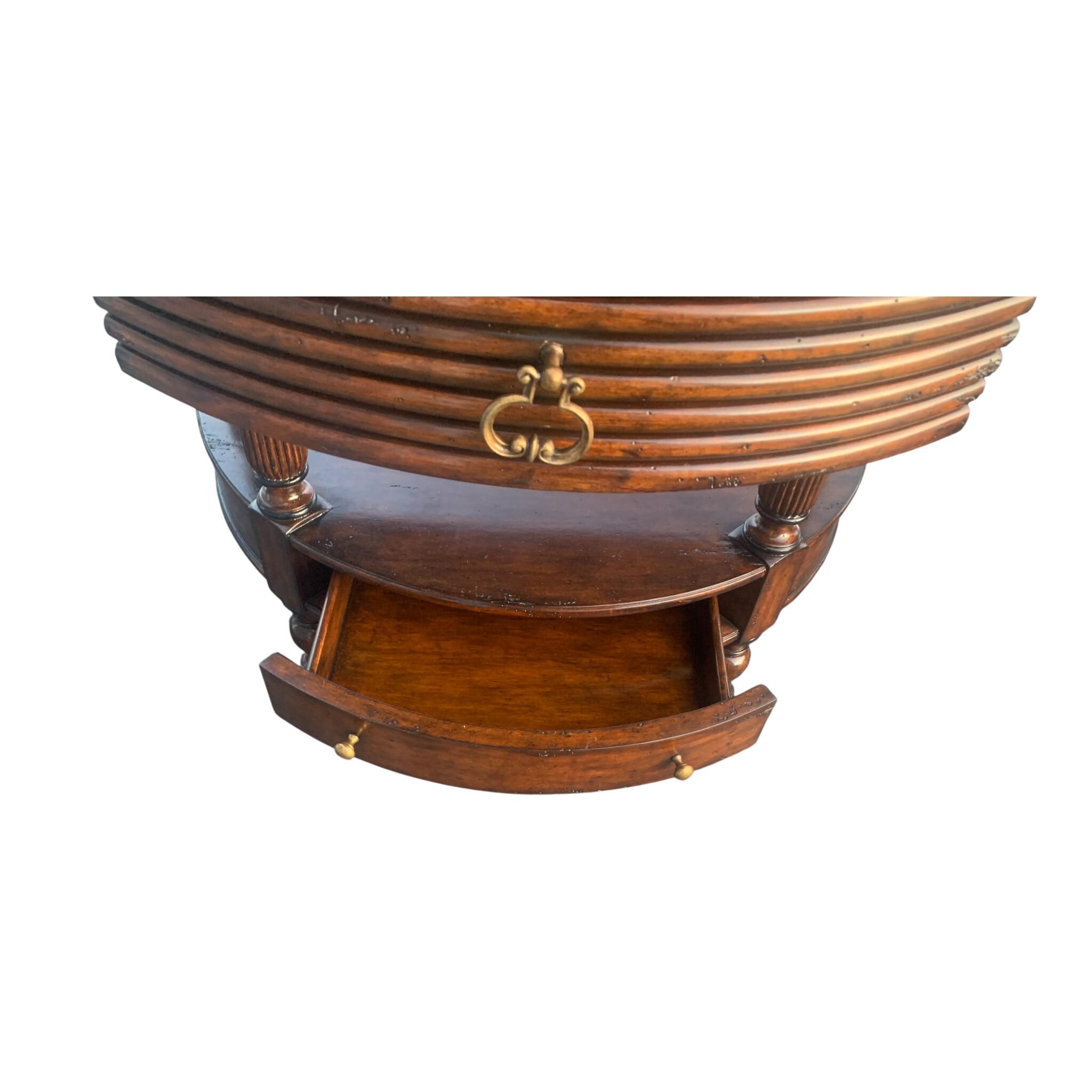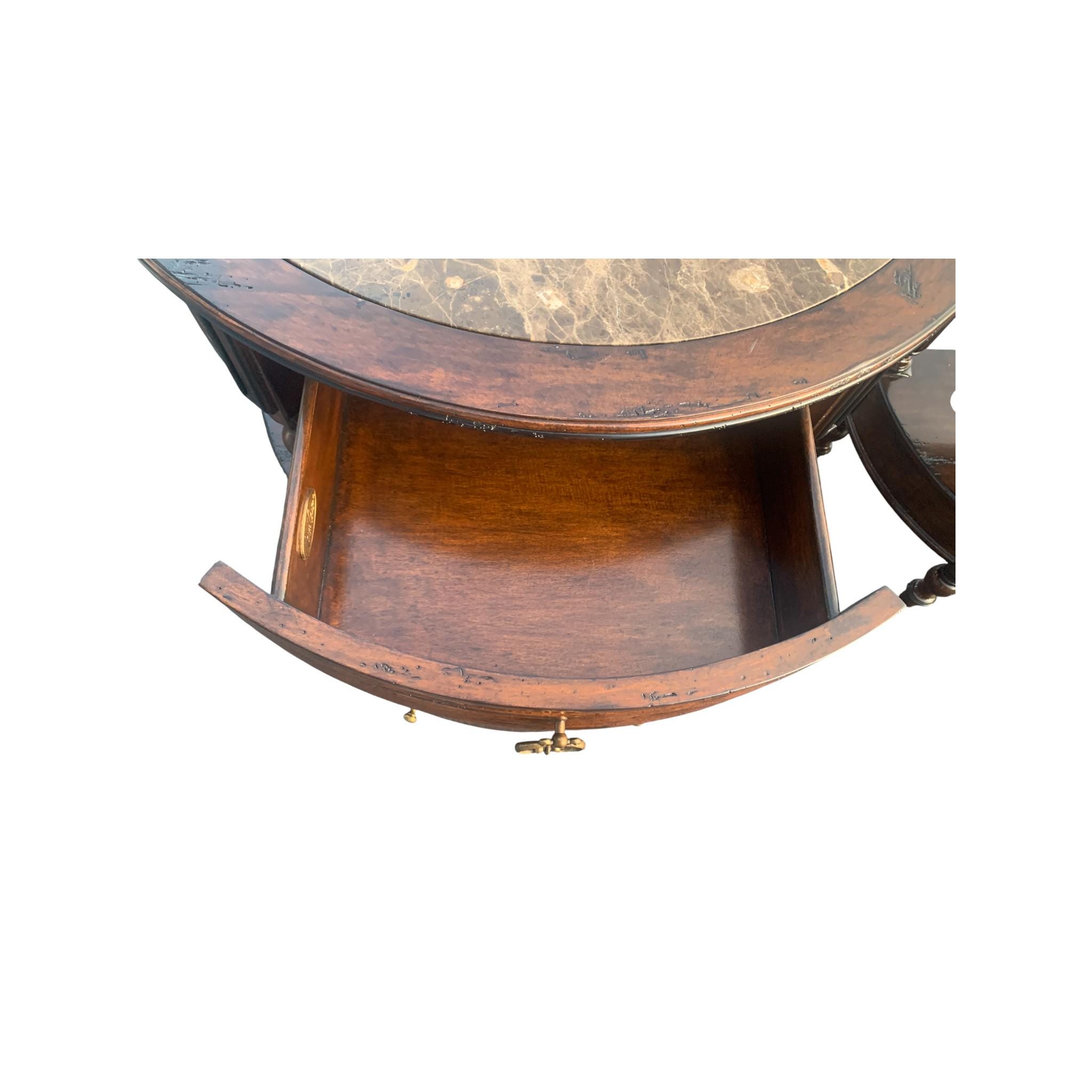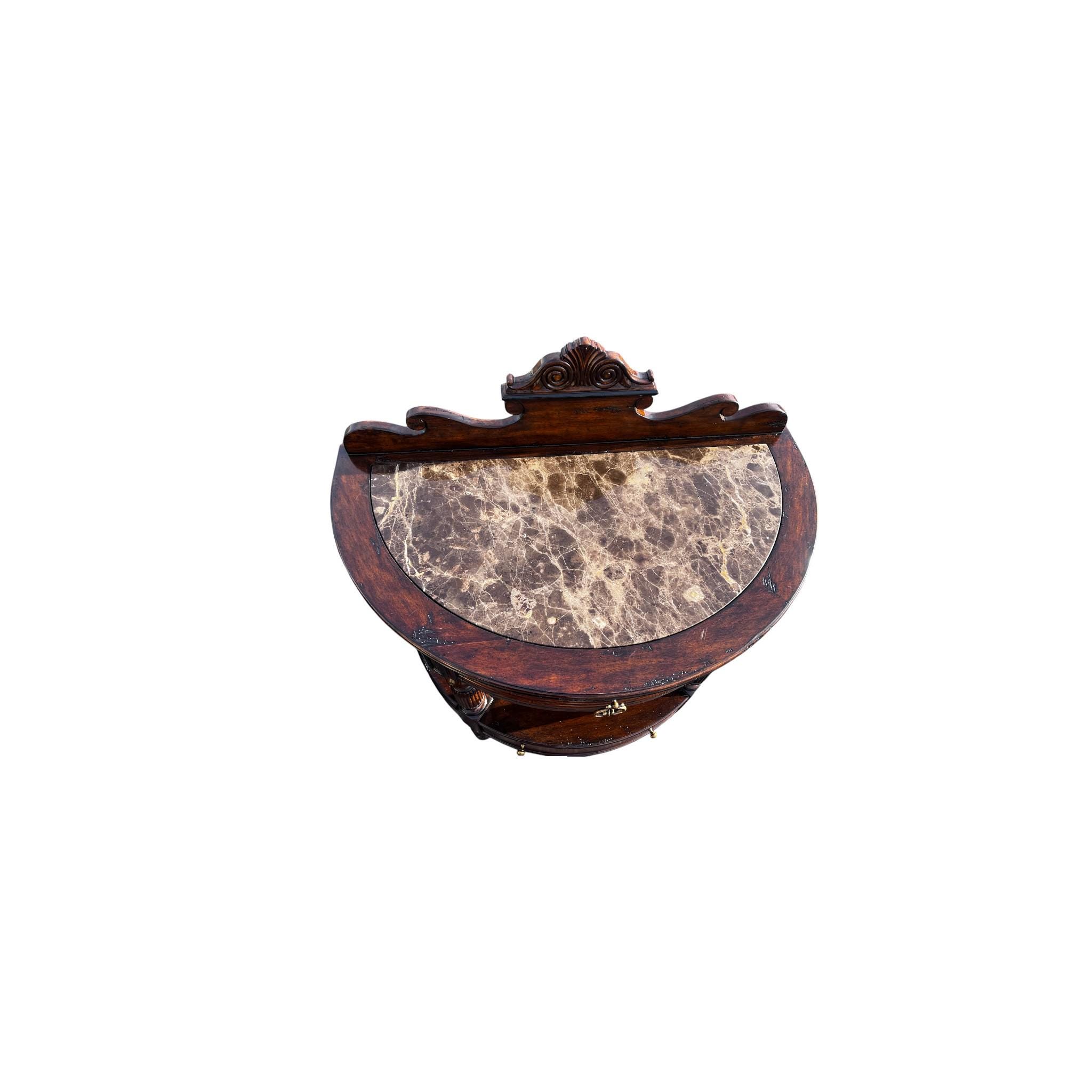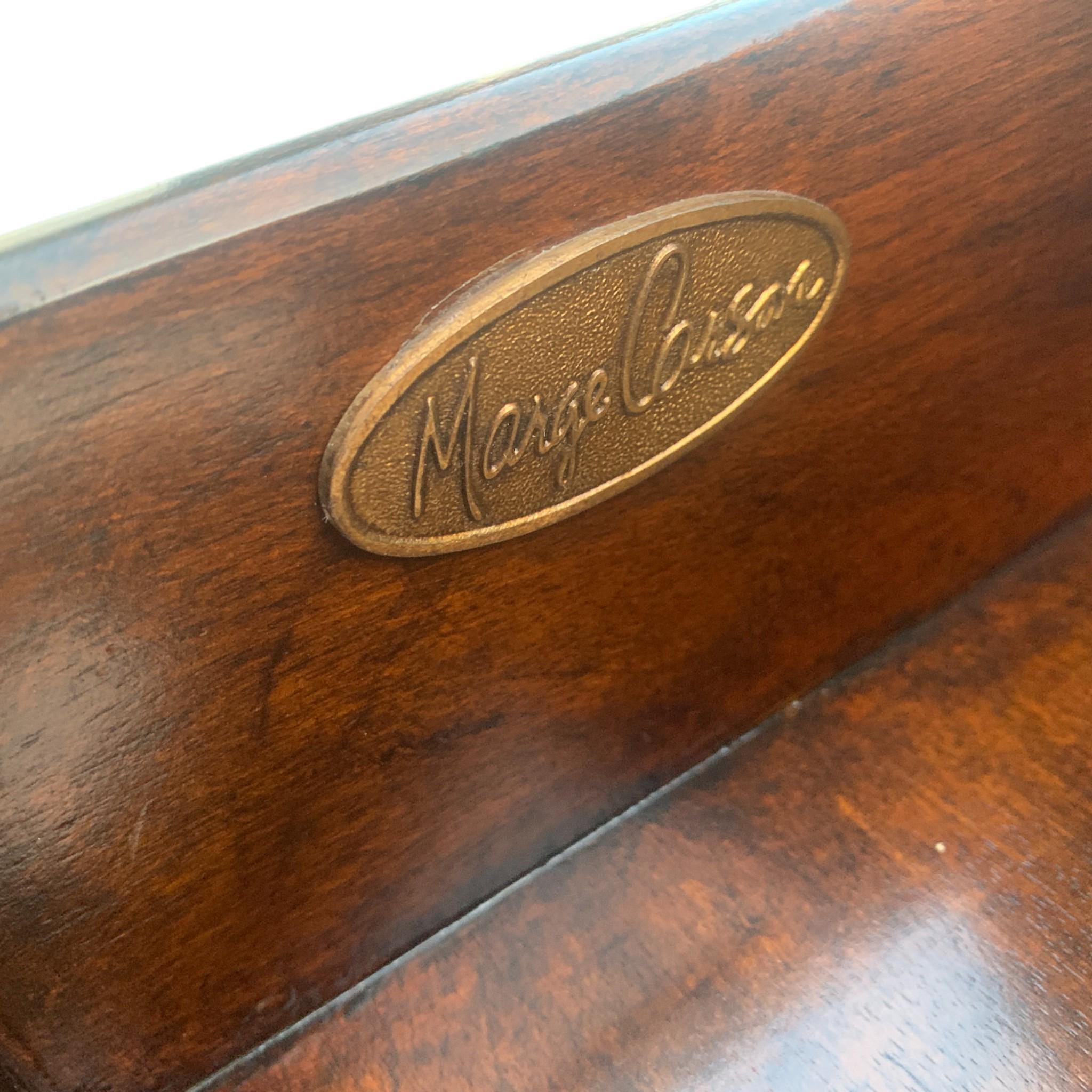 The product is a pair of Marge Carson Demilune Side Tables with marble tops. These antique side tables are fully assembled and feature a unique demilune shape, having marble inlay, a scrolled back crest, both with two tiers and a single top drawer, a bottom tier having a single drawer, both supported on turned feet, single drawer demilune marked to interior , making them perfect for indoor use. With a tabletop material of marble and a brand by Marge Carson, these tables were manufactured during the post-1950 period and feature two drawers for added storage. The dimensions of the tables are 21 inches in length, 42.5 inches in height, and 38 inches in width, making them a stylish and functional addition to any home.