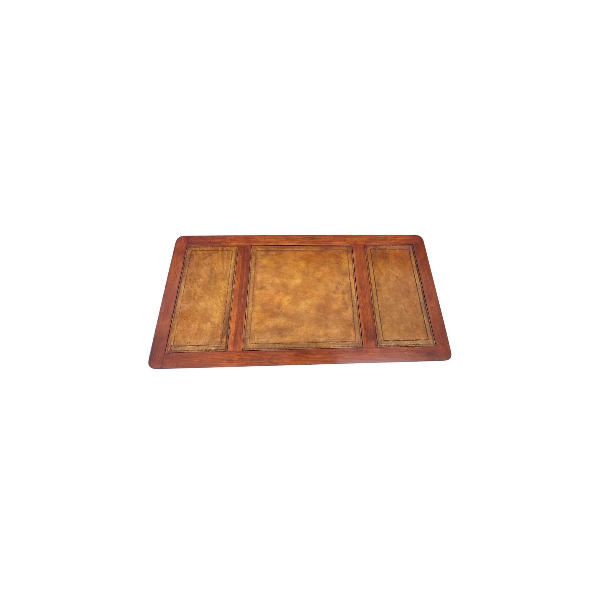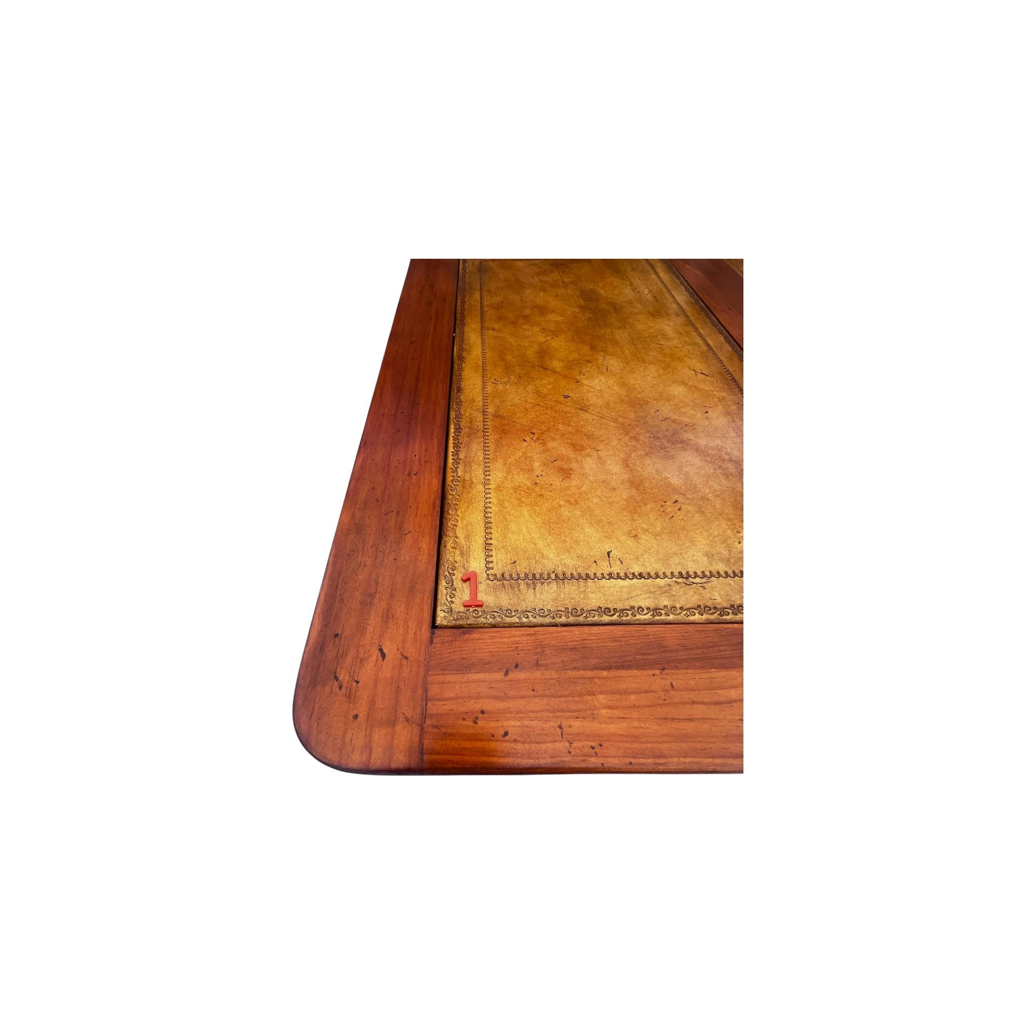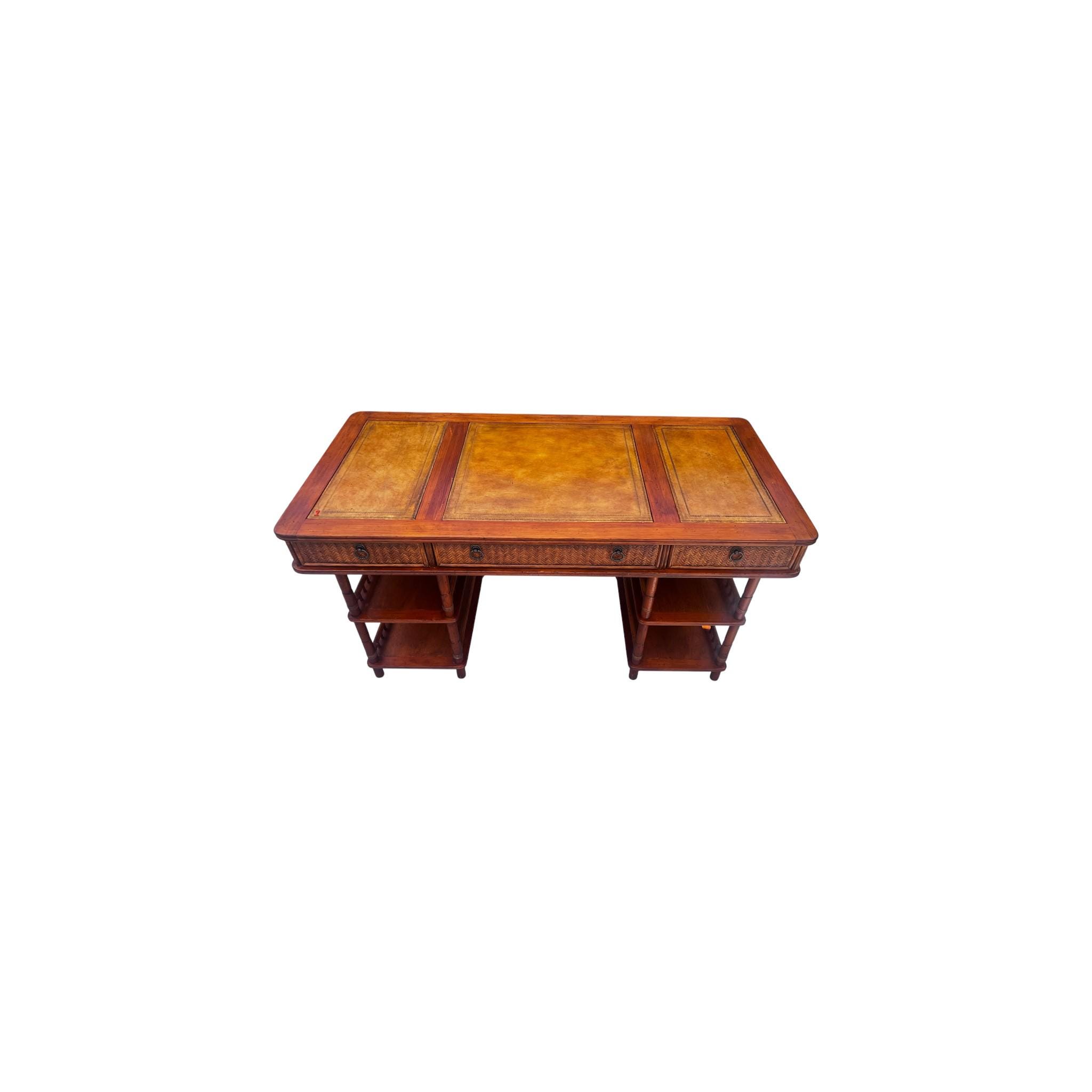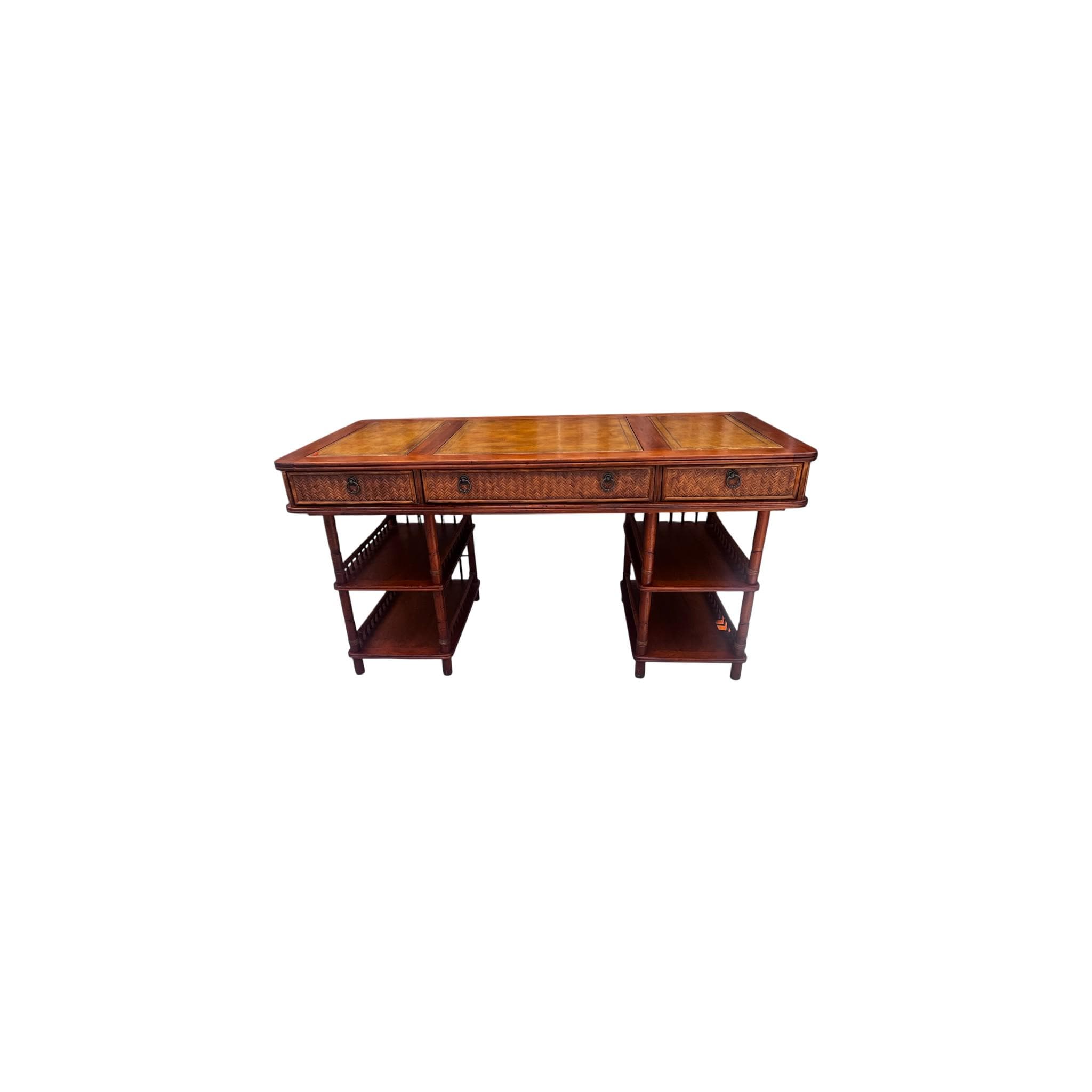 This Tommy Bahama-style British Colonial Bamboo and Rattan Desk is a stylish and unique antique piece, perfect for any home or office. Made with a combination of rattan and bamboo, and featuring leather insets, this desk boasts a free-standing design with multiple drawers for added functionality. With its mixed brown color and elegant design, this desk adds a touch of sophistication to any space.