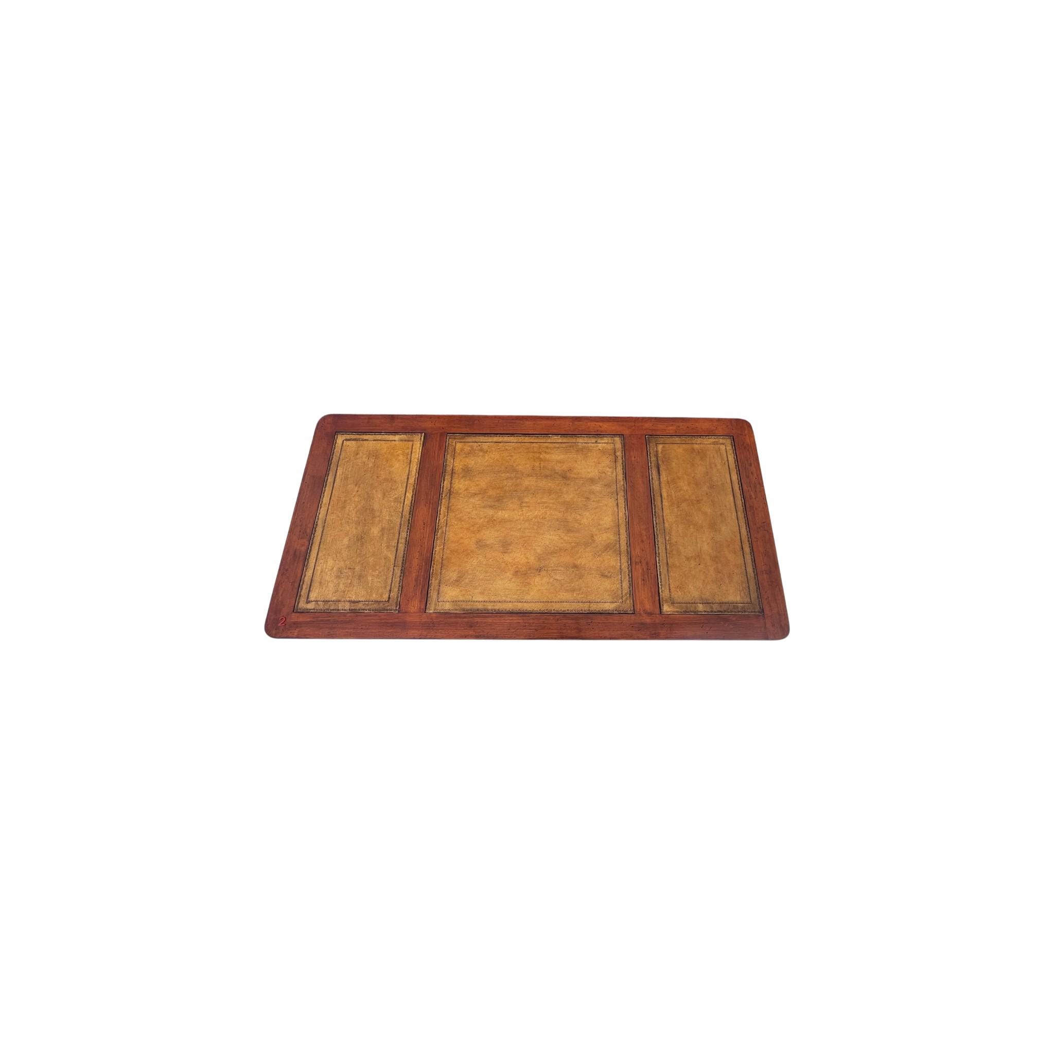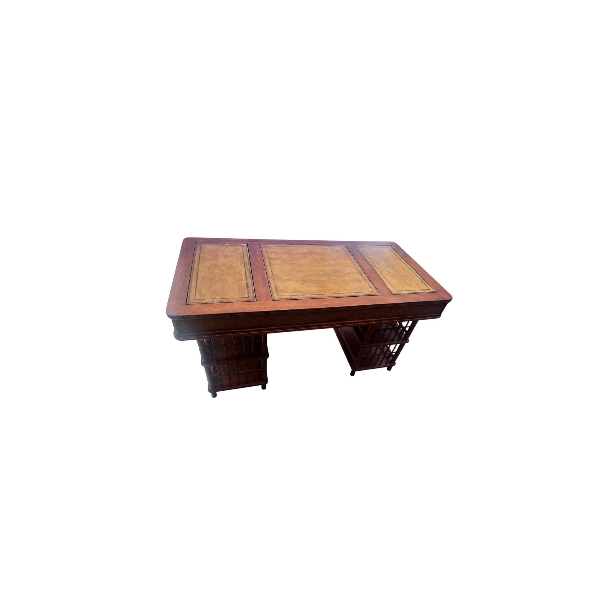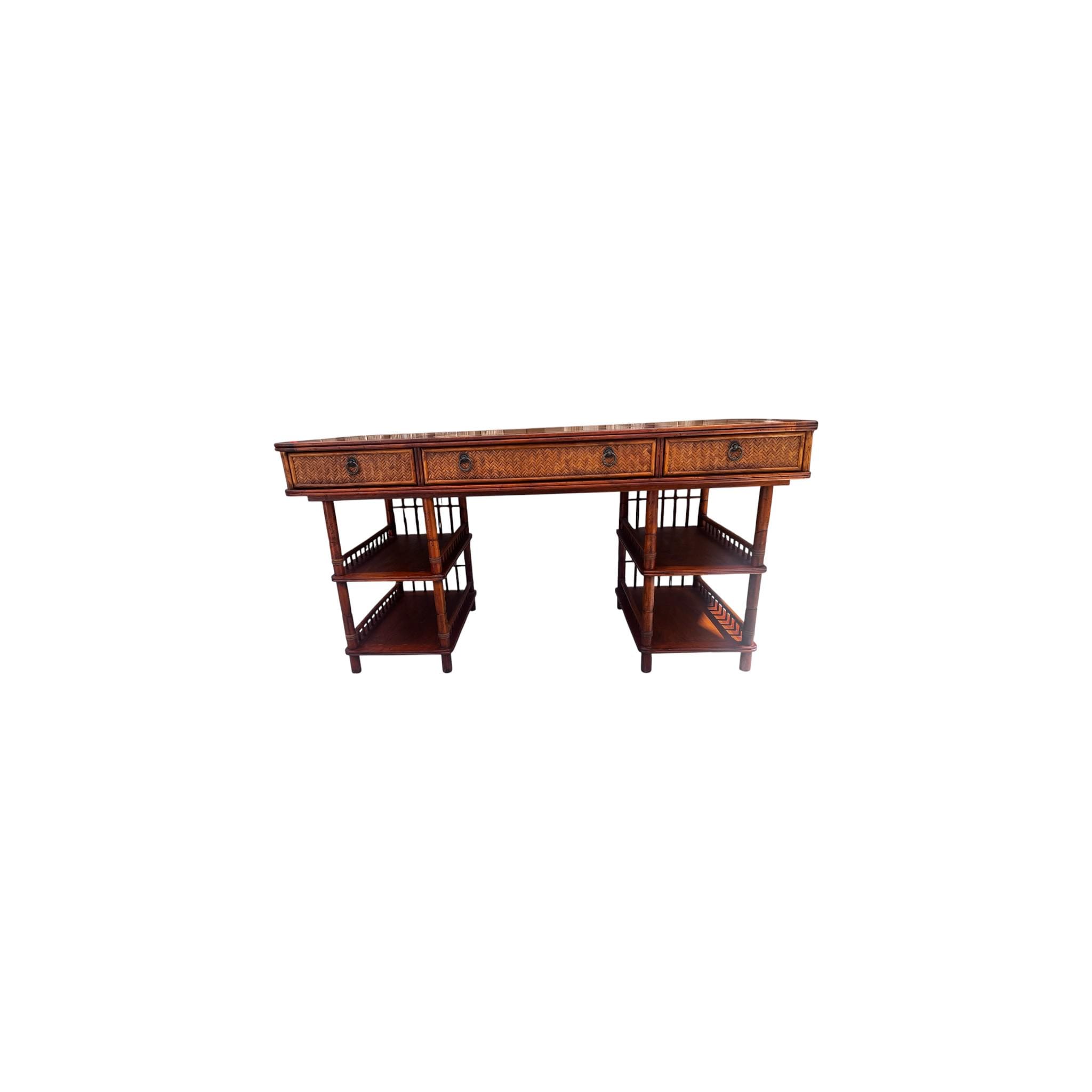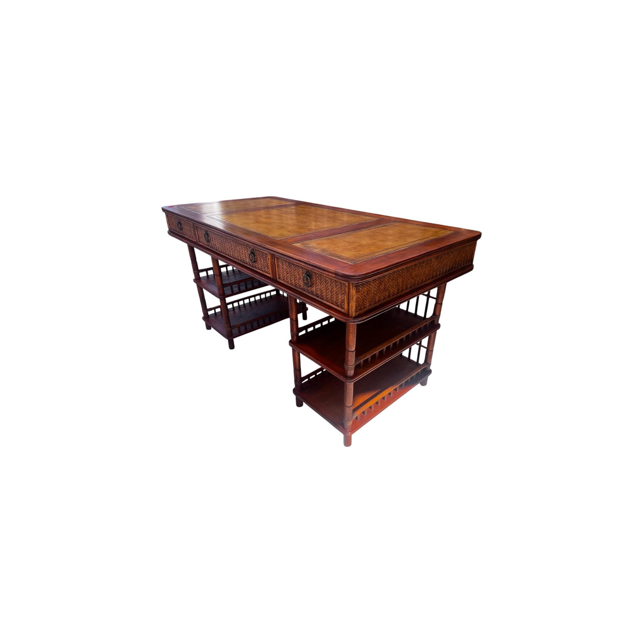 This Tommy Bahama-style British Colonial Bamboo and Rattan Desk is a stylish and unique antique piece, perfect for any home or office. Made with a combination of rattan and bamboo, and featuring leather insets, this desk boasts a free-standing design with multiple drawers for added functionality. With its mixed brown color and elegant design, this desk adds a touch of sophistication to any space.