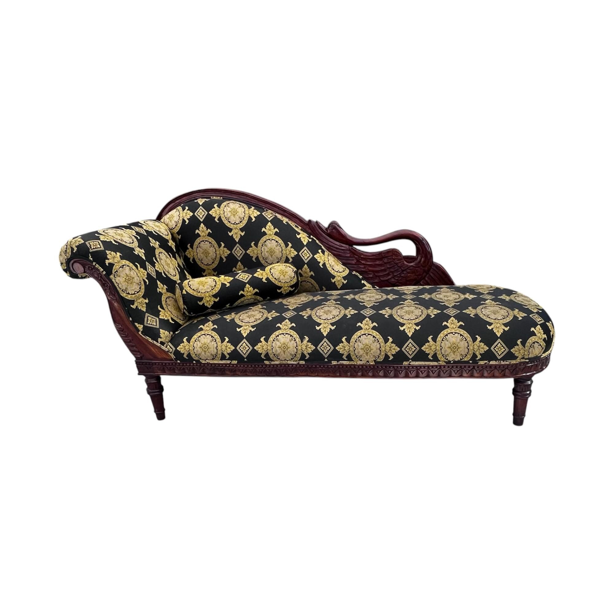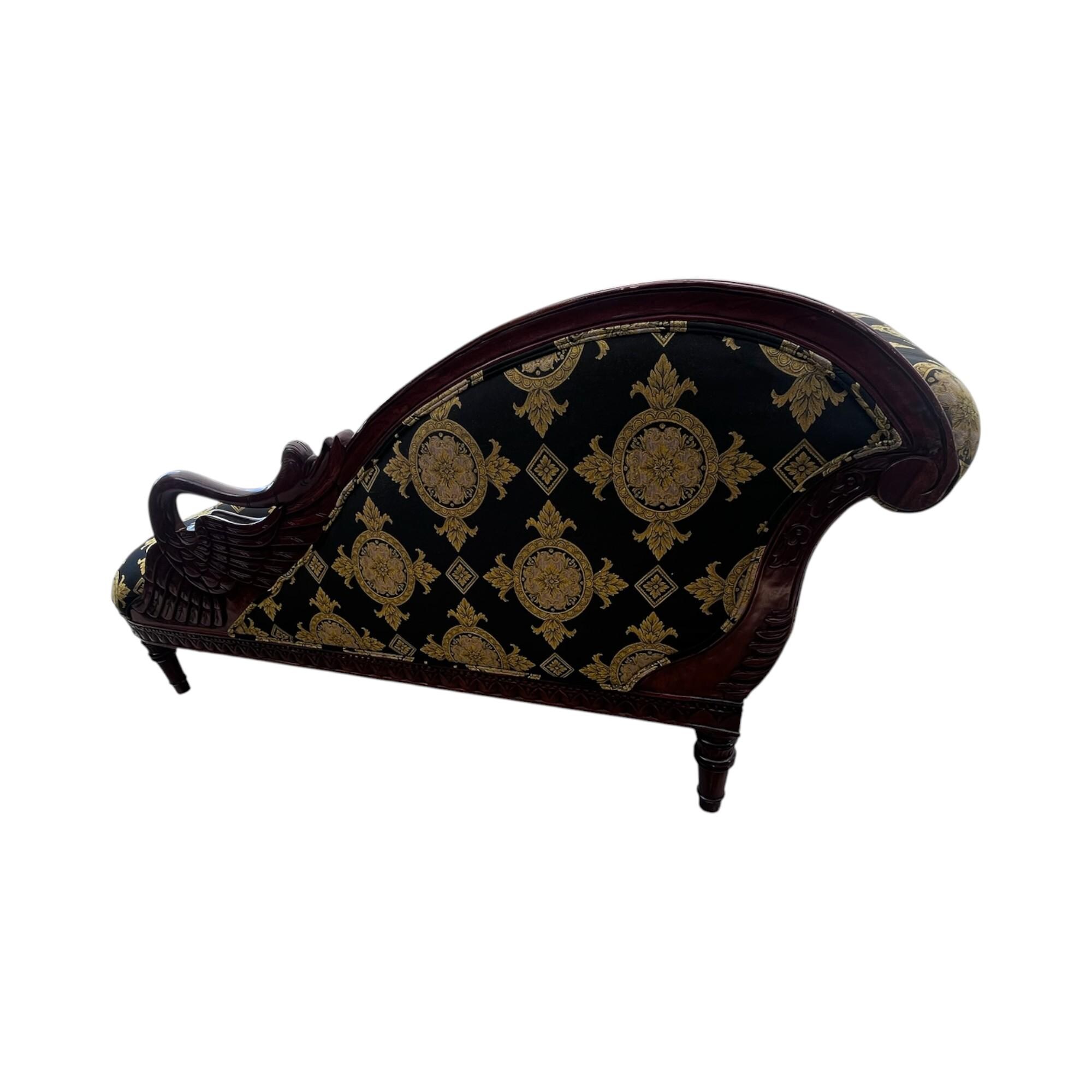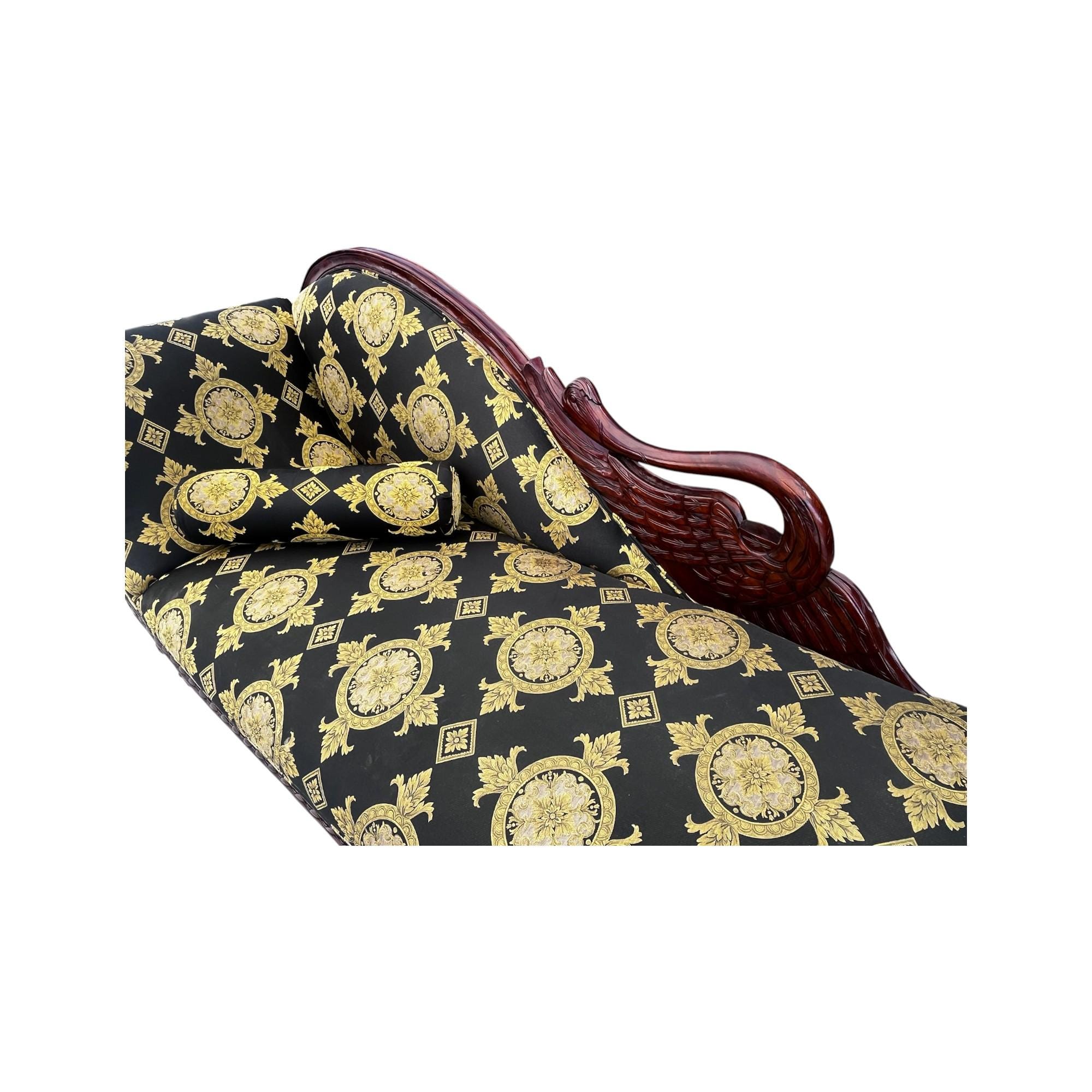 The mid-20th-century Empire Revival Swan Chaise Lounge is a stunning piece of antique furniture with intricate carved detailing. Made of wood, this fully assembled chaise lounge features a beautiful blue color and exquisite carvings that add a touch of elegance to any room. With a height of 37 inches and a length of 24 inches, this lounge is perfect for relaxing in style and comfort. The unique swan design and Empire revival style make it a standout piece for any antique collector or furniture enthusiast.