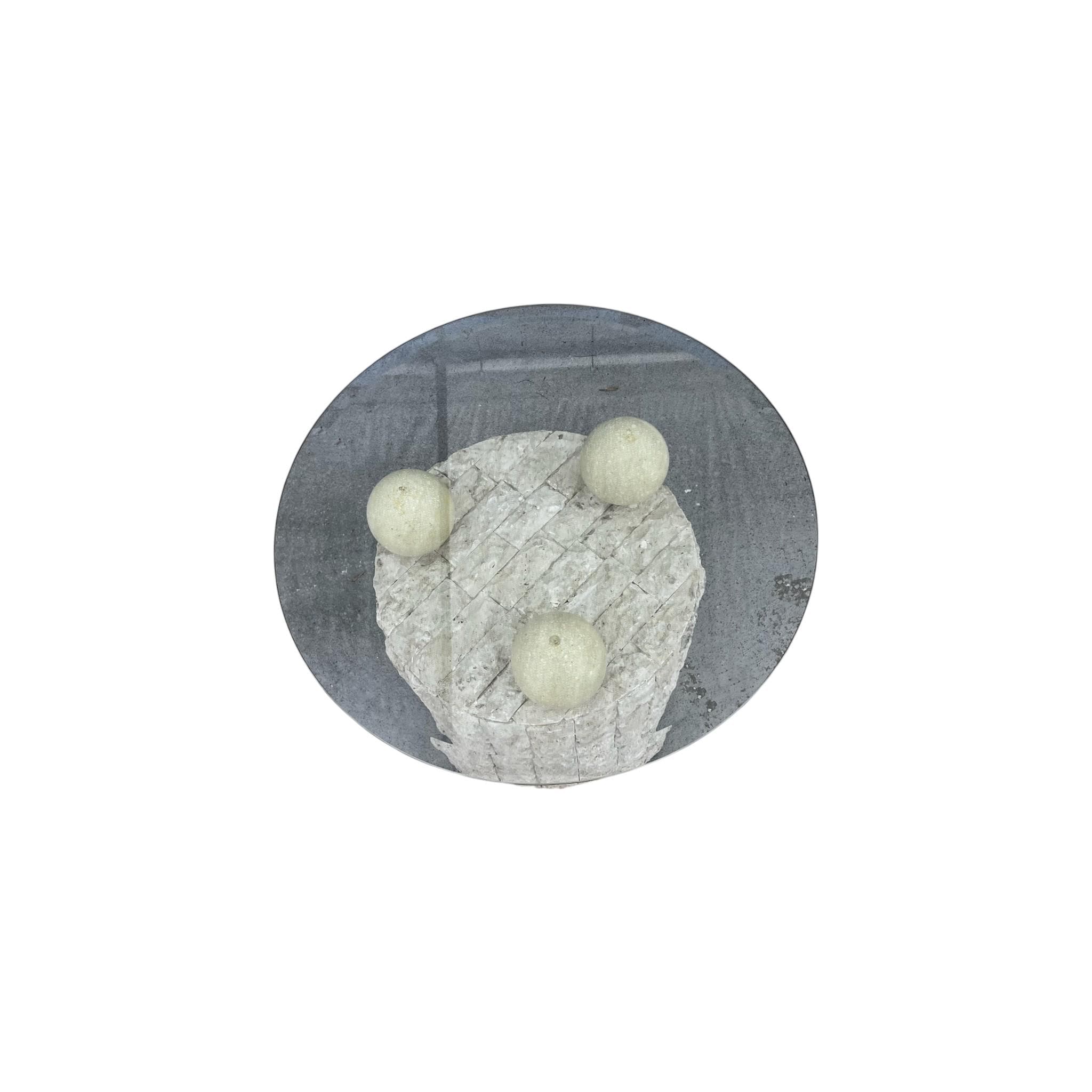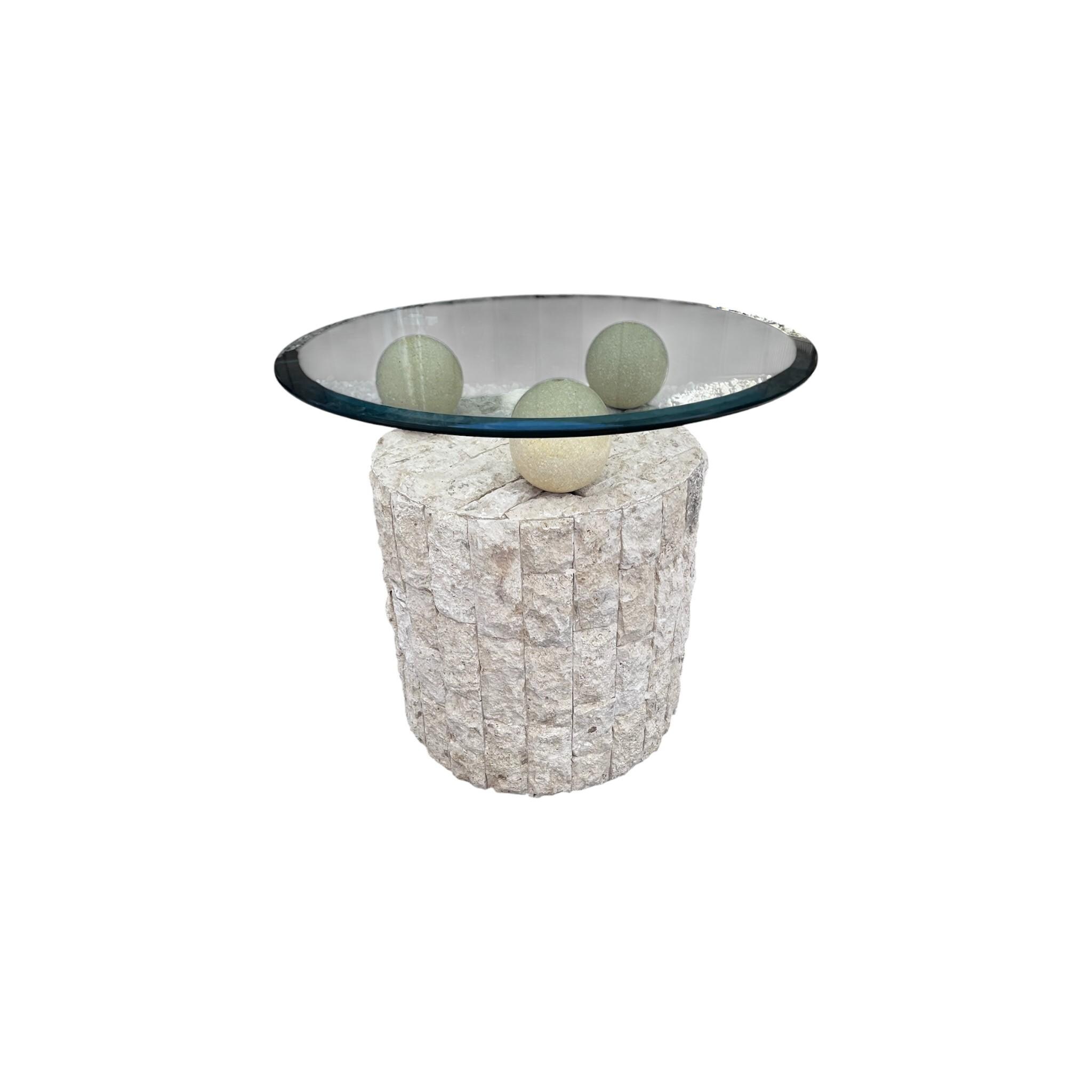 Free local pickup is available in Bonita Springs, FL Introducing our captivating tessellated Mactan stones pedestal side tables, a stunning piece designed in the style of Maitland-Smith. Mactan Stone, a unique white coral quarried in the Philippines, serves as the foundation for this modern masterpiece.