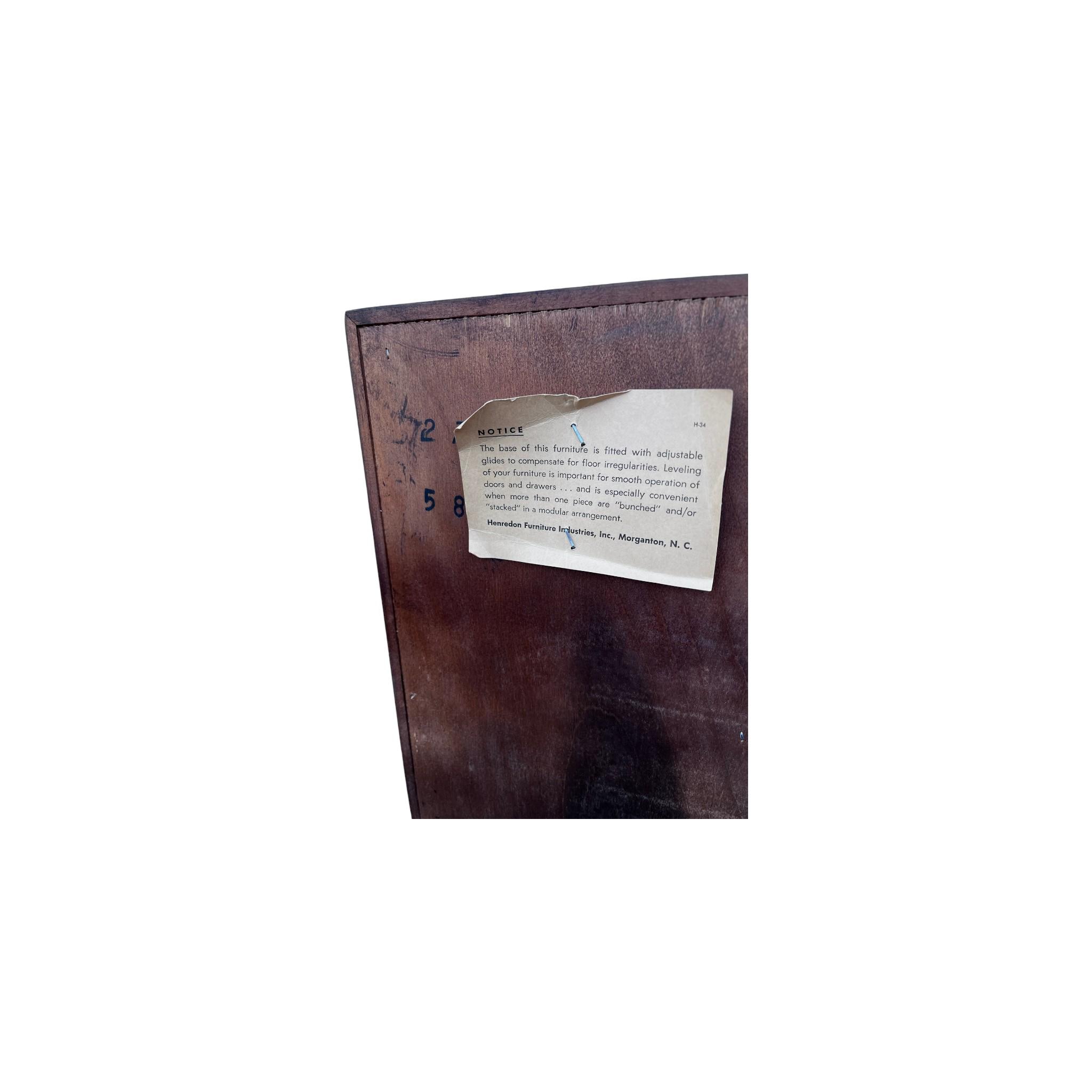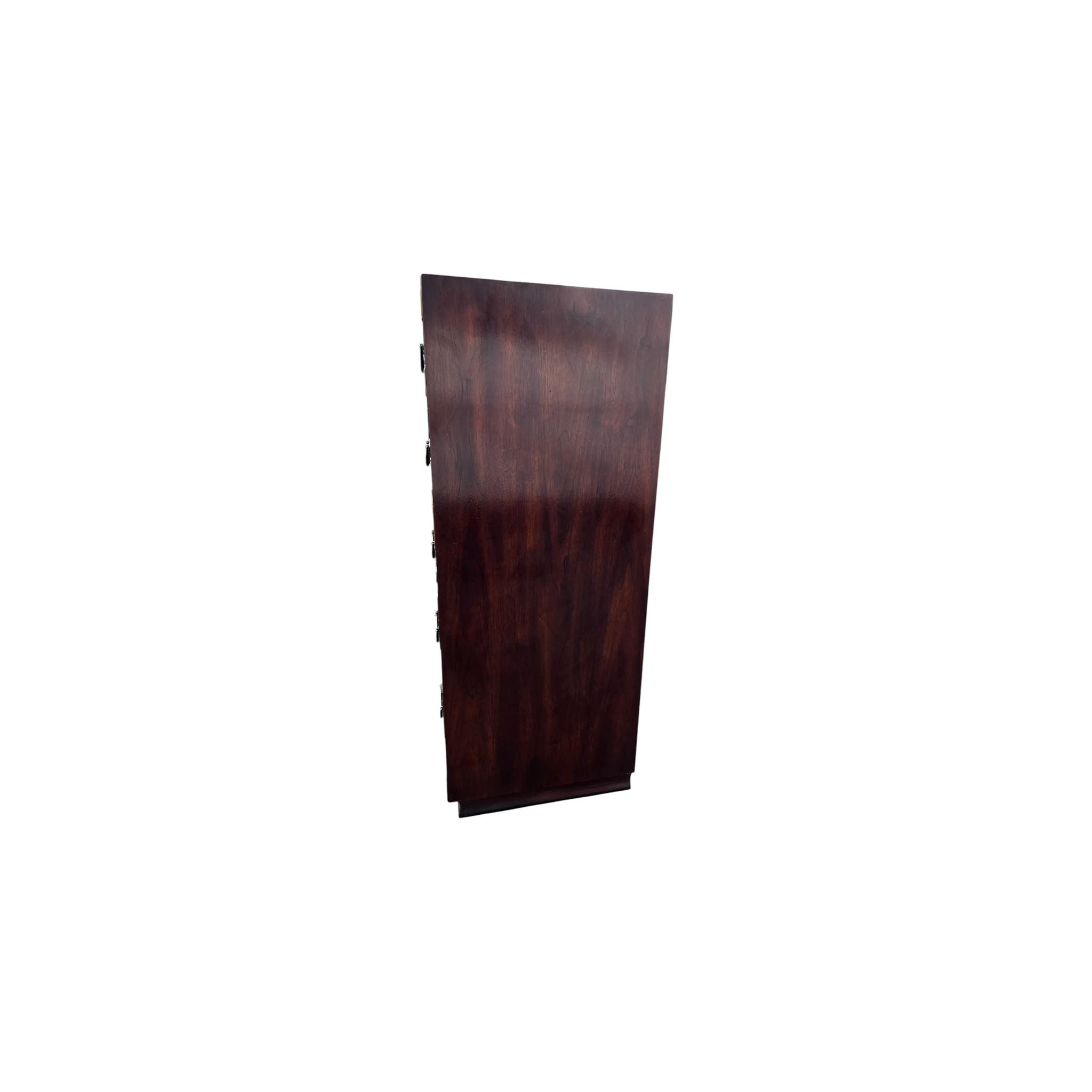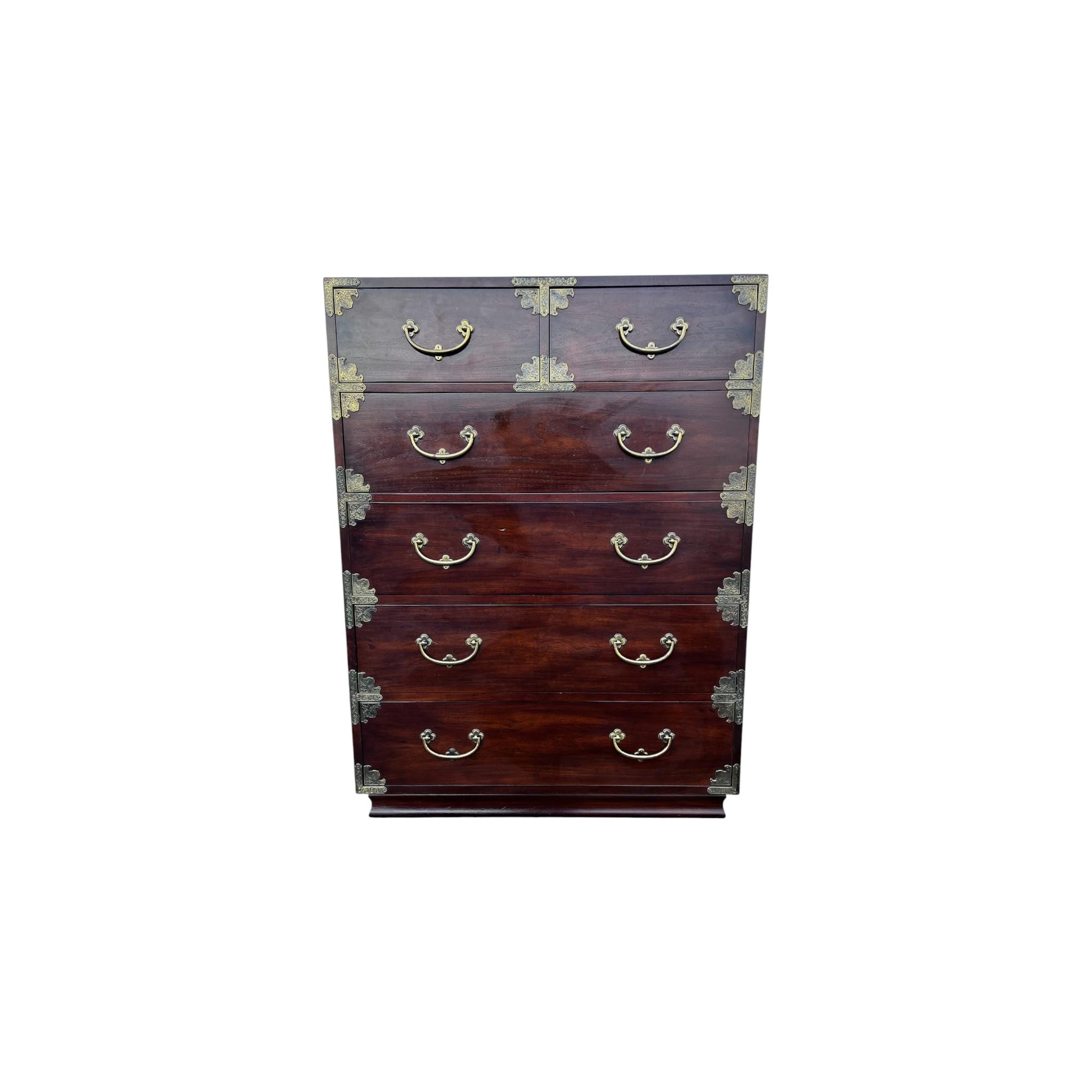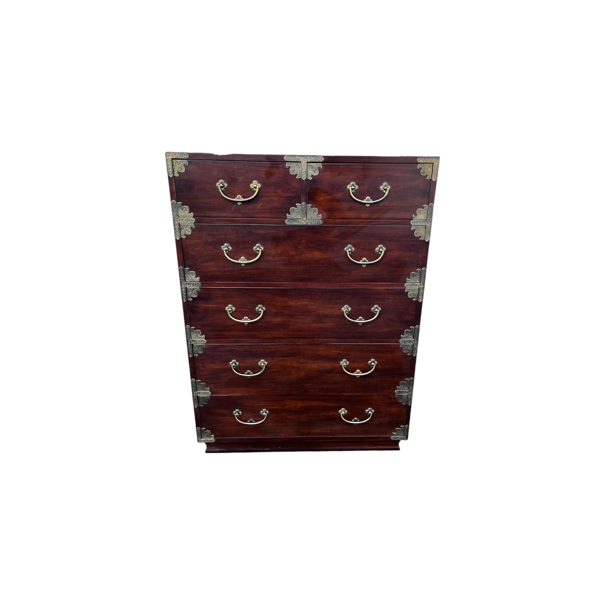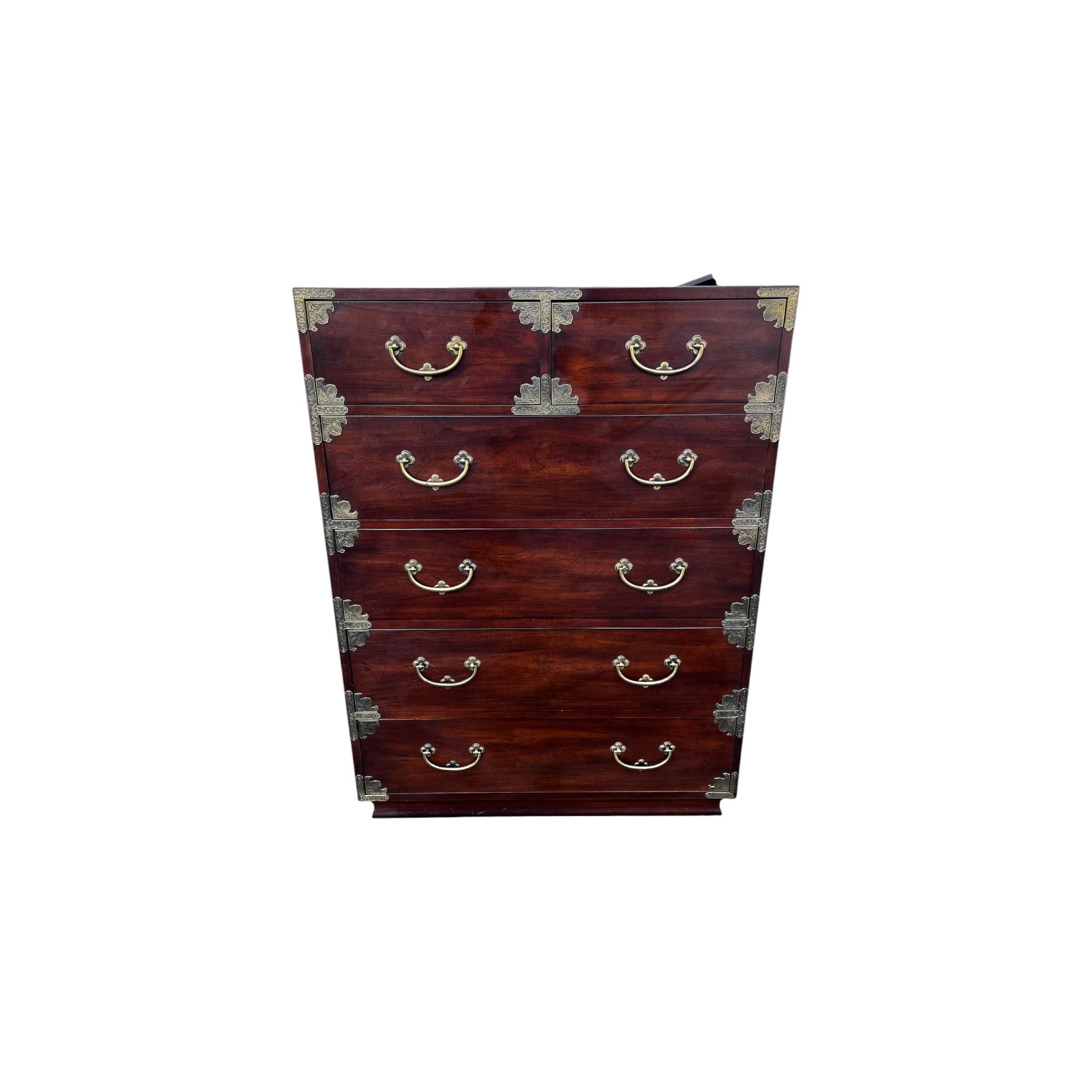 A chest of drawers in the Japanese Tansu Campaign style by Henredon. Mahogany with a rich brown finish with brass accents and hardware. Features two smaller over four larger dovetail drawers, top larger drawer having removable dividers.