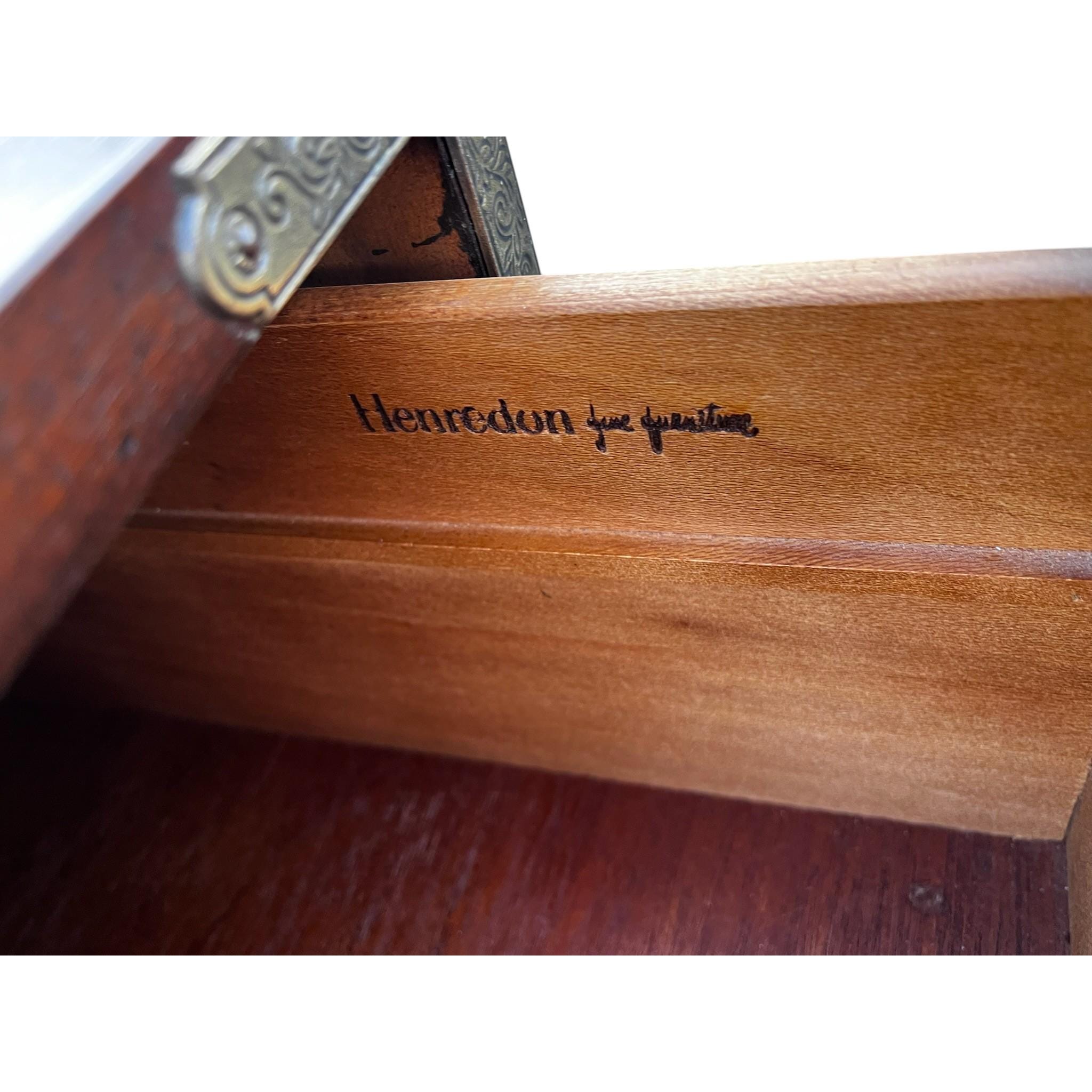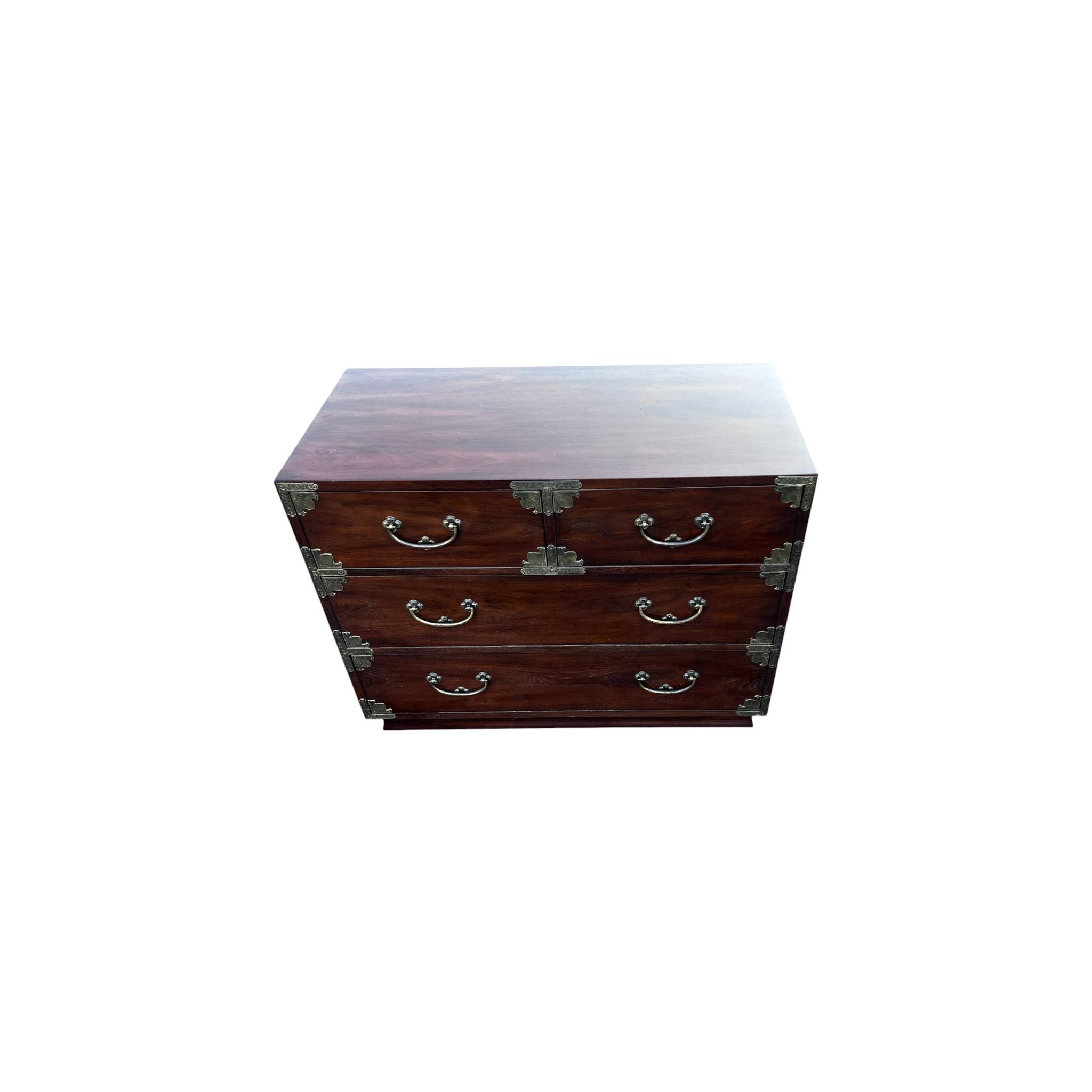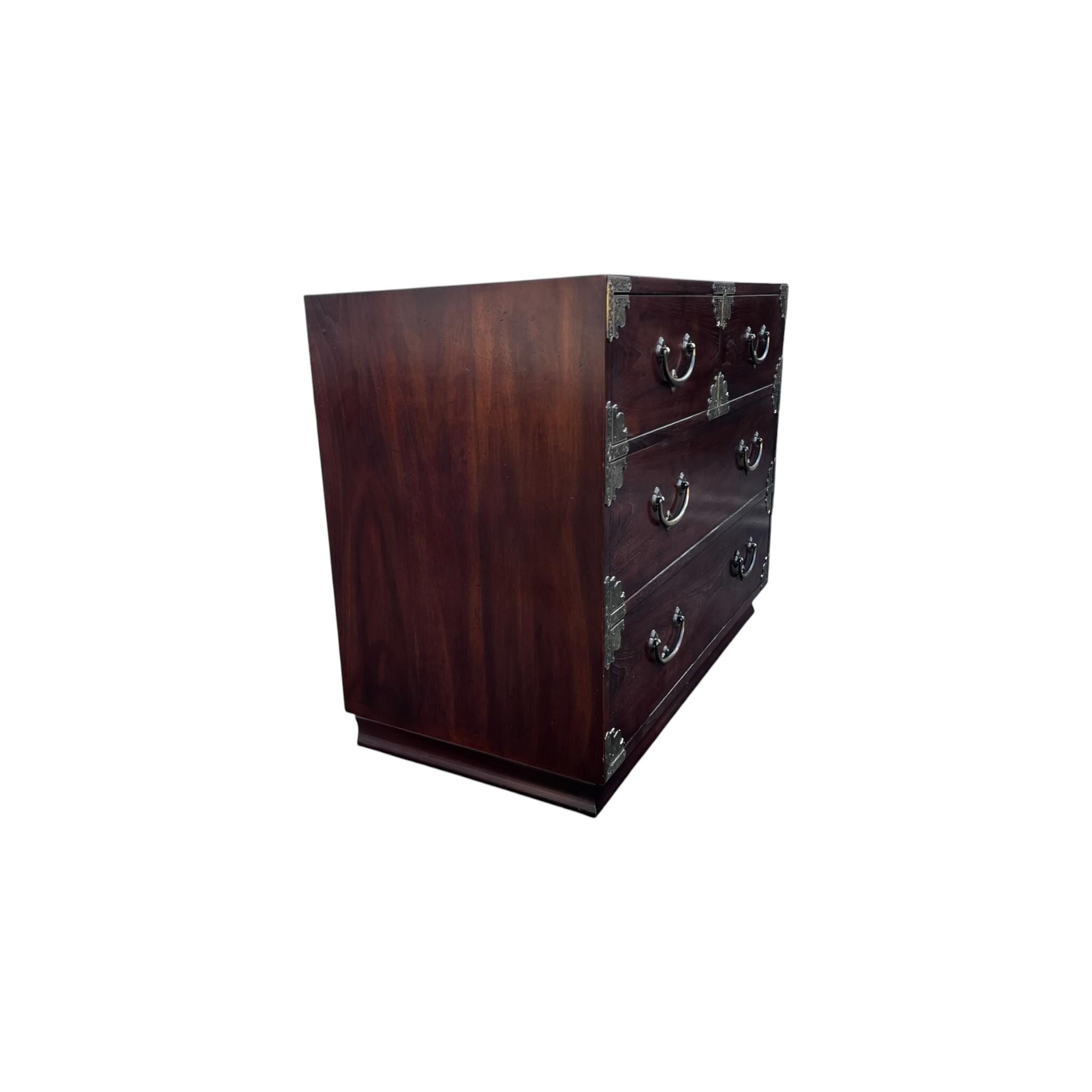 A bachelor chest of drawers in the Japanese Tansu Campaign style by Henredon. Mahogany with a rich brown finish with brass accents and hardware. Features two smaller over two larger dovetail drawers; the top larger drawer has removable dividers.