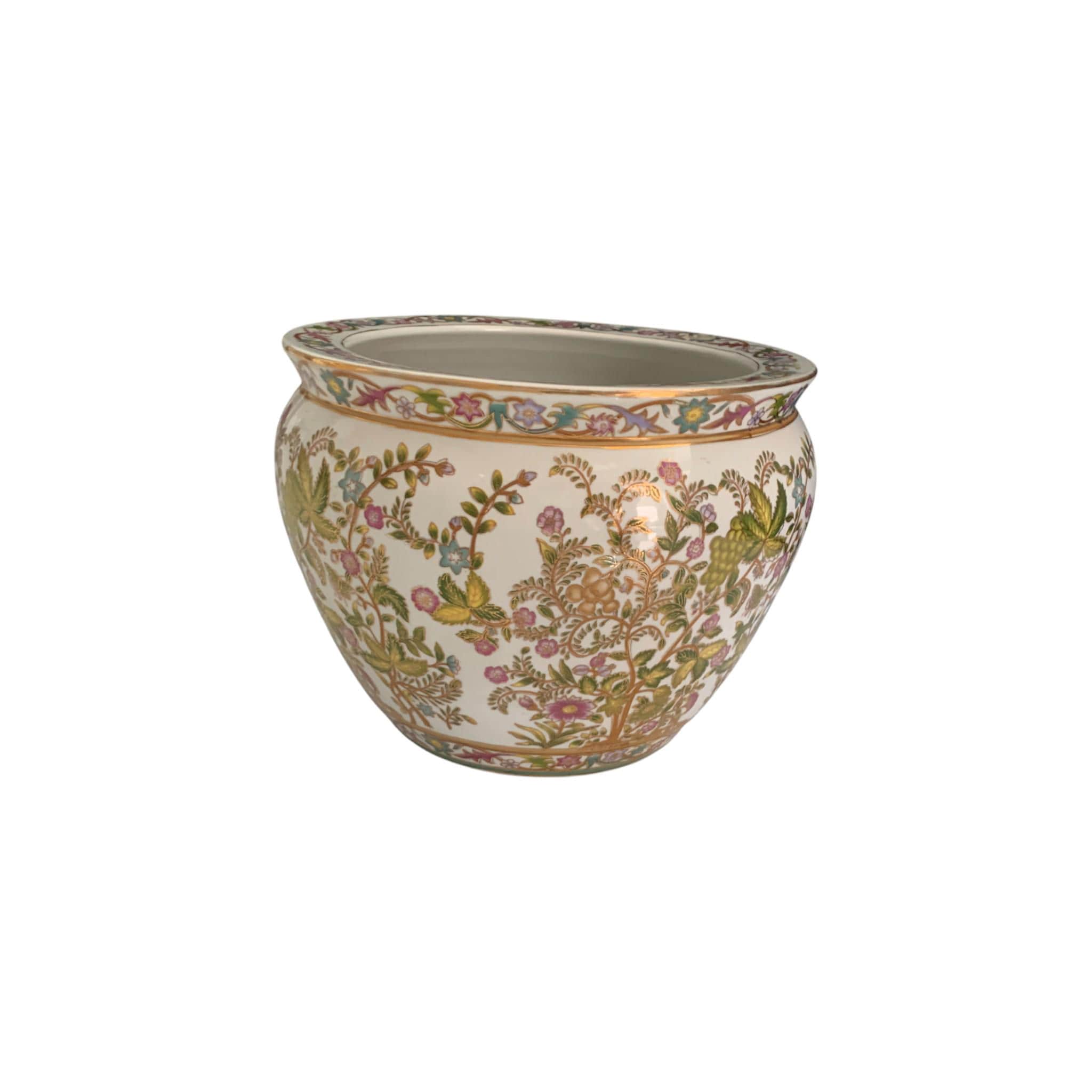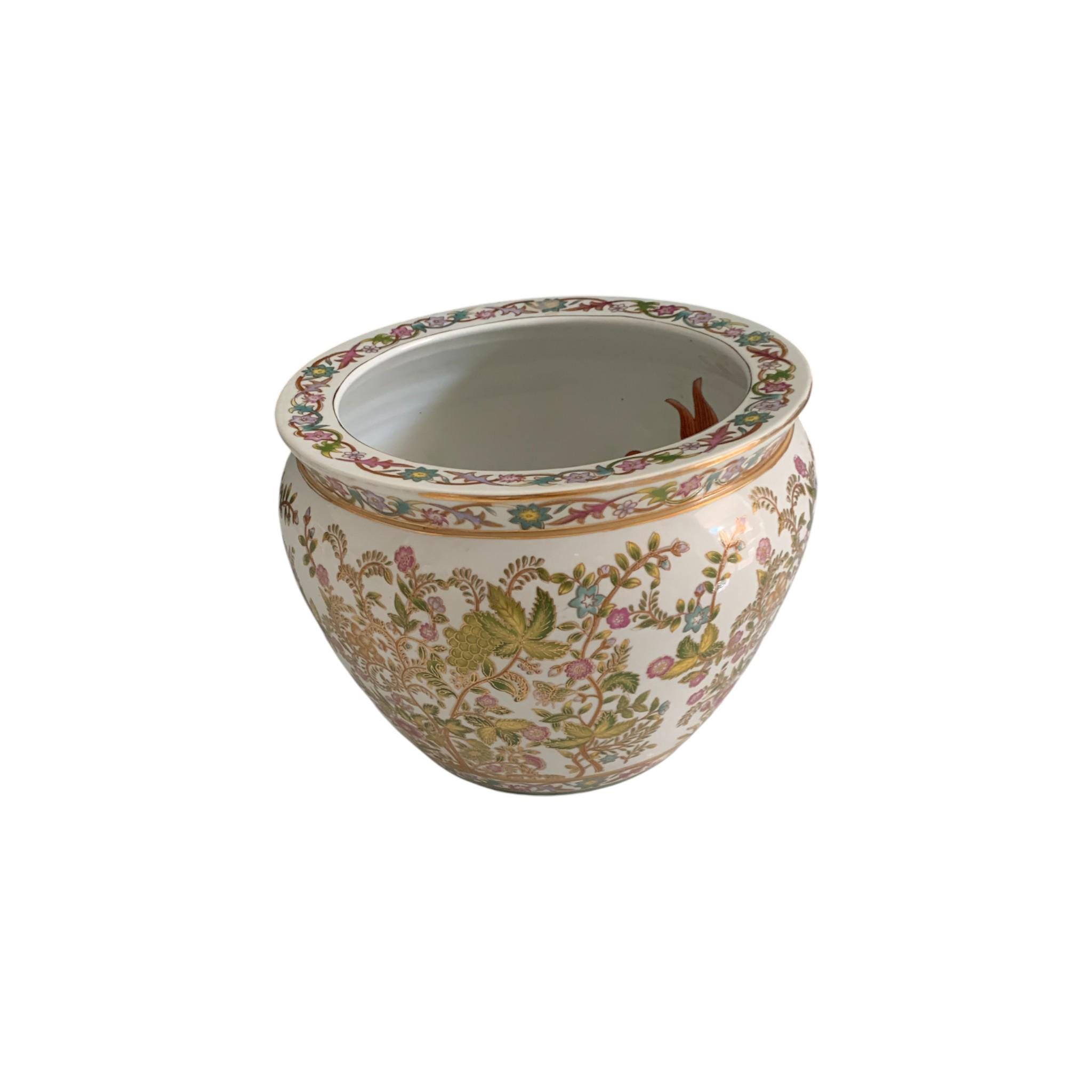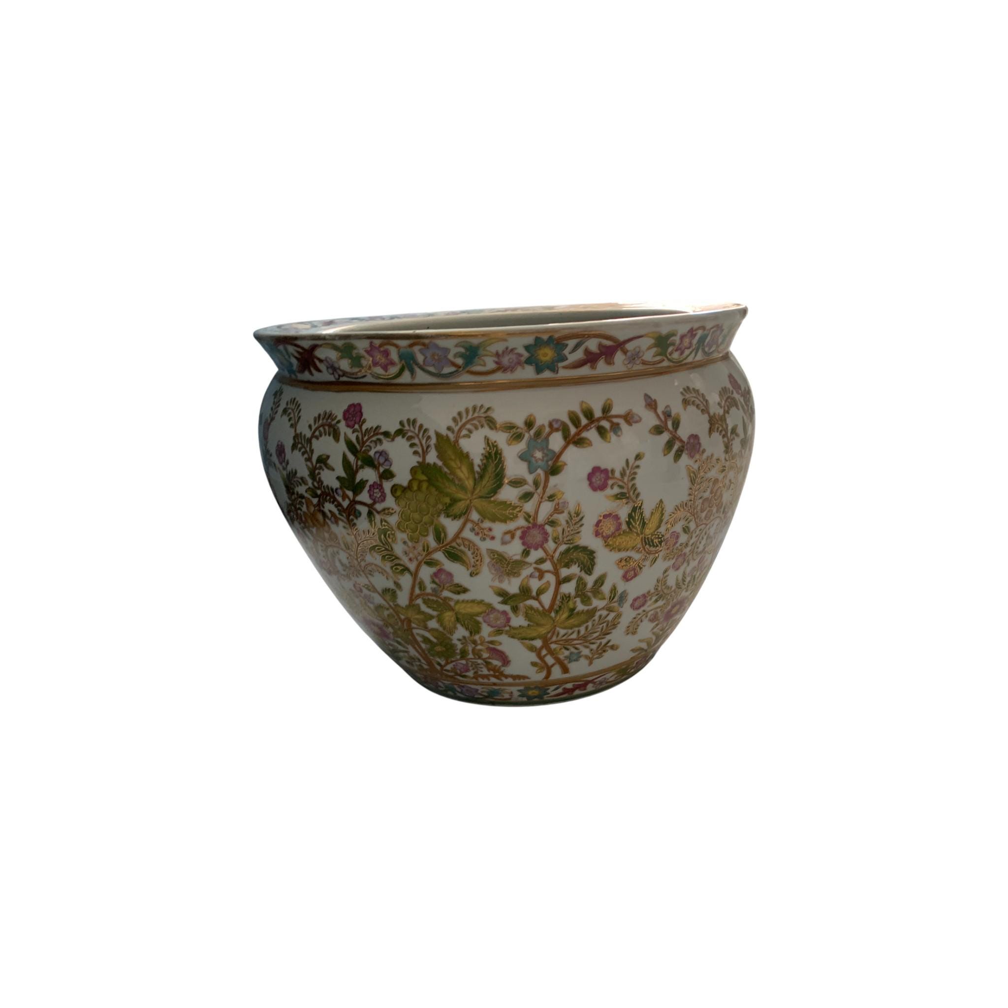 This large Satsuma style fishbowl garden pot planter is crafted from enameled porcelain with a multicolor floral pattern. Hand-painted with a glossy finish, this original Chinese-style piece is perfect for any room and all occasions. Easy to care for by cleaning with a damp cloth, this late 20th-century collectible adds a touch of elegance to any space with its unique design and vibrant colors