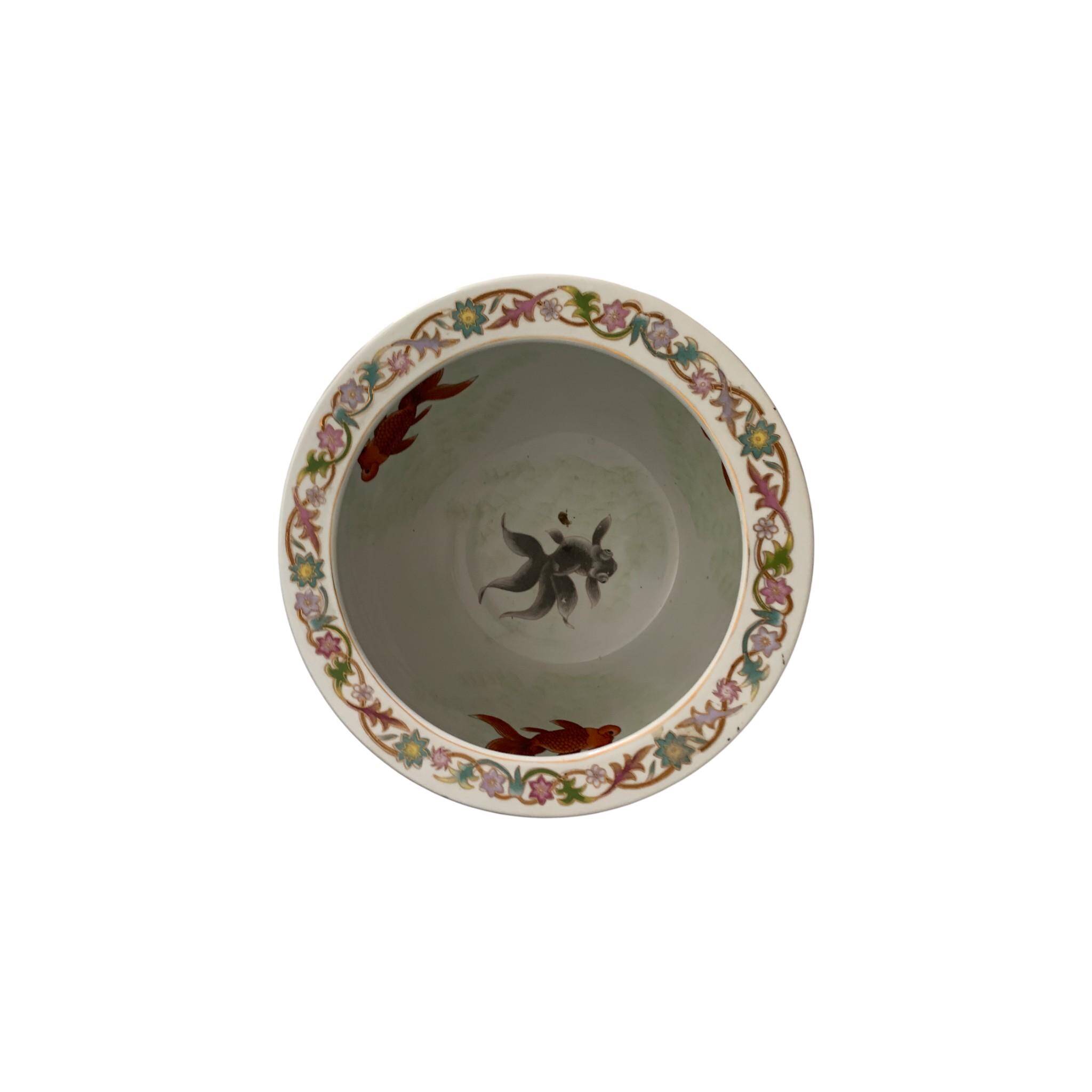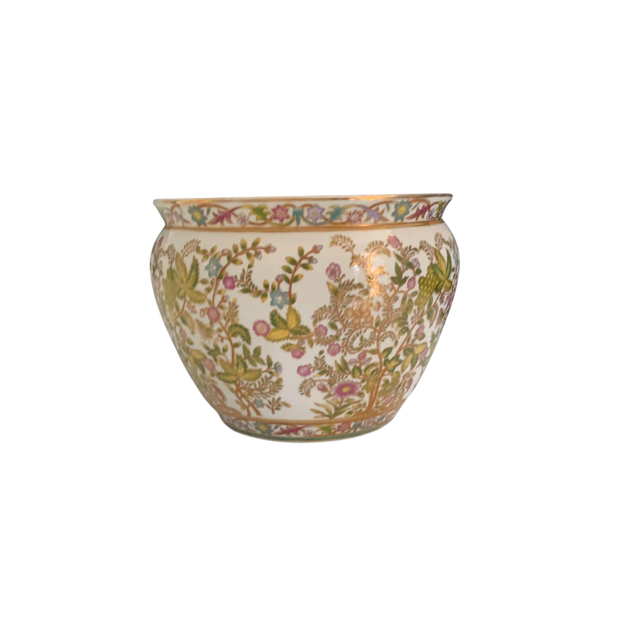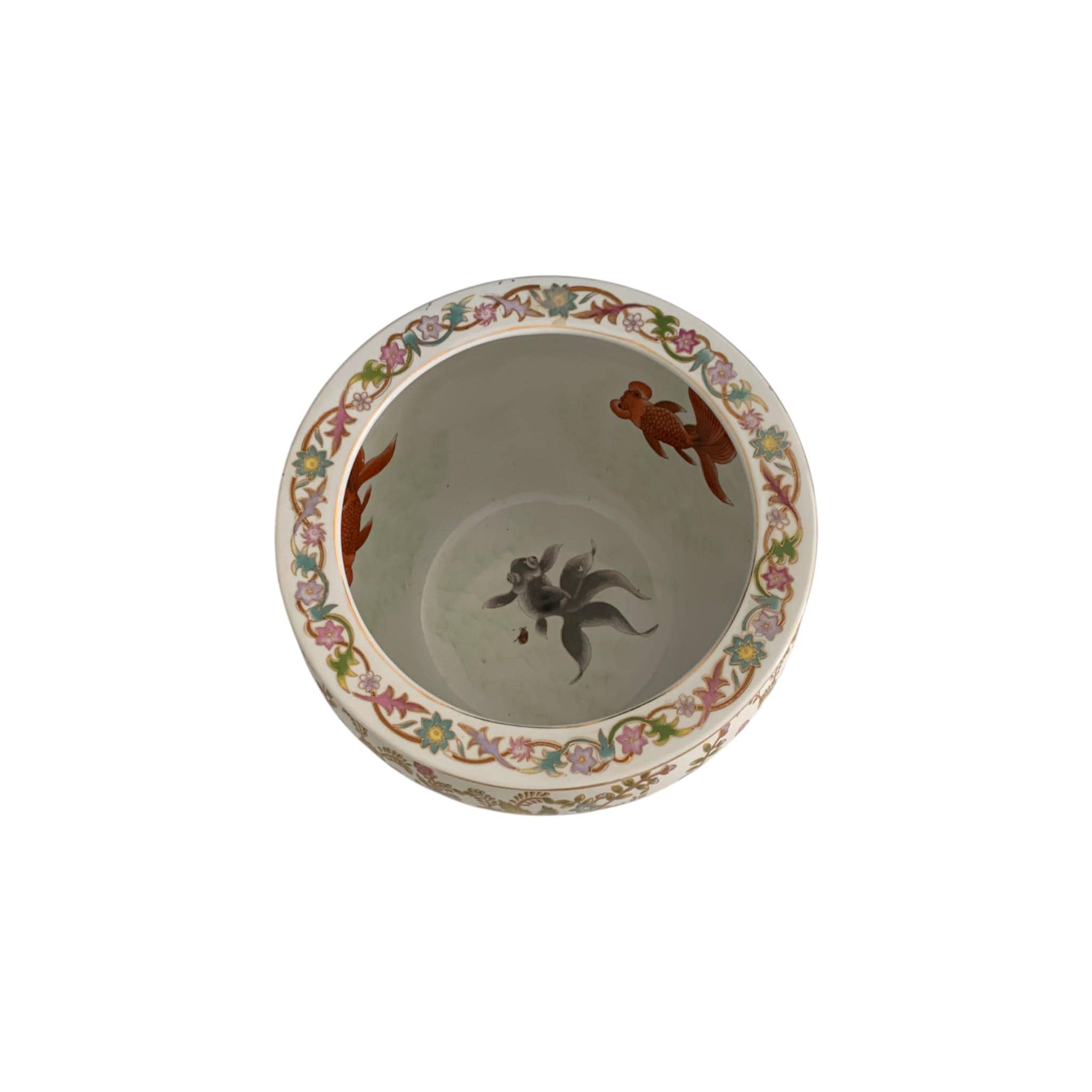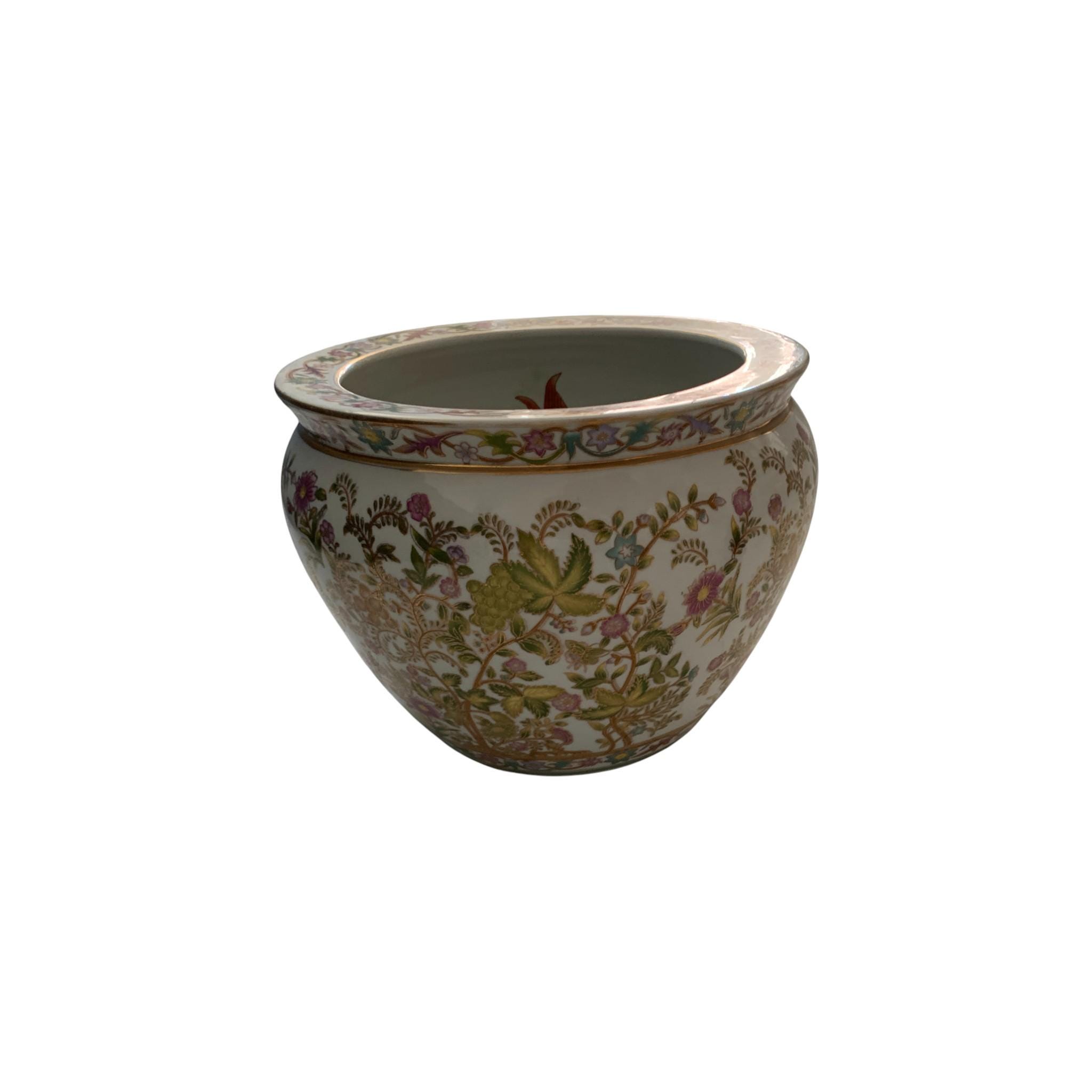 This large Satsuma style fishbowl garden pot planter is crafted from enameled porcelain with a multicolor floral pattern. Hand-painted with a glossy finish, this original Chinese-style piece is perfect for any room and all occasions. Easy to care for by cleaning with a damp cloth, this late 20th-century collectible adds a touch of elegance to any space with its unique design and vibrant colors