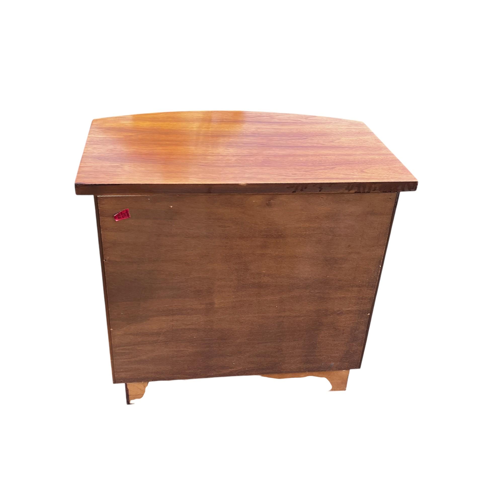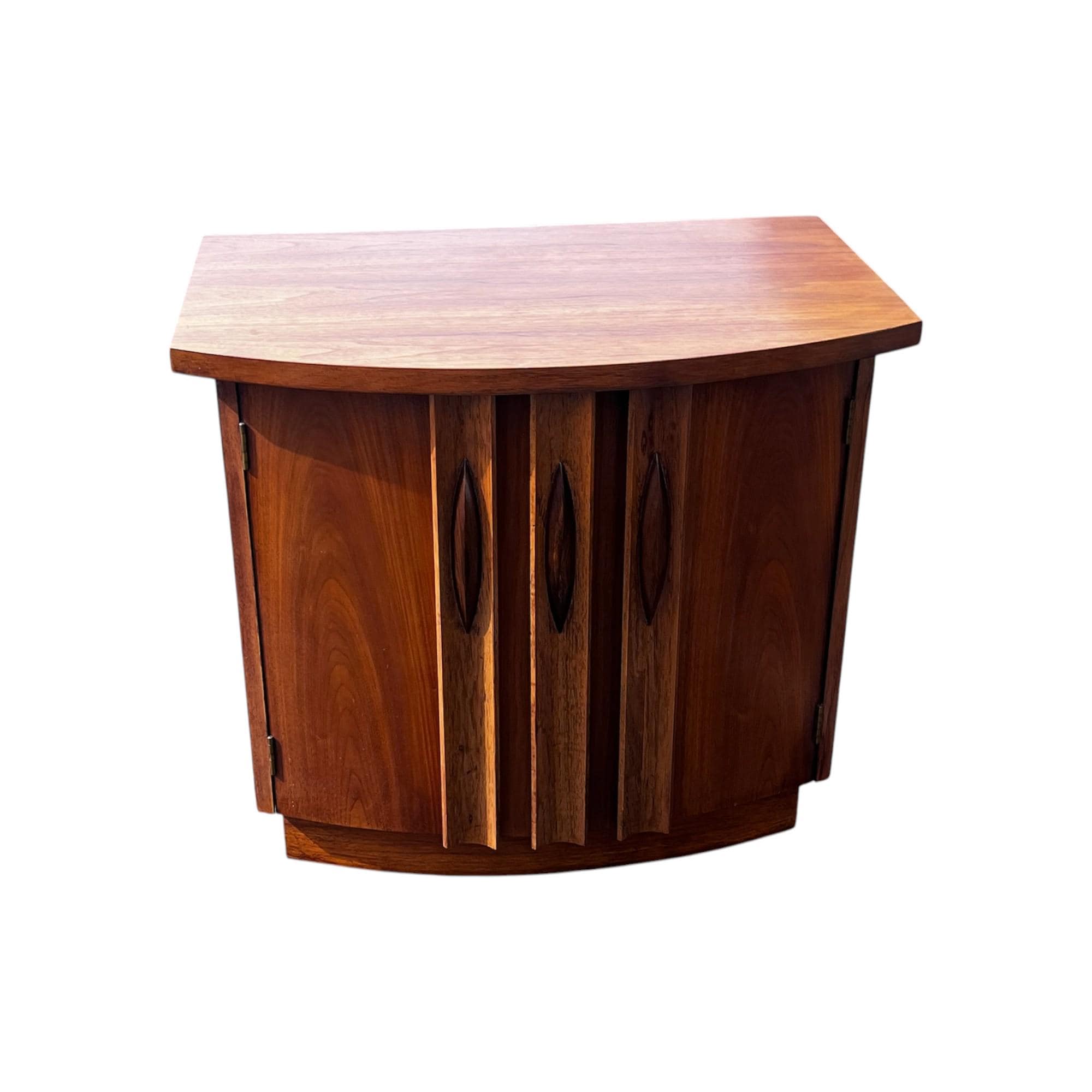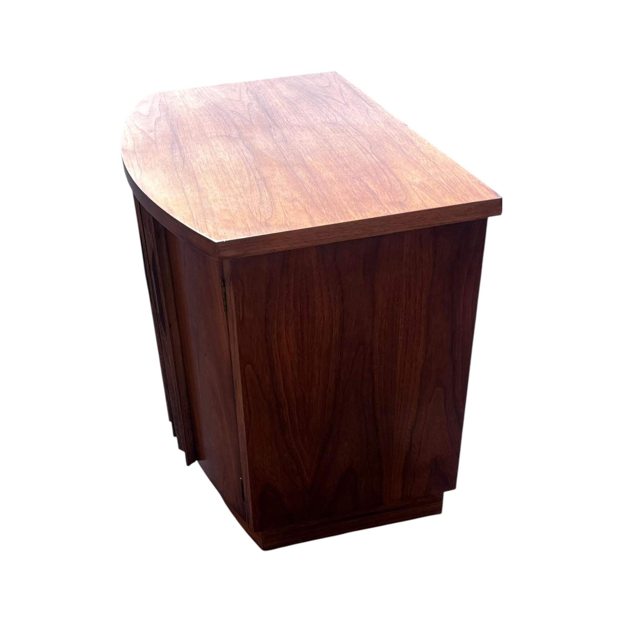 Fantastic American mid-century vintage nightstand designed and built by Thomasville Furniture of Thomasville, North Carolina! Featuring charming sculptural walnut diamond pulls with contrasting oak trim, the double doors open to reveal a spacious shelved cubby. Wonderfully versatile design sure to mesh into a wide variety of both modern and organic decor schemes.