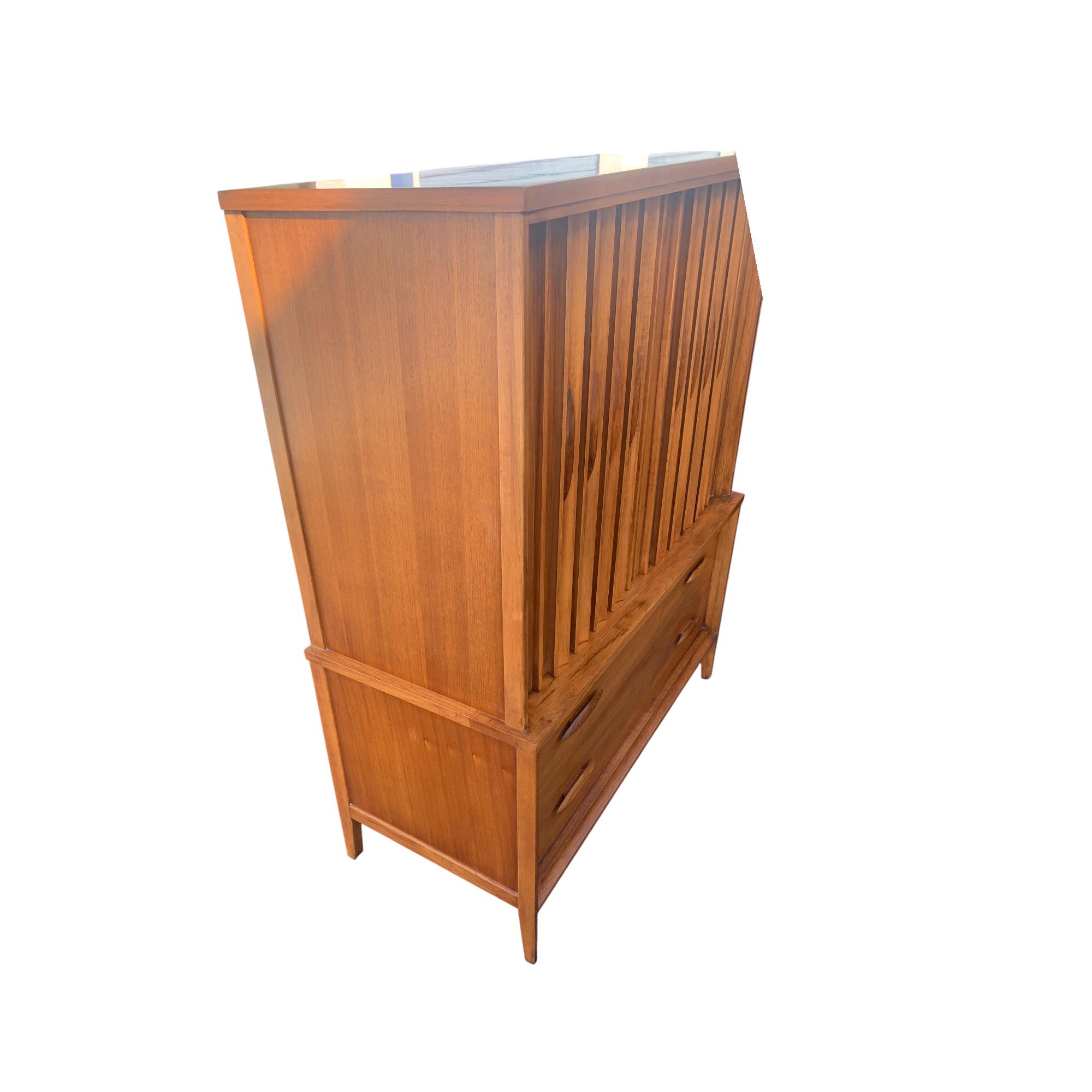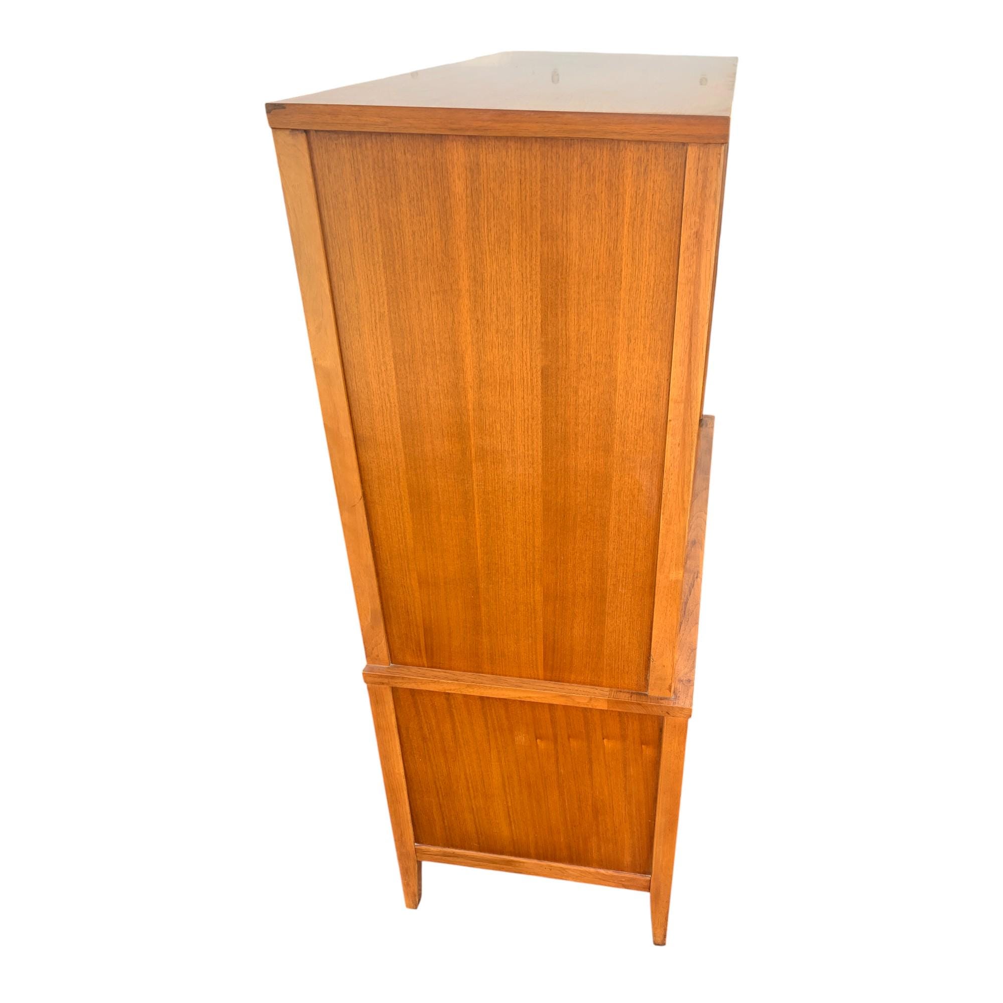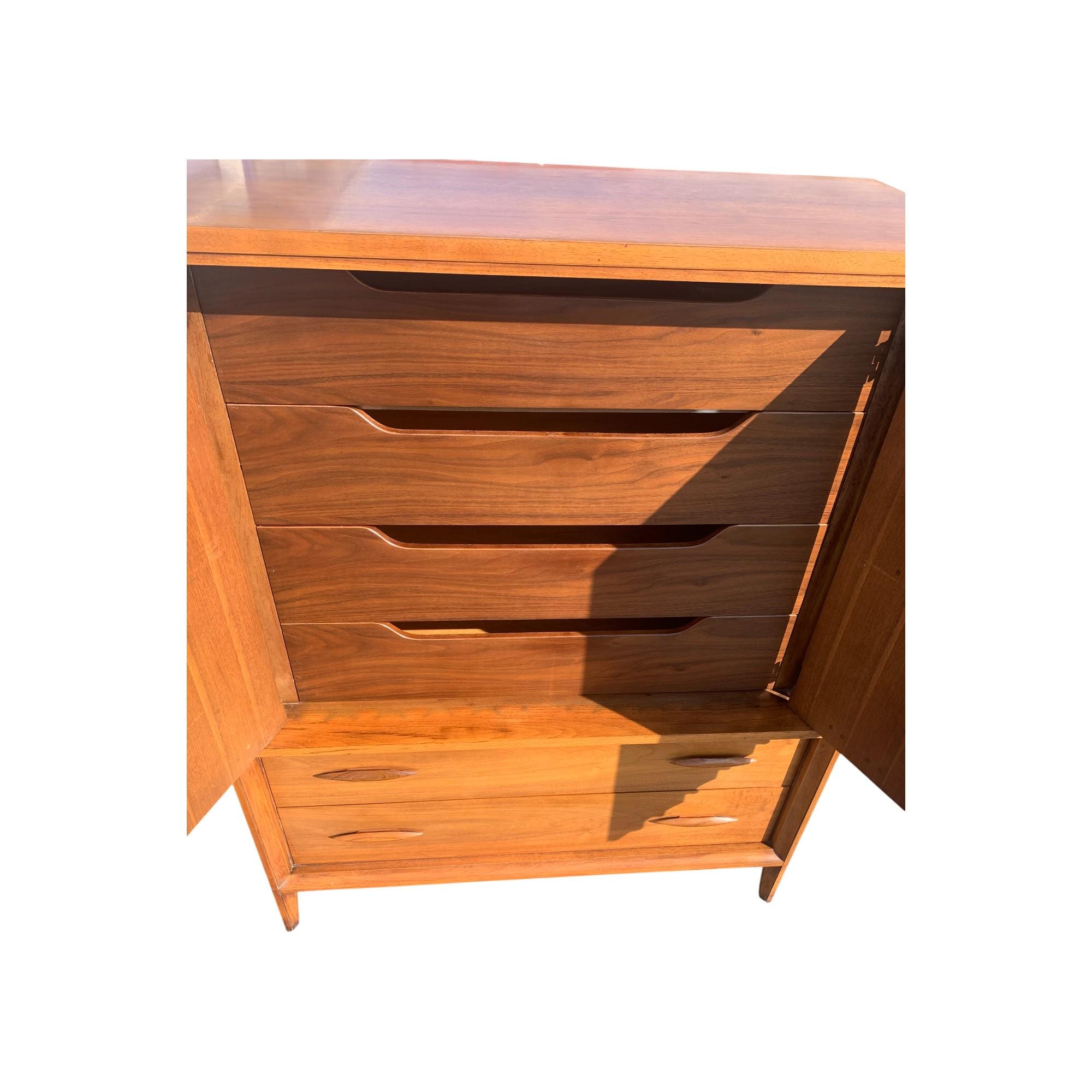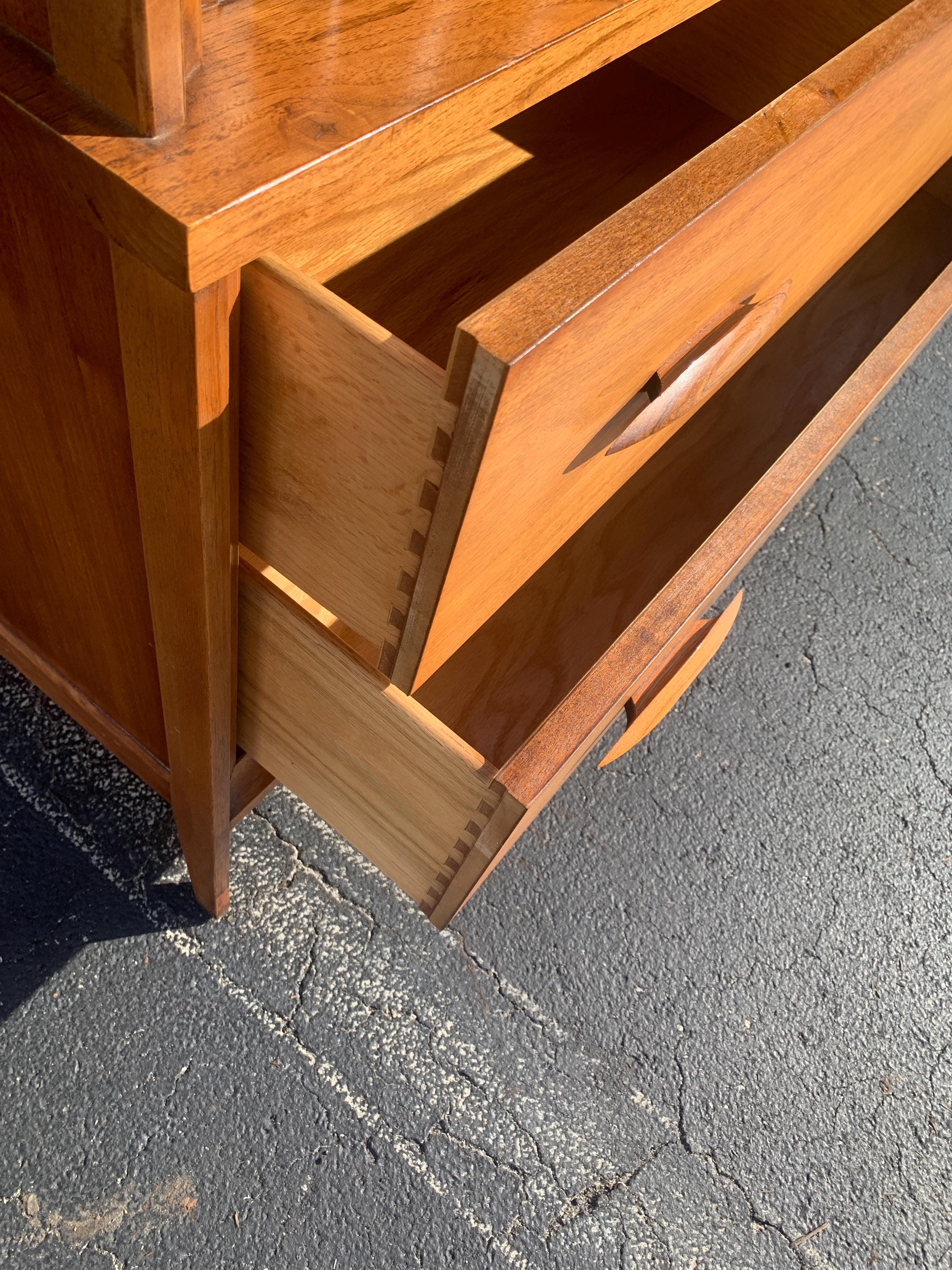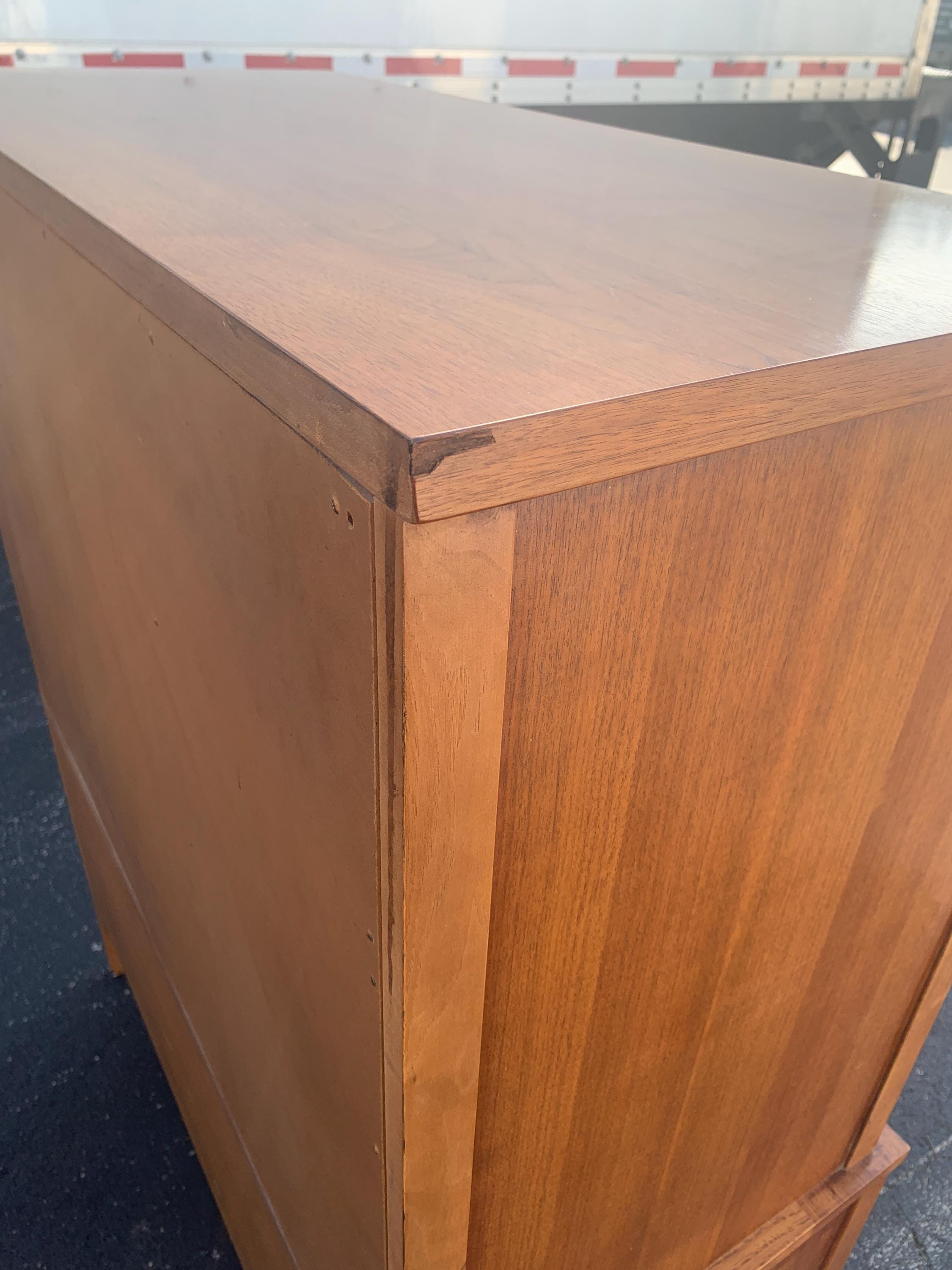 Introducing a remarkable vintage find, a Thomasville mid-century modern gentleman’s chest made with exquisite walnut wood and adorned with rosewood embellishments on the top doors. This stunning dresser exudes enduring style and exceptional quality that Thomasville is renowned for. With four wide and deep drawers cleverly concealed behind the top doors, and two equally spacious bottom drawers, this piece offers ample storage space for your essentials. Elevate your decor with this 1960s mid-century modern masterpiece from Thomasville.