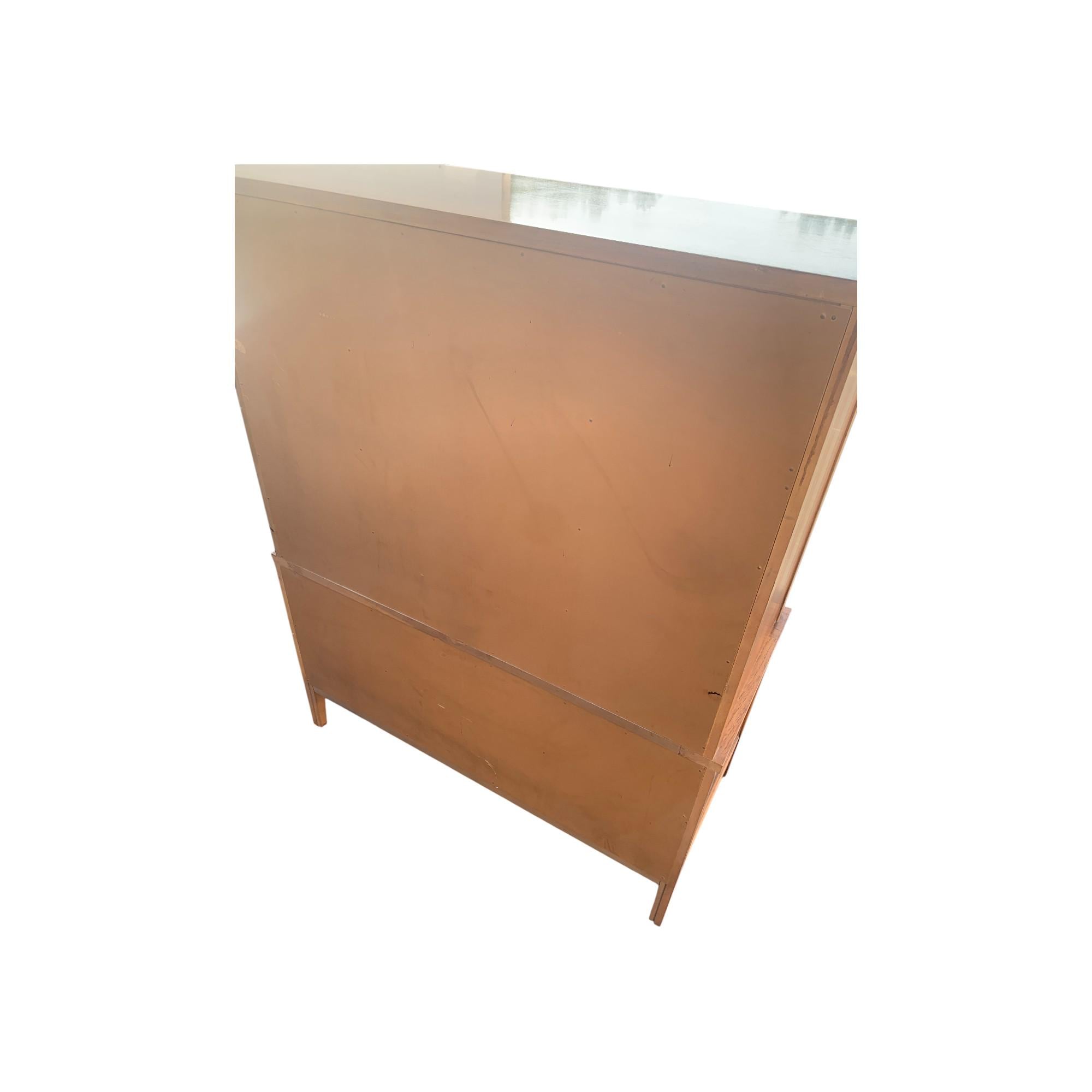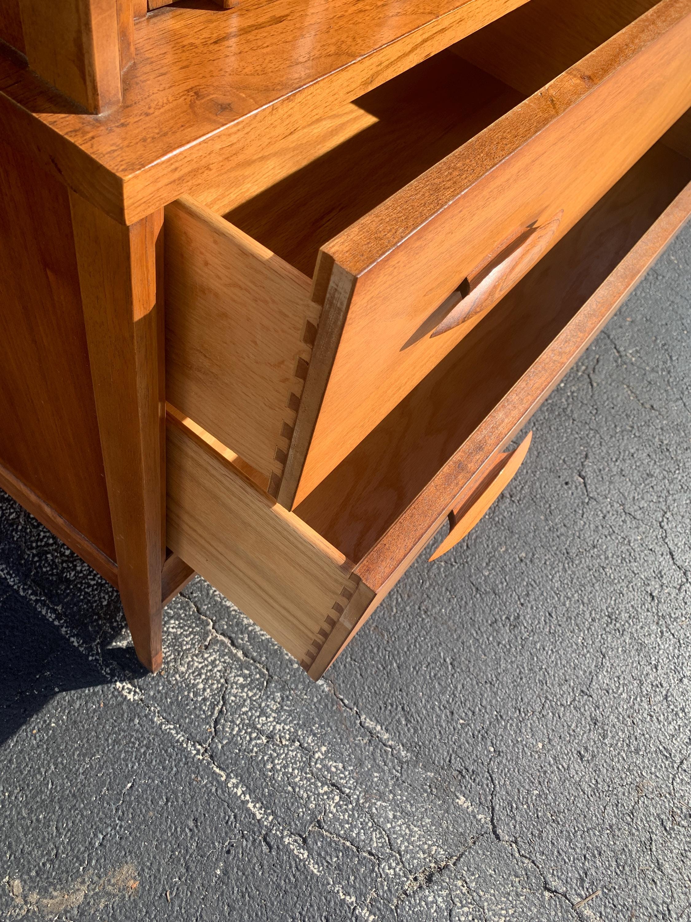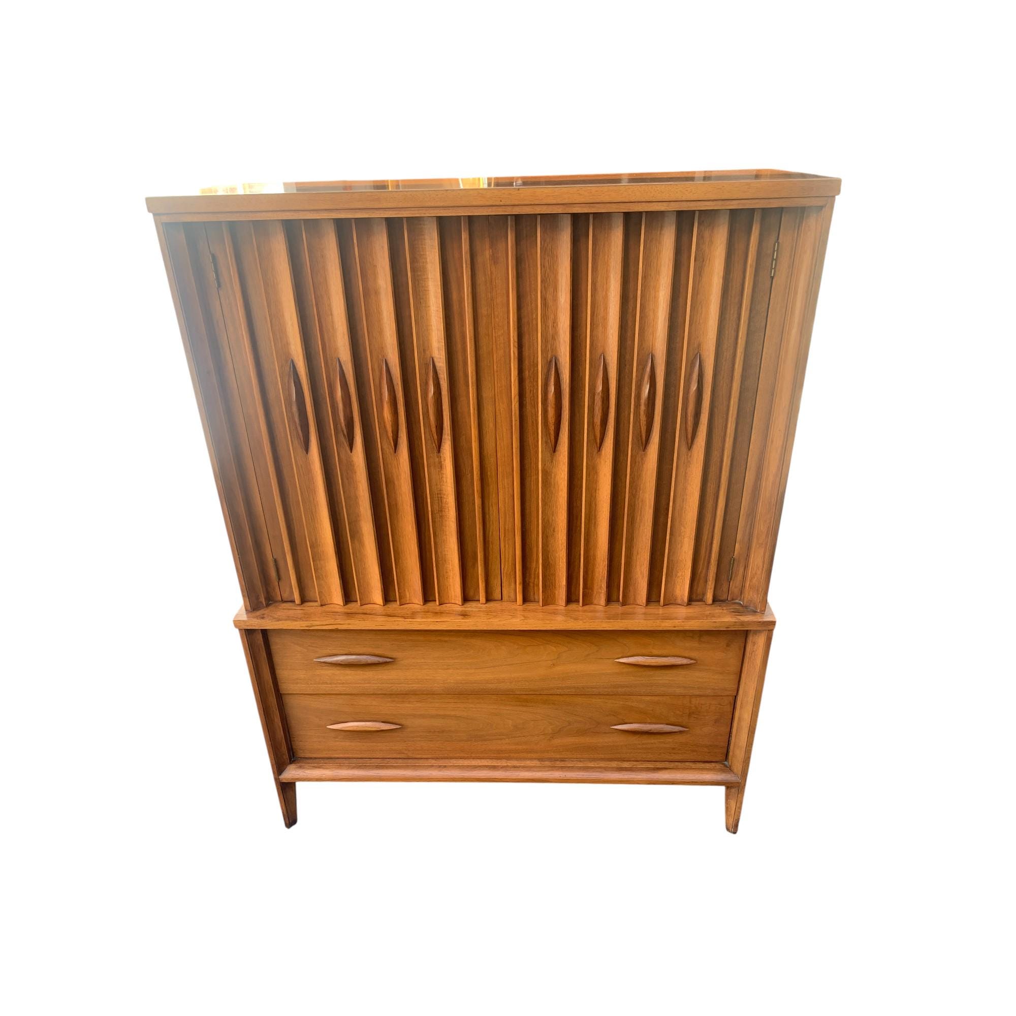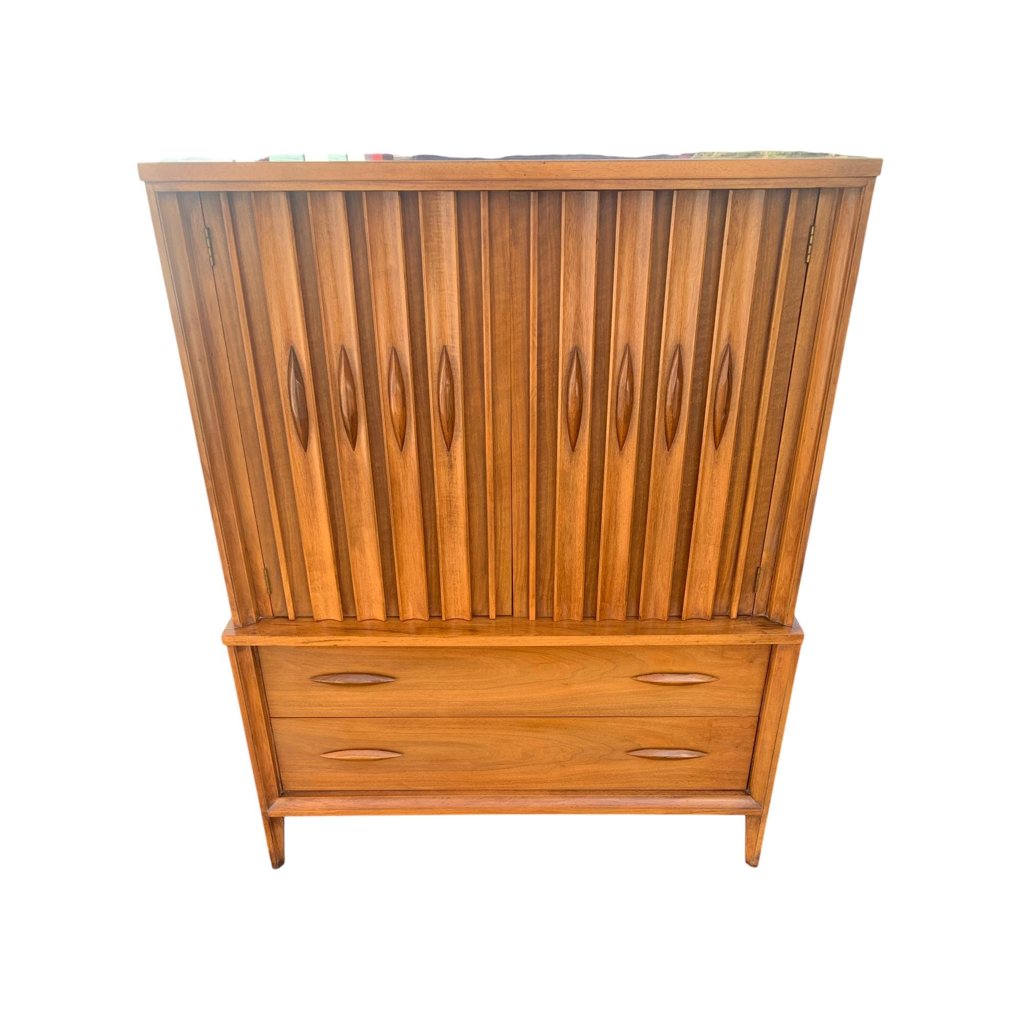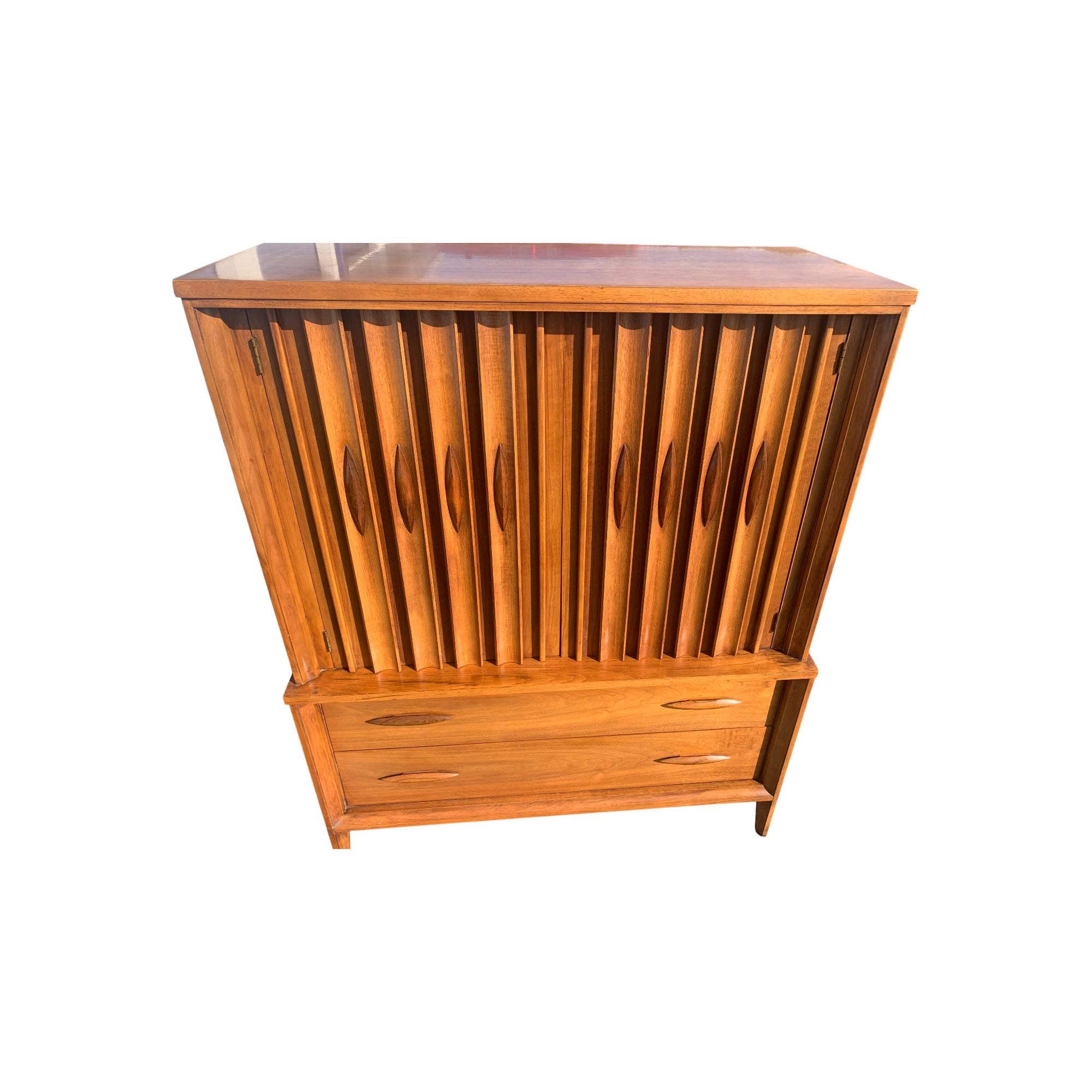 Introducing a remarkable vintage find, a Thomasville mid-century modern gentleman’s chest made with exquisite walnut wood and adorned with rosewood embellishments on the top doors. This stunning dresser exudes enduring style and exceptional quality that Thomasville is renowned for. With four wide and deep drawers cleverly concealed behind the top doors, and two equally spacious bottom drawers, this piece offers ample storage space for your essentials. Elevate your decor with this 1960s mid-century modern masterpiece from Thomasville.