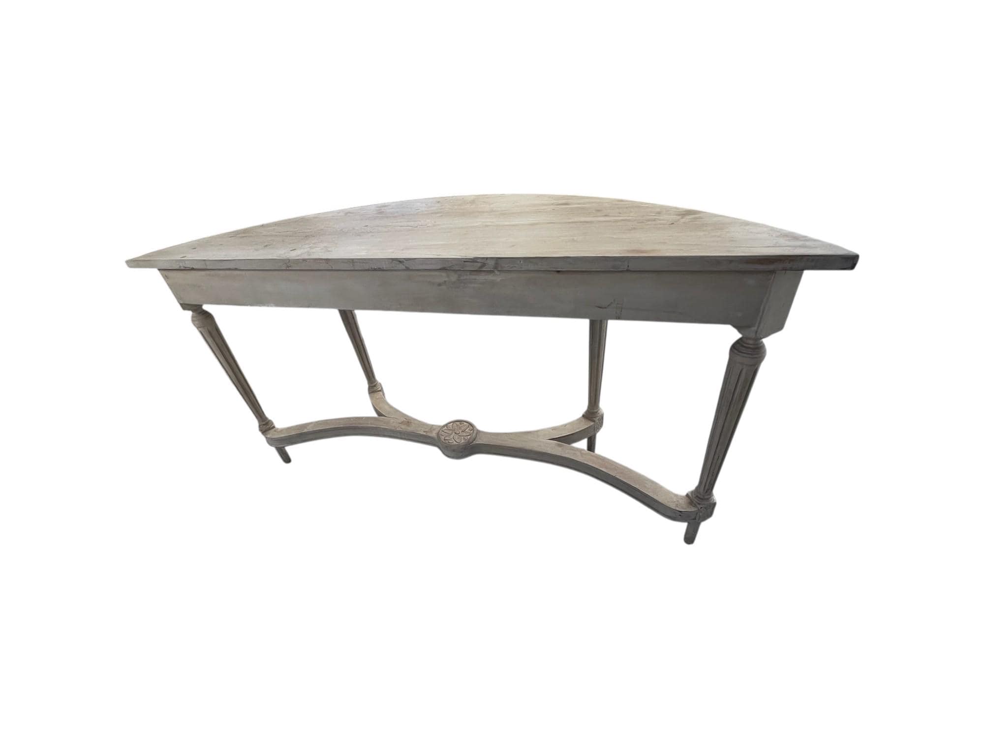 The Louis XVI Style half-moon-shaped console table is a striking piece of antique furniture with a patinated wood distressed look. This fully assembled console table features intricate carvings and exudes a sense of luxury with its Louis XVI style. The wood material used in its construction adds a touch of elegance, making it a perfect addition to any indoor space looking to add a touch of vintage charm.