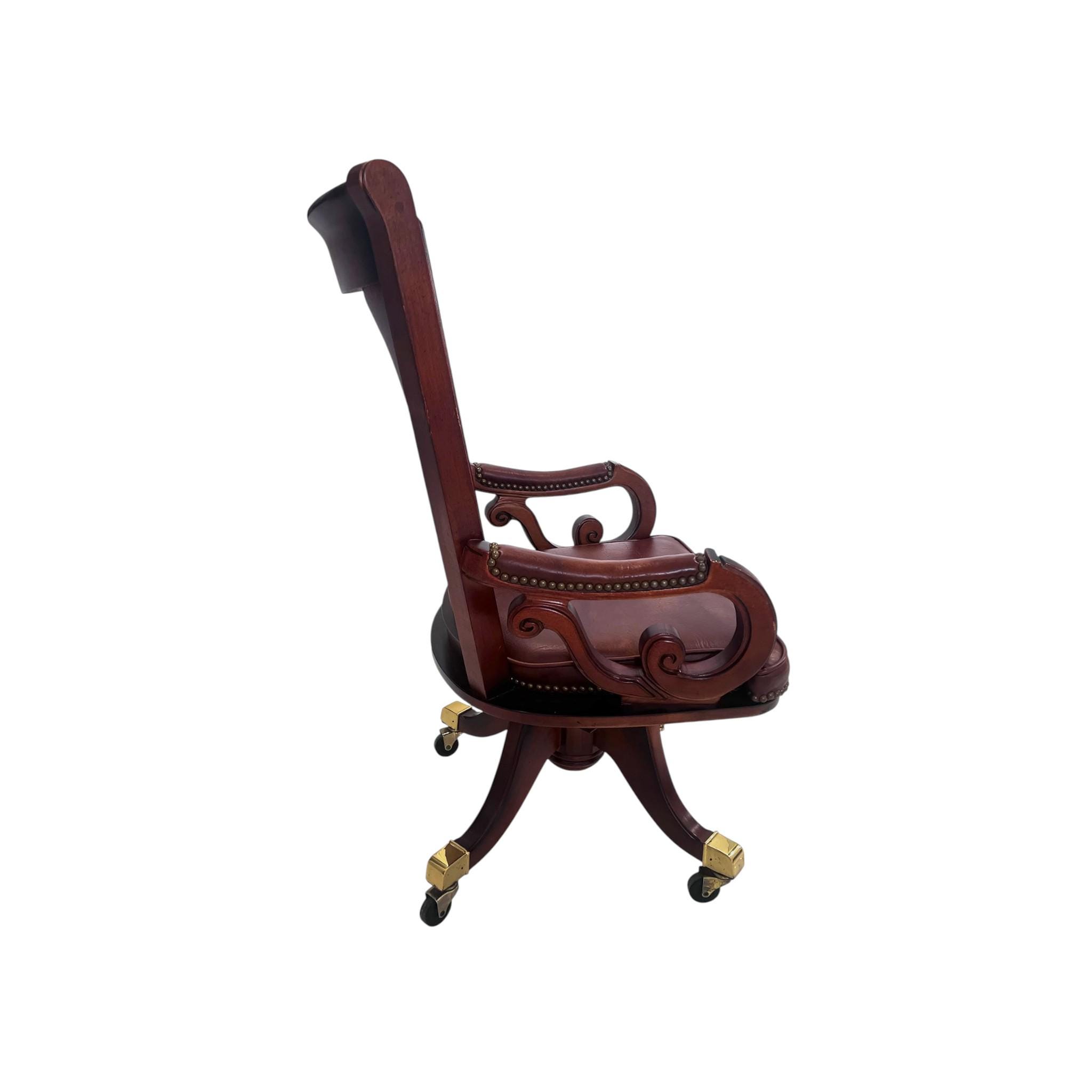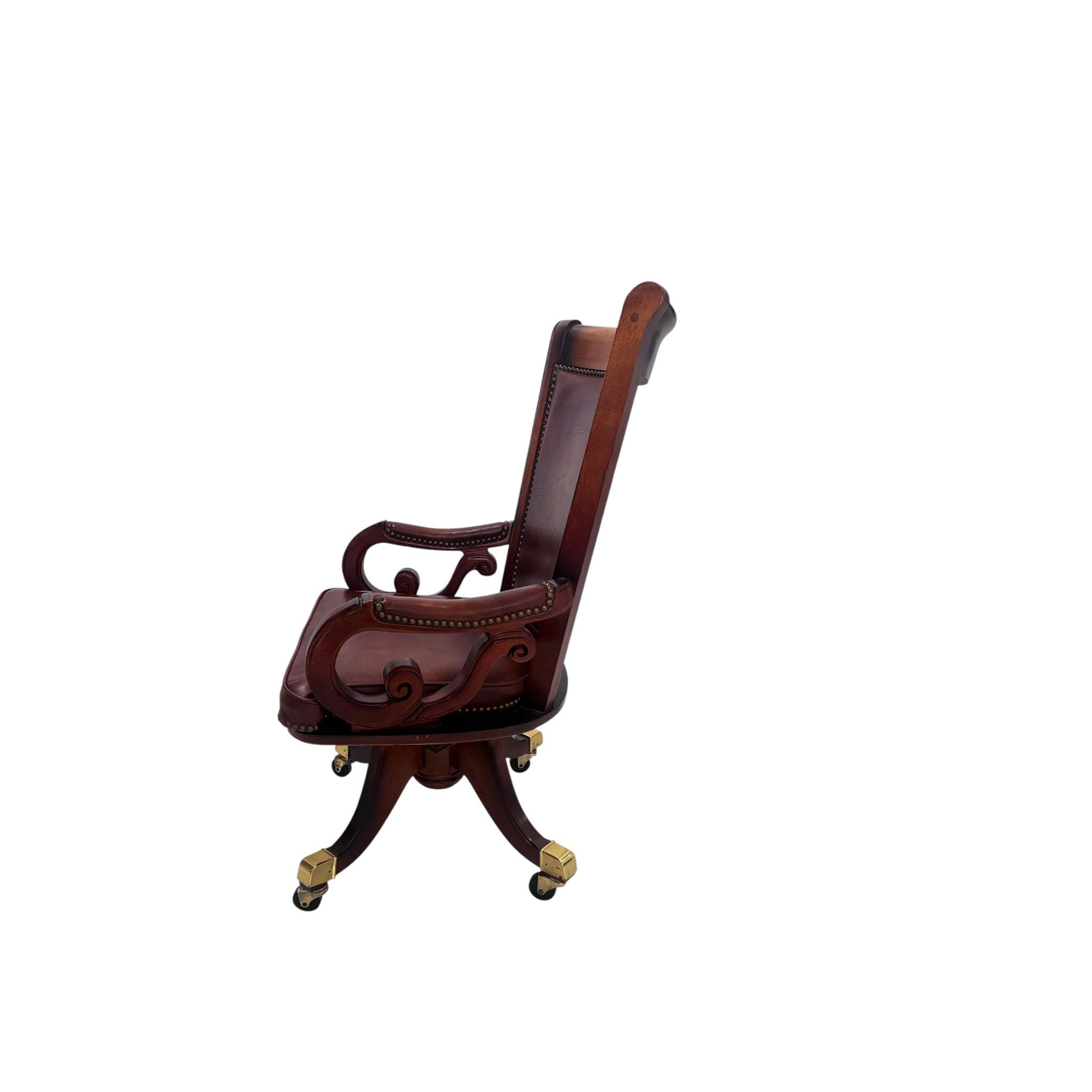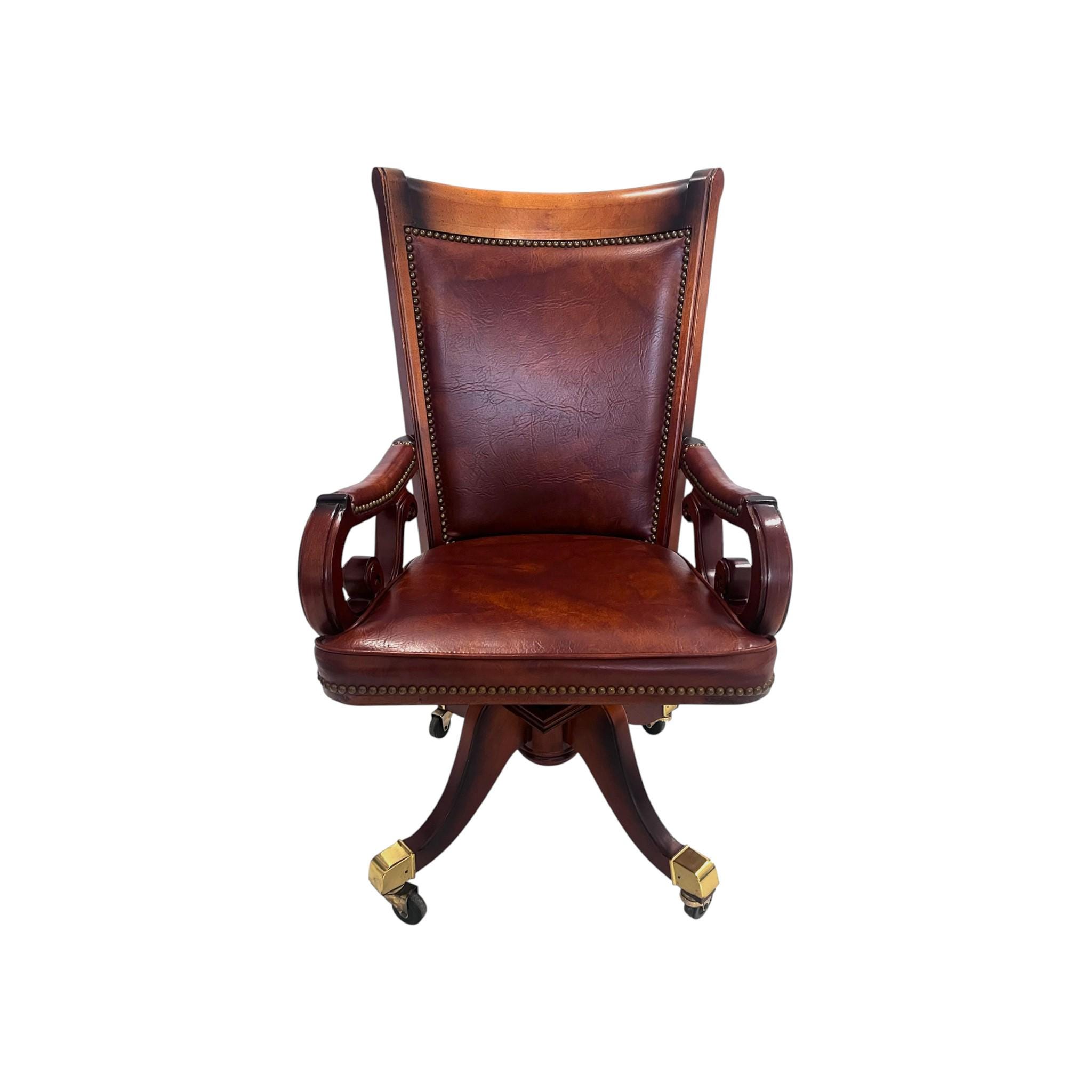 The Pulaski Leather Swivel Office Chair with Casters is a stylish and functional piece of office furniture. This desk chair features a swivel design for easy maneuverability and convenience. Made by the reputable brand Pulaski, this chair provides a comfortable and supportive seating option for any office setting. this beautiful vintage Pulaski office chair in rich brown leather with brass nailhead trim and carved scroll arms. Solid wood frame, smooth swivel base, and sturdy casters. Comfortable, classic, and built to last.