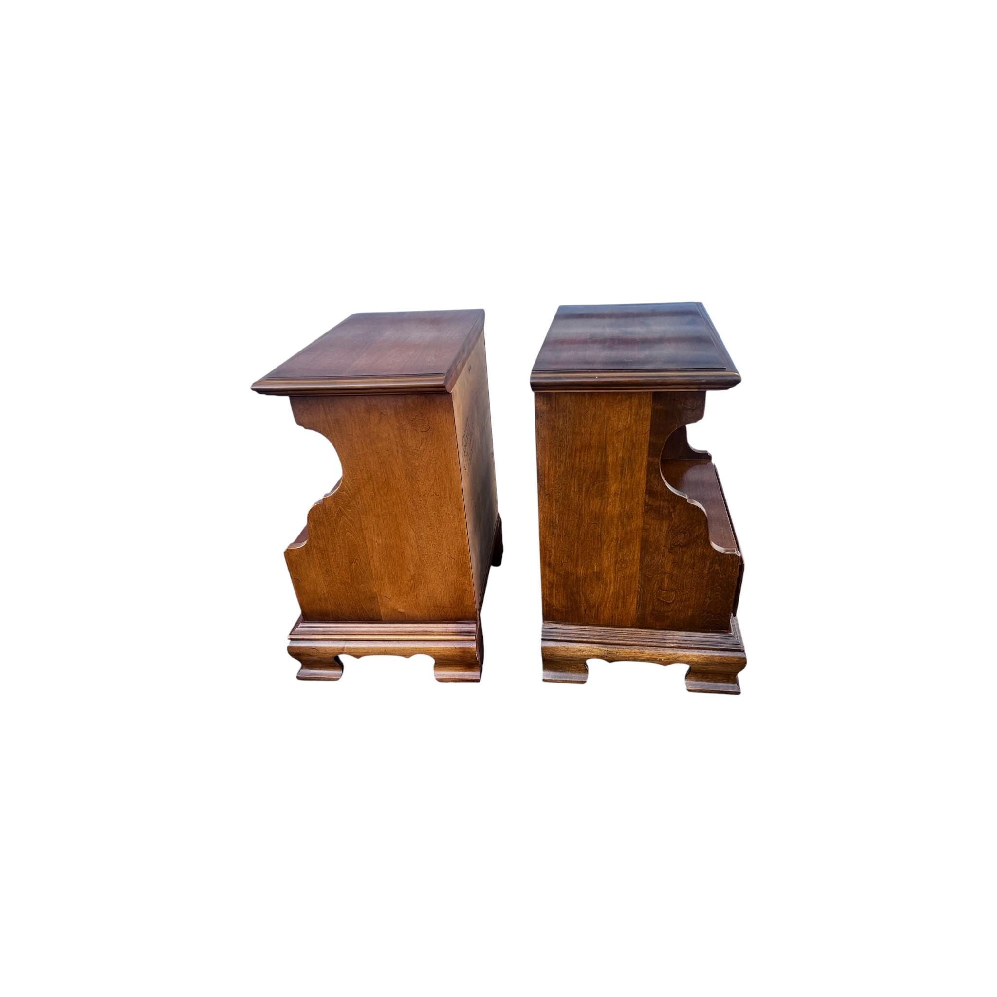 The Ethan Allen Classic Manor Maple Nightstands are a timeless pair of fully assembled nightstands with an antique brass handle finish and a medium wood tone color. Crafted from birch and showcasing an American sub-style, these traditional nightstands feature one drawer and are 16 inches deep, 26 inches high, and 22 inches wide. Made in the United States by Ethan Allen, these nightstands are a classic addition to any bedroom, perfect for those looking to add a touch of vintage charm to their space.