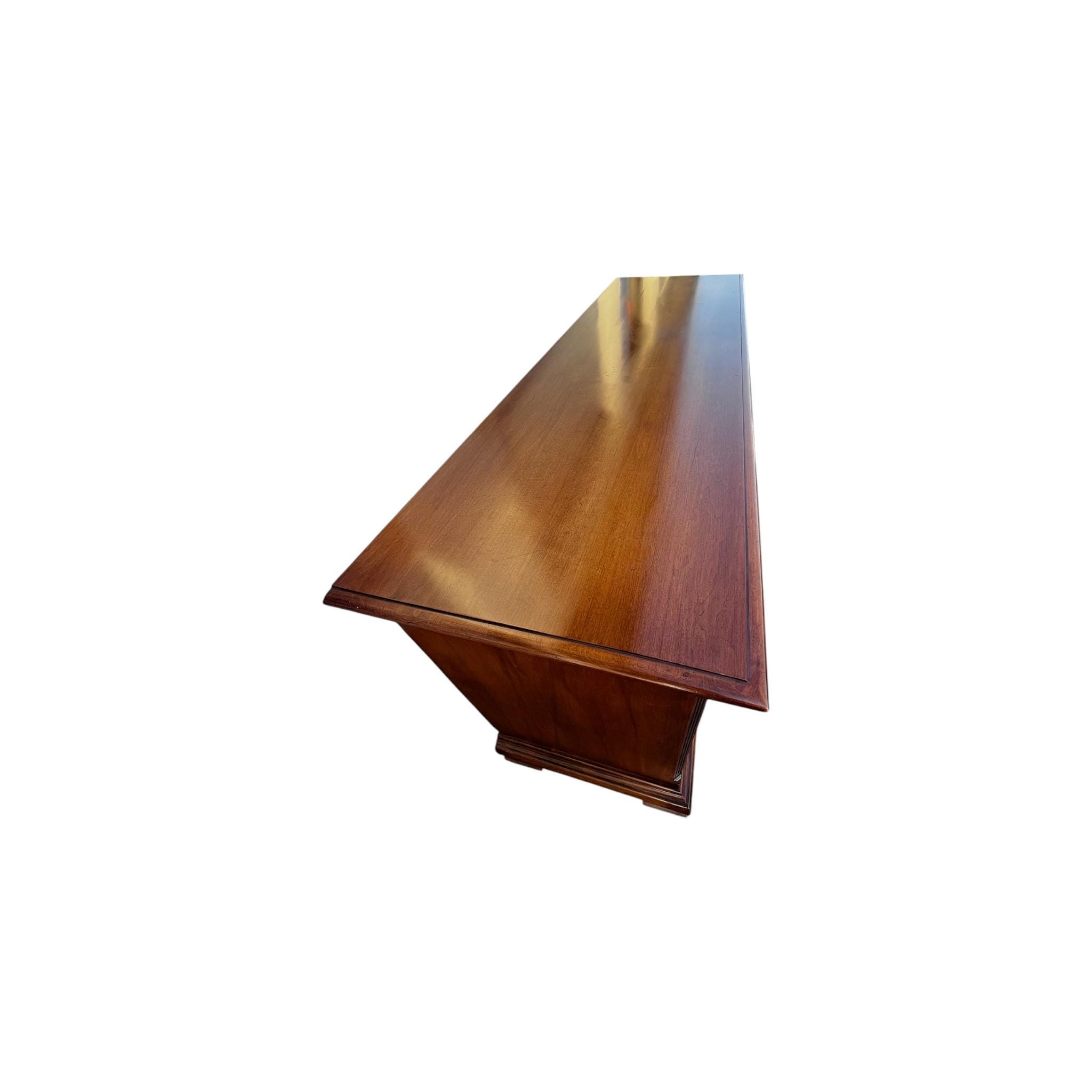 The ETHAN ALLEN Classic Manor 66" Nine Drawer Double Dresser is a traditional style dresser made of wood with a brass handle finish. This rectangular dresser features 9 drawers for storage and is 66 inches wide, making it suitable for adults' bedroom. With a brown color and easy care instructions, this dresser from the Classic Manor Collection of Ethan Allen is a timeless piece that adds elegance to any bedroom decor