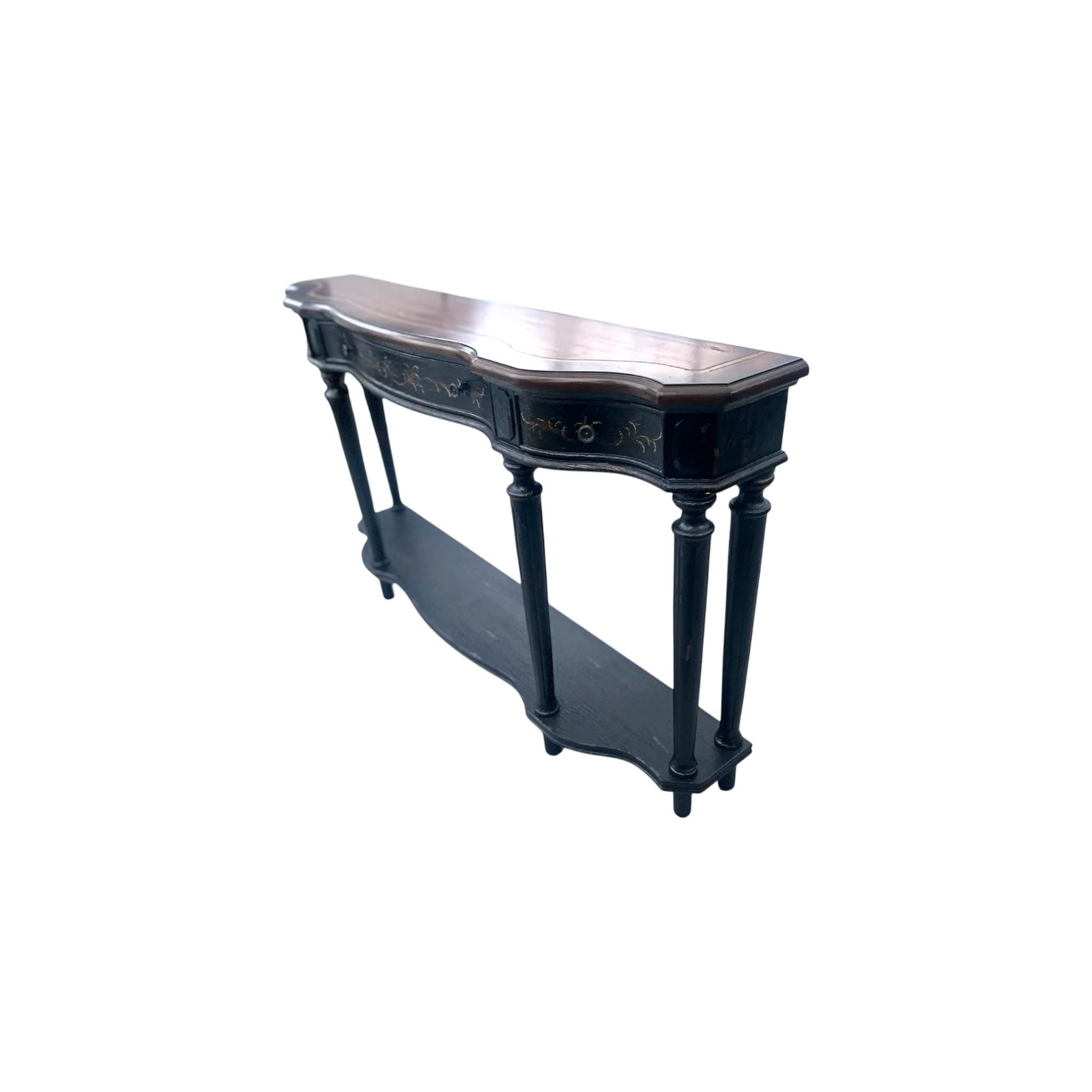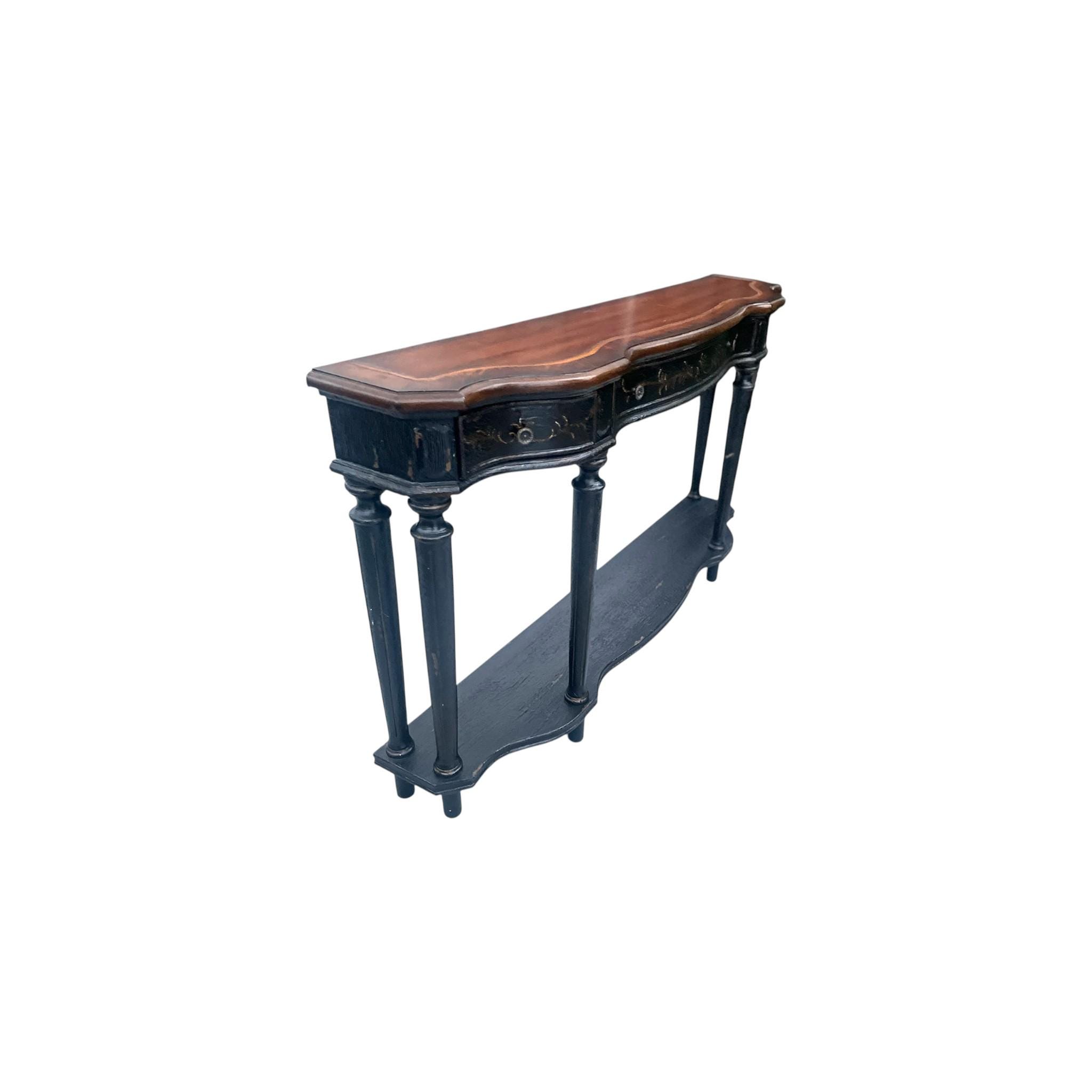 Full of aged detail and handcrafted details, this console table is both elegant and useful. The scalloped shaped top is further enhanced with an inlay look in contrasting wood tones. The three drawers are embellished with hand painted details that add even more interest to the Enonville Texture Black and Brown finish. Elegance continues in the fluted tapered legs and scalloped shaped lower shelf. Ideal for foyers, living rooms, or behind sofas.
