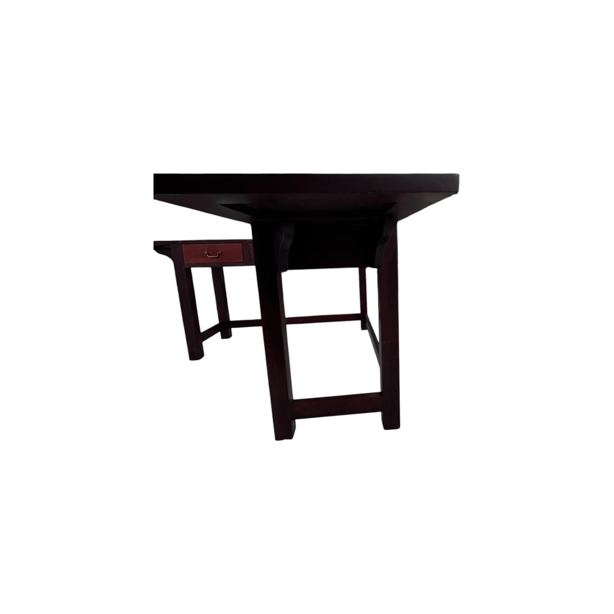 The product is an Amish style two-tone wood corner desk with 3 drawers, featuring a free-standing design and antique appeal. The desk is crafted from wood with a brown color, reflecting the Arts & Crafts/Mission style of American design. This desk offers both functionality and aesthetics, making it a unique and charming piece of furniture for any home or office setting.