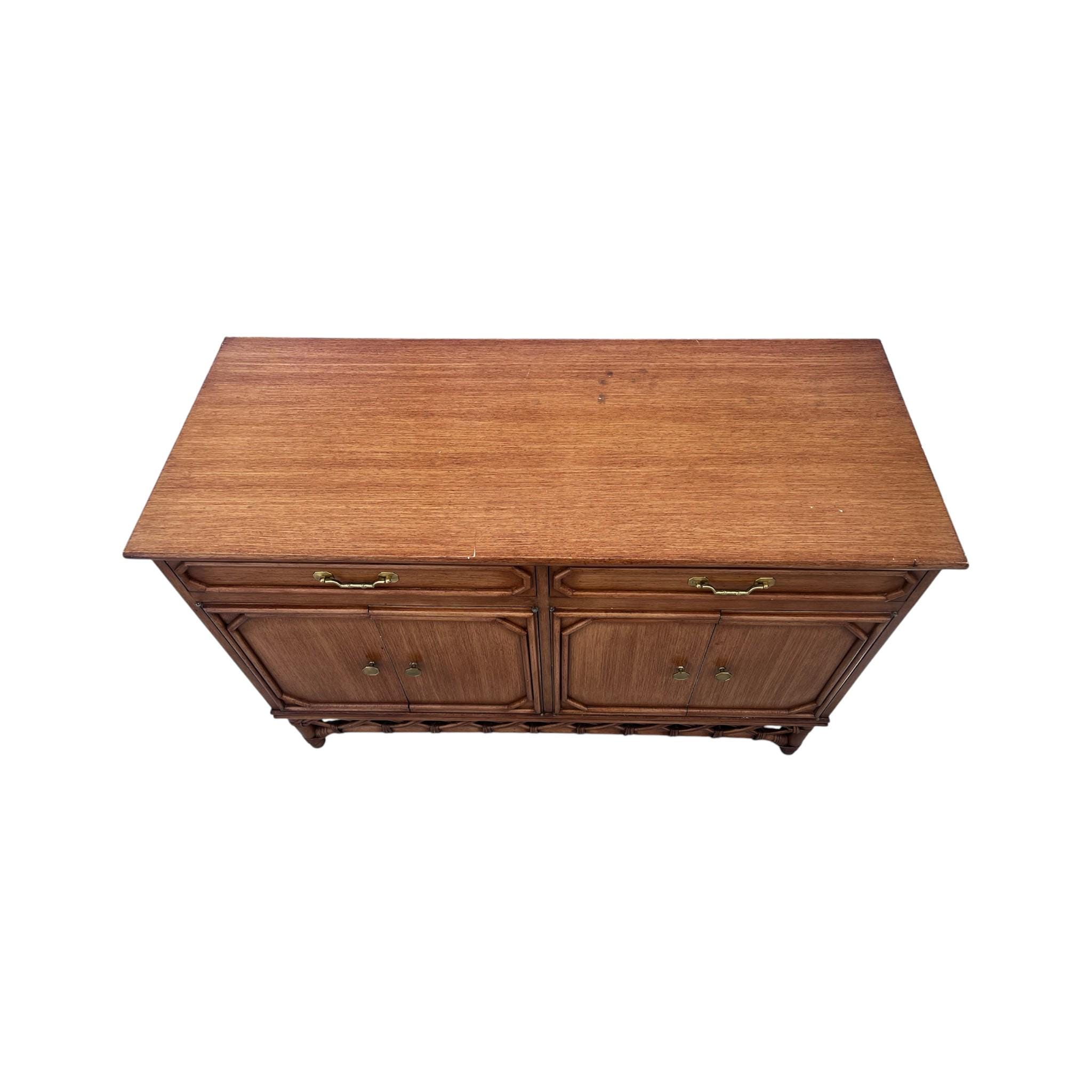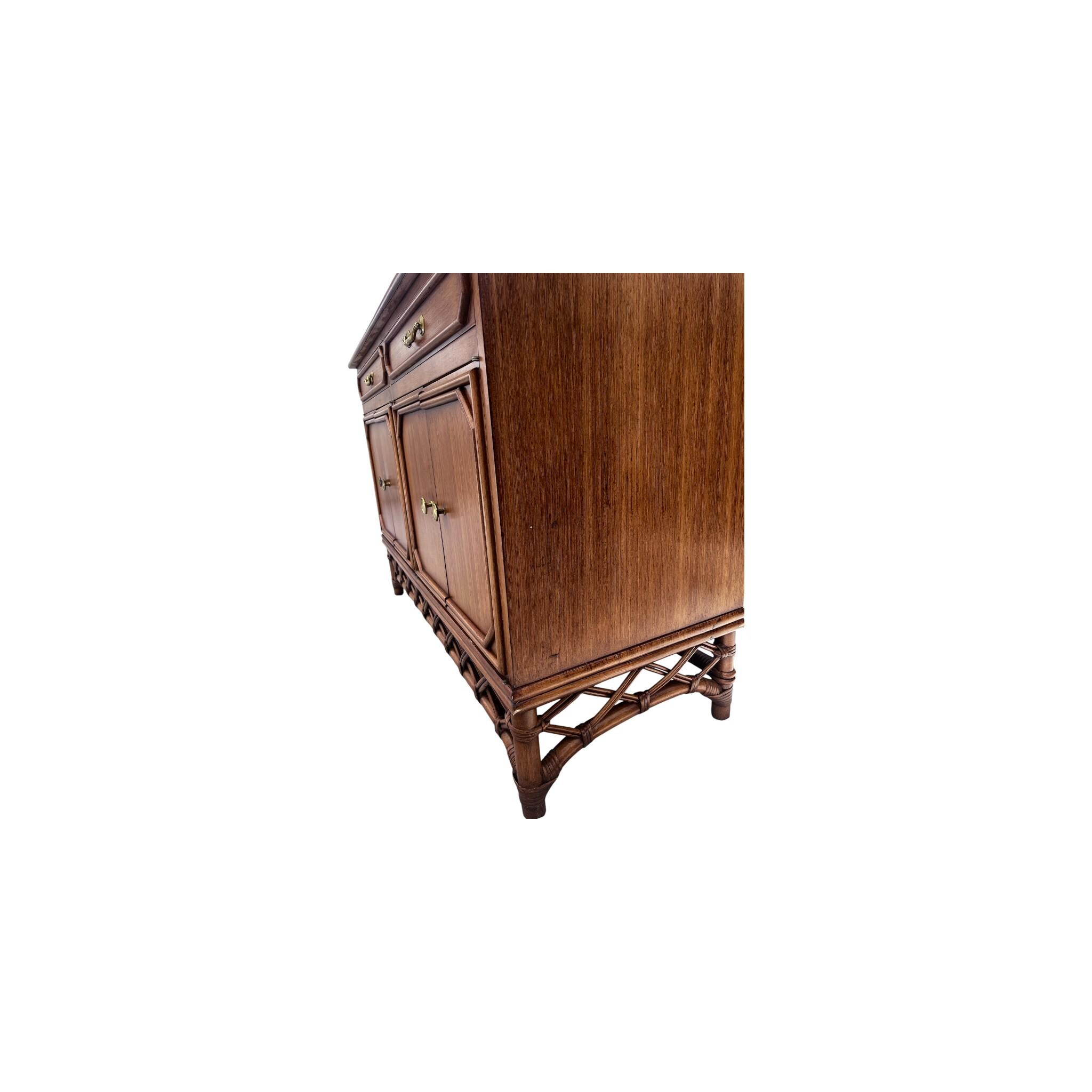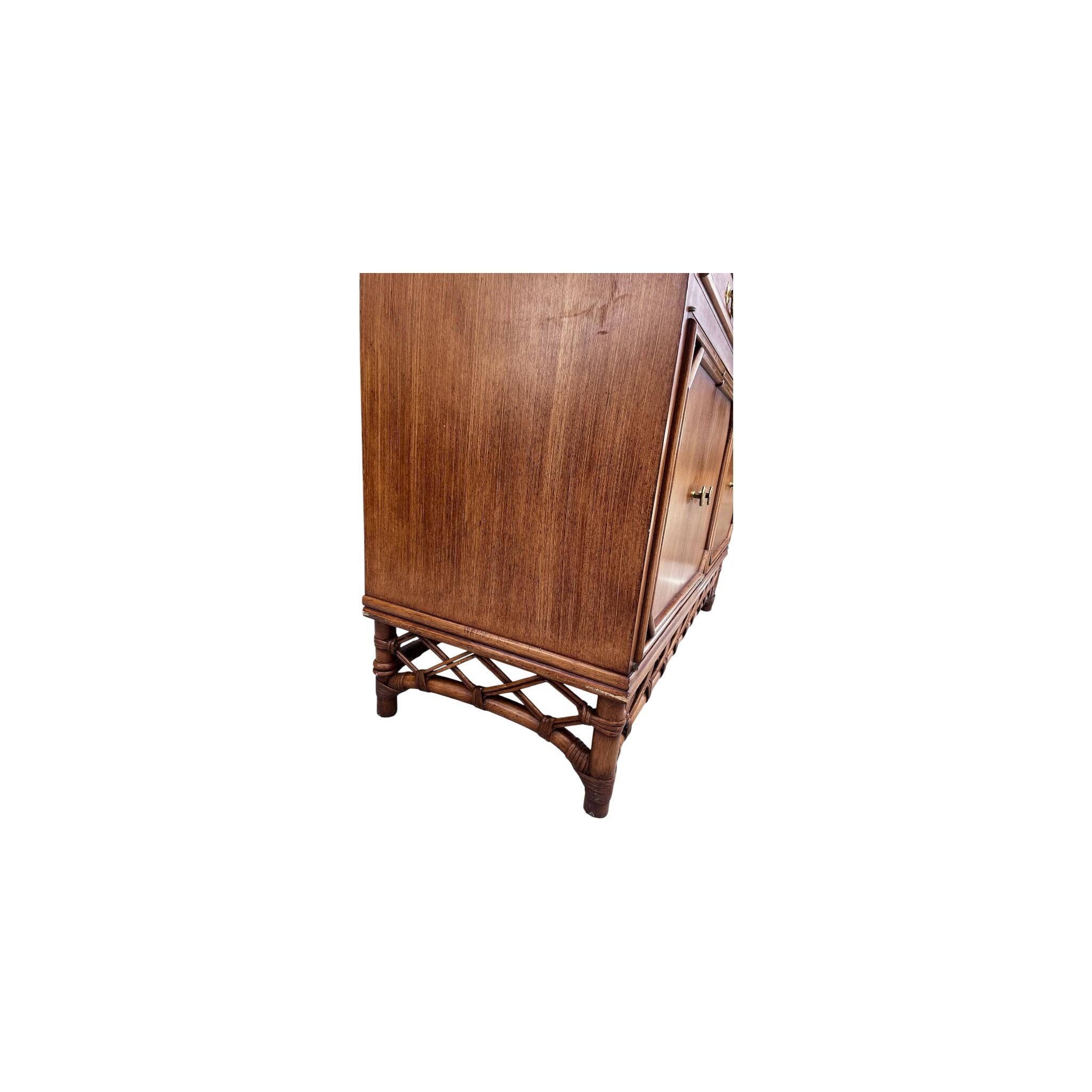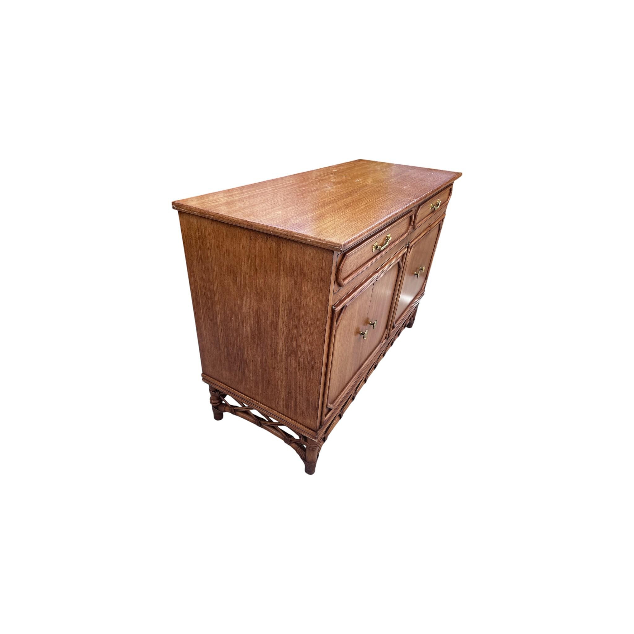 One side was personalized with a pull-out file drawer while the other one remained as an original shelf. Missing the Ficks Reed sticker. Shelves are removable.