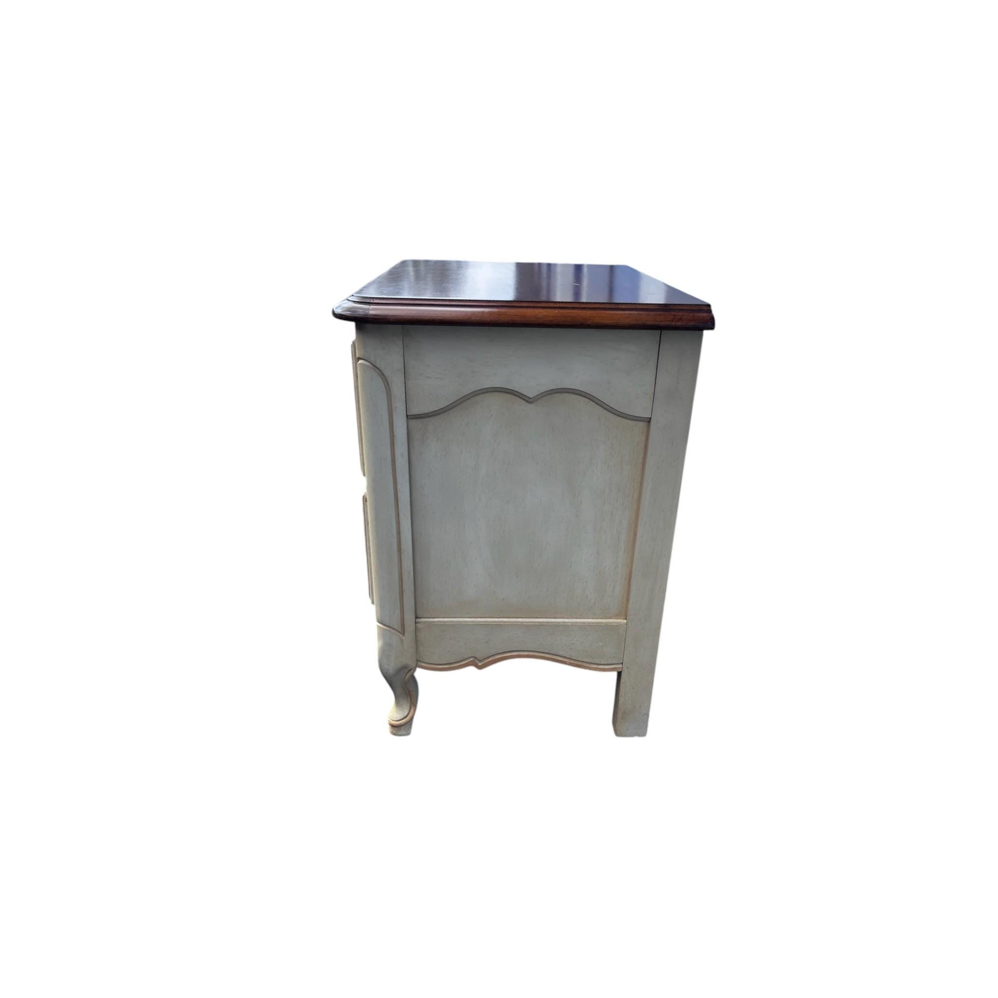 The Dixie French Provincial 2 Drawers Nightstand is an antique piece with a French style design, featuring a rectangular shape and two painted beige/brown tones. Made of wood with brass handles, this nightstand is free-standing and requires no tools for assembly. Perfect for teens, boys, adults, girls, and unisex kids, this original mid 20th-century piece adds a touch of vintage charm to any bedroom.