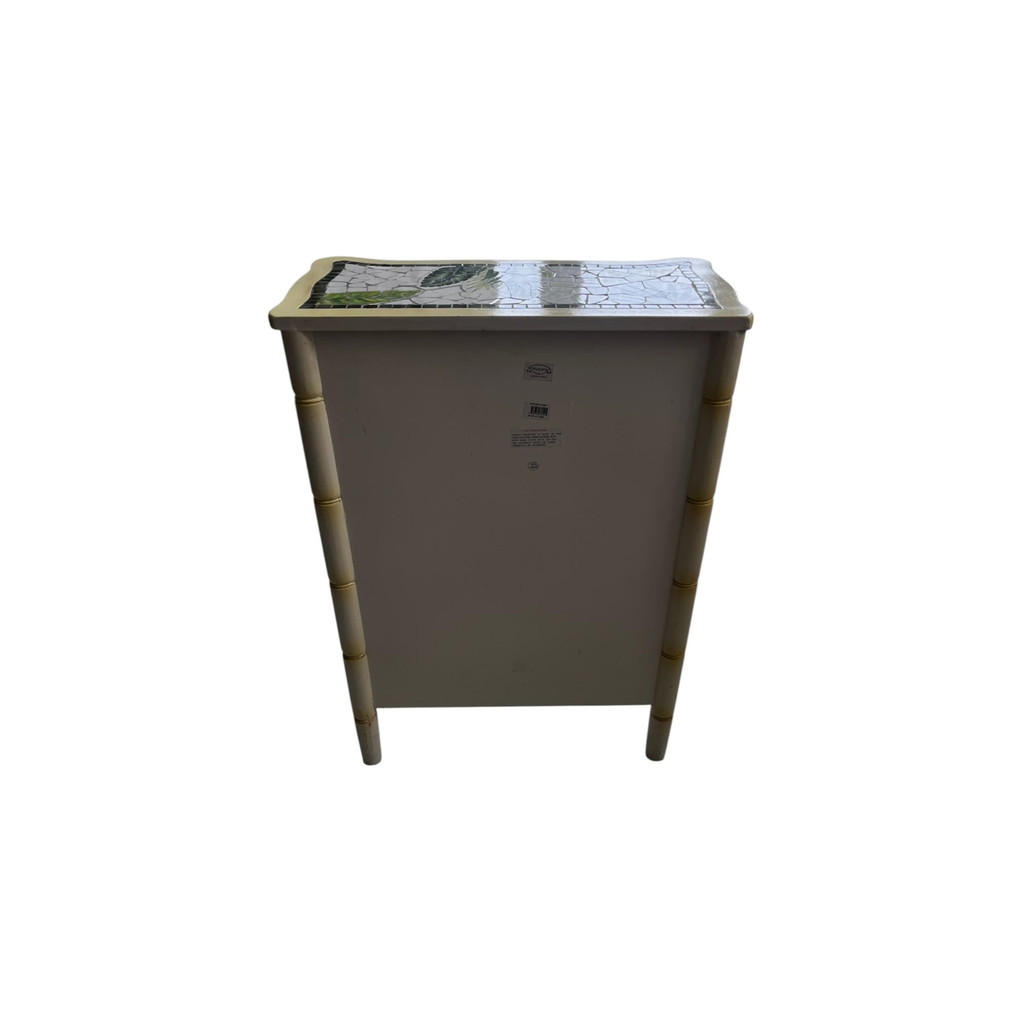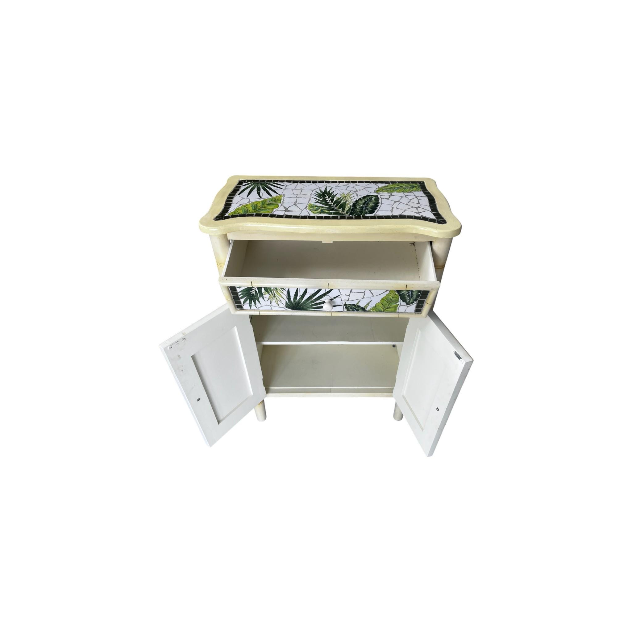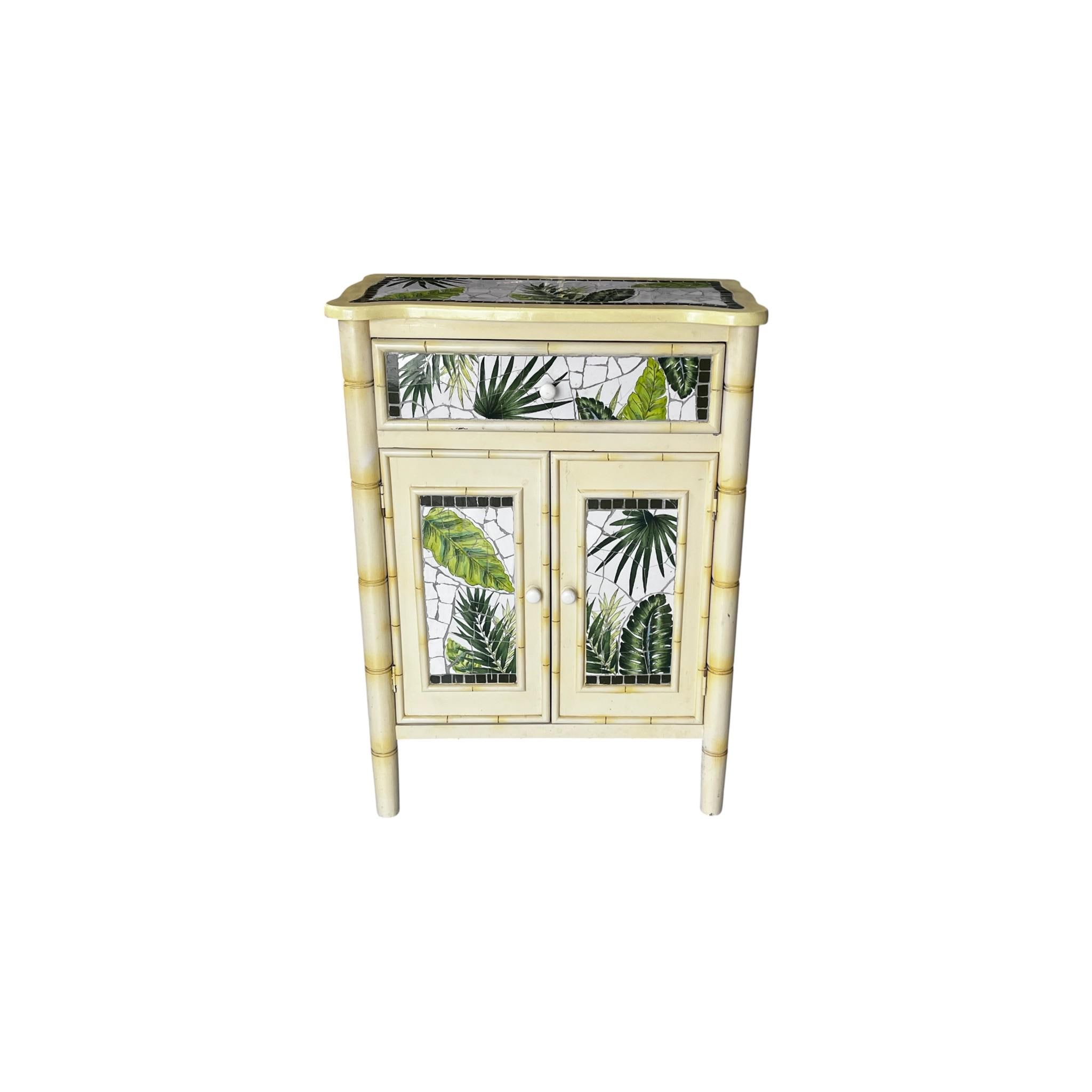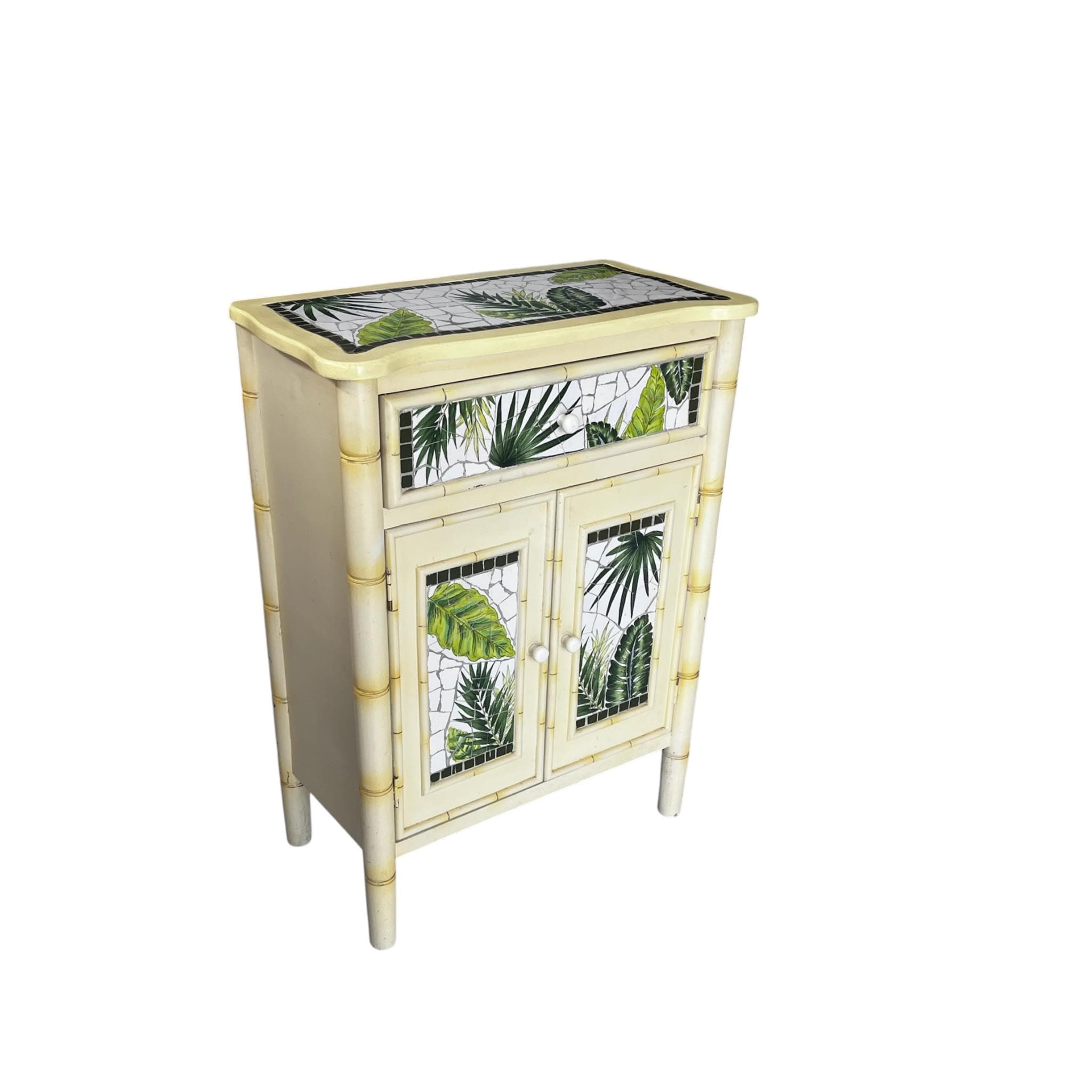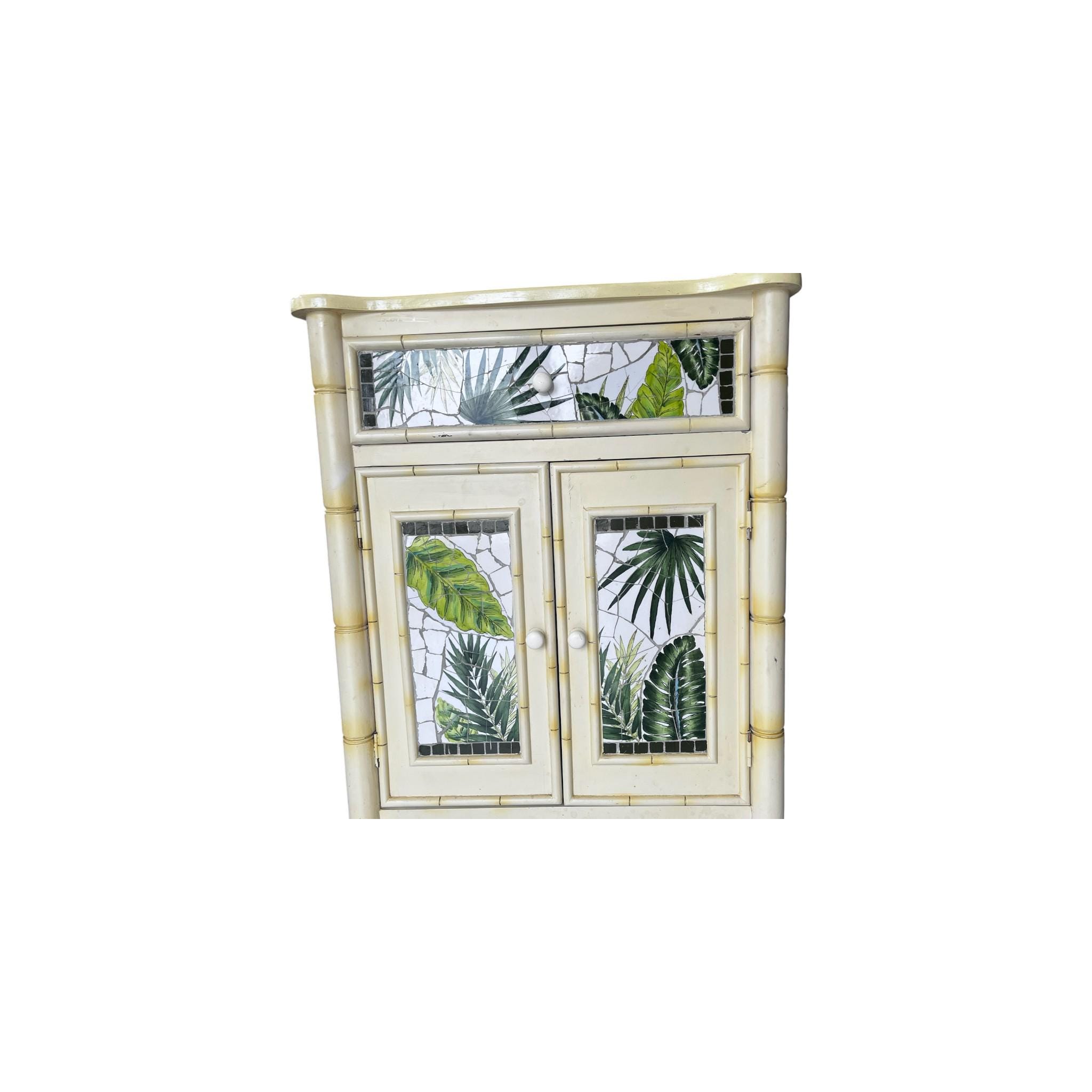 The Faux bamboo Cracked ceramic tile foyer cabinet by Maxcera is a stylish and elegant addition to any home. This free-standing cabinet features a tropical design with a unique cracked ceramic tile accent. With one shelf and one drawer, this cabinet provides functional storage while adding a touch of sophistication to any space. The cabinet stands at 35 inches tall, 14 inches long, and 26 inches wide, making it a versatile piece for any home or garden setting.