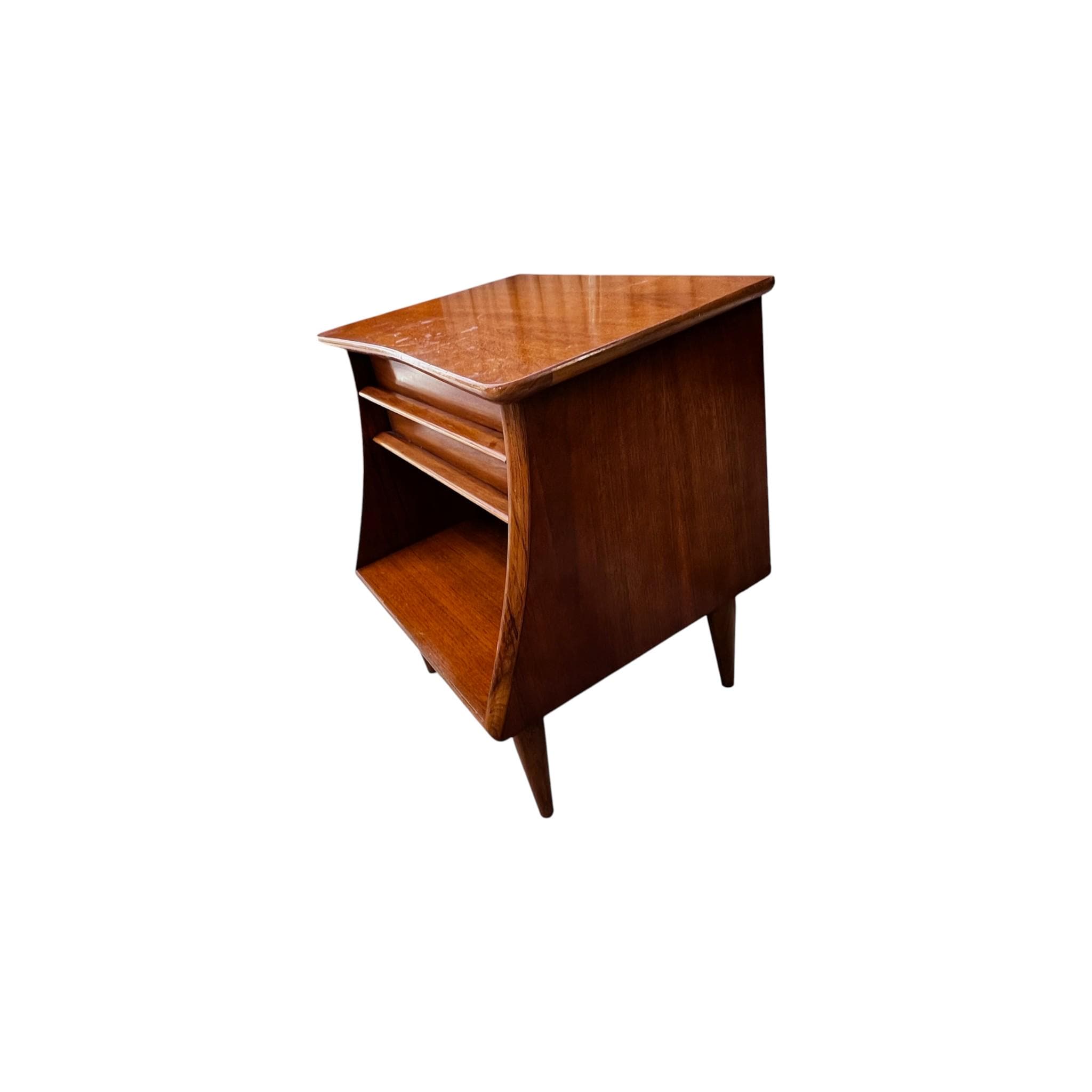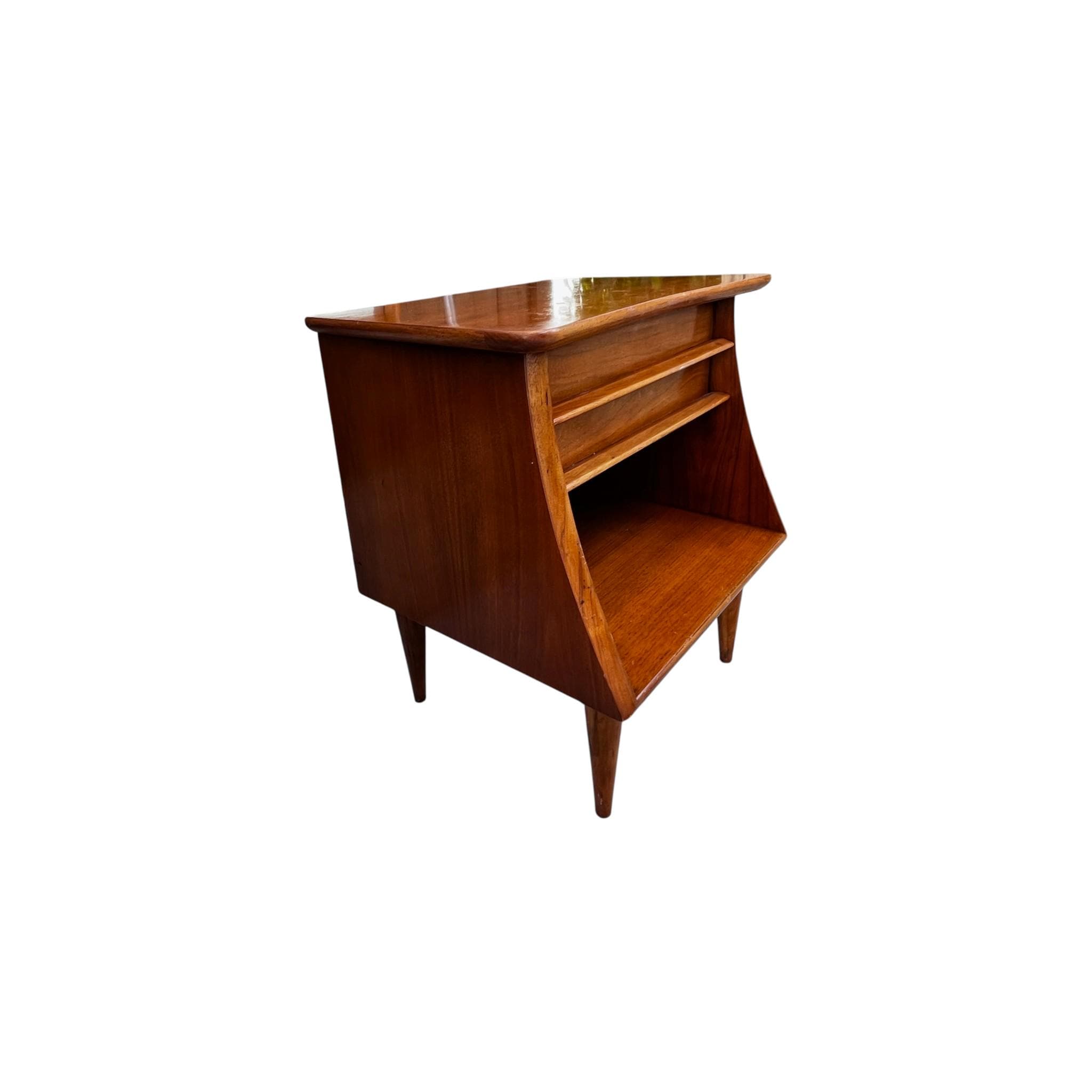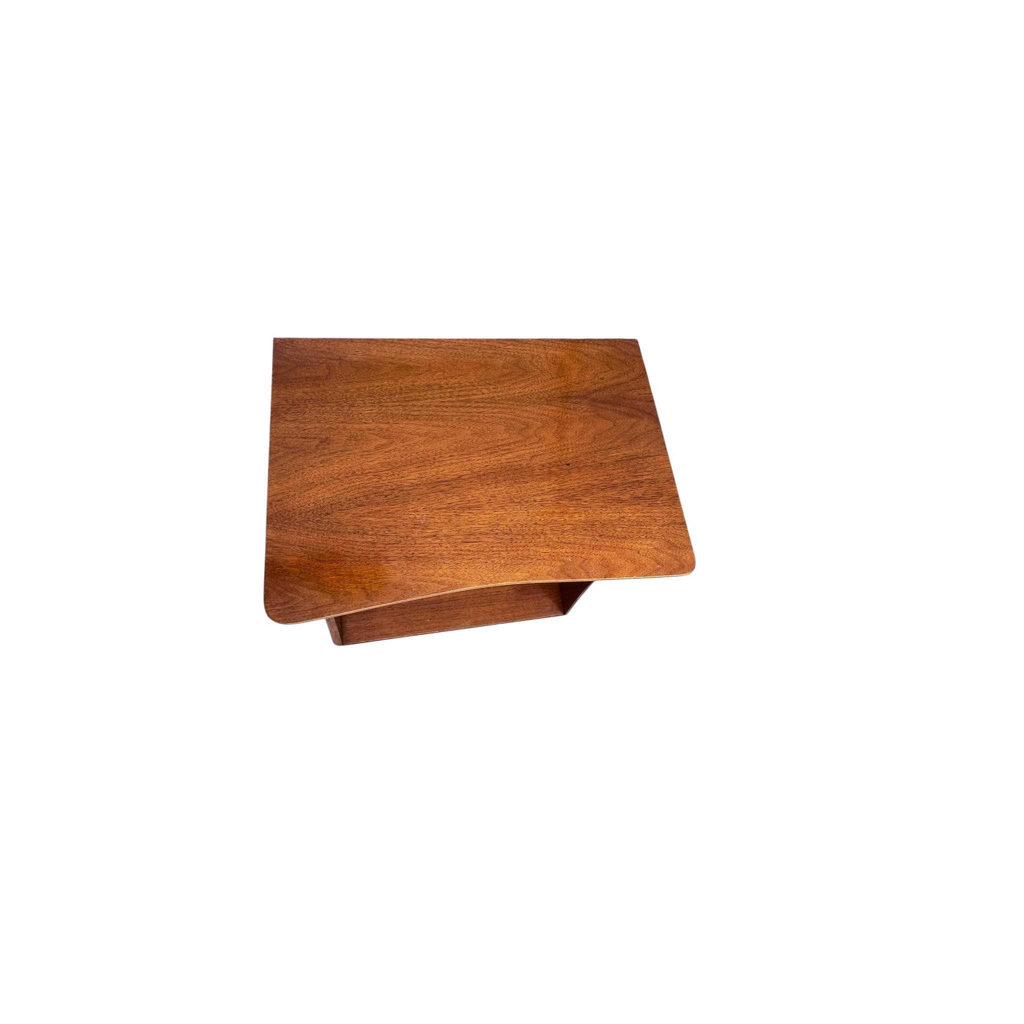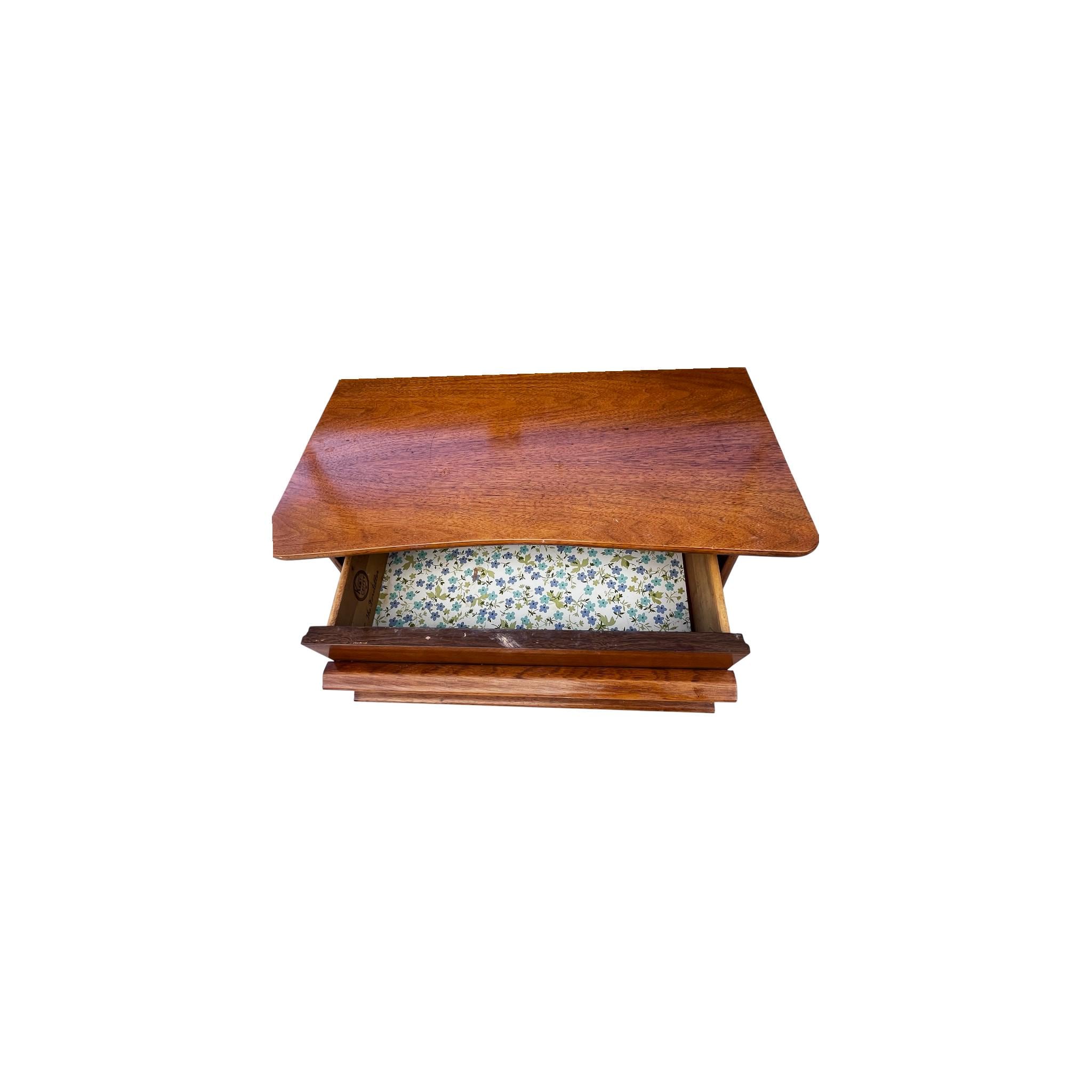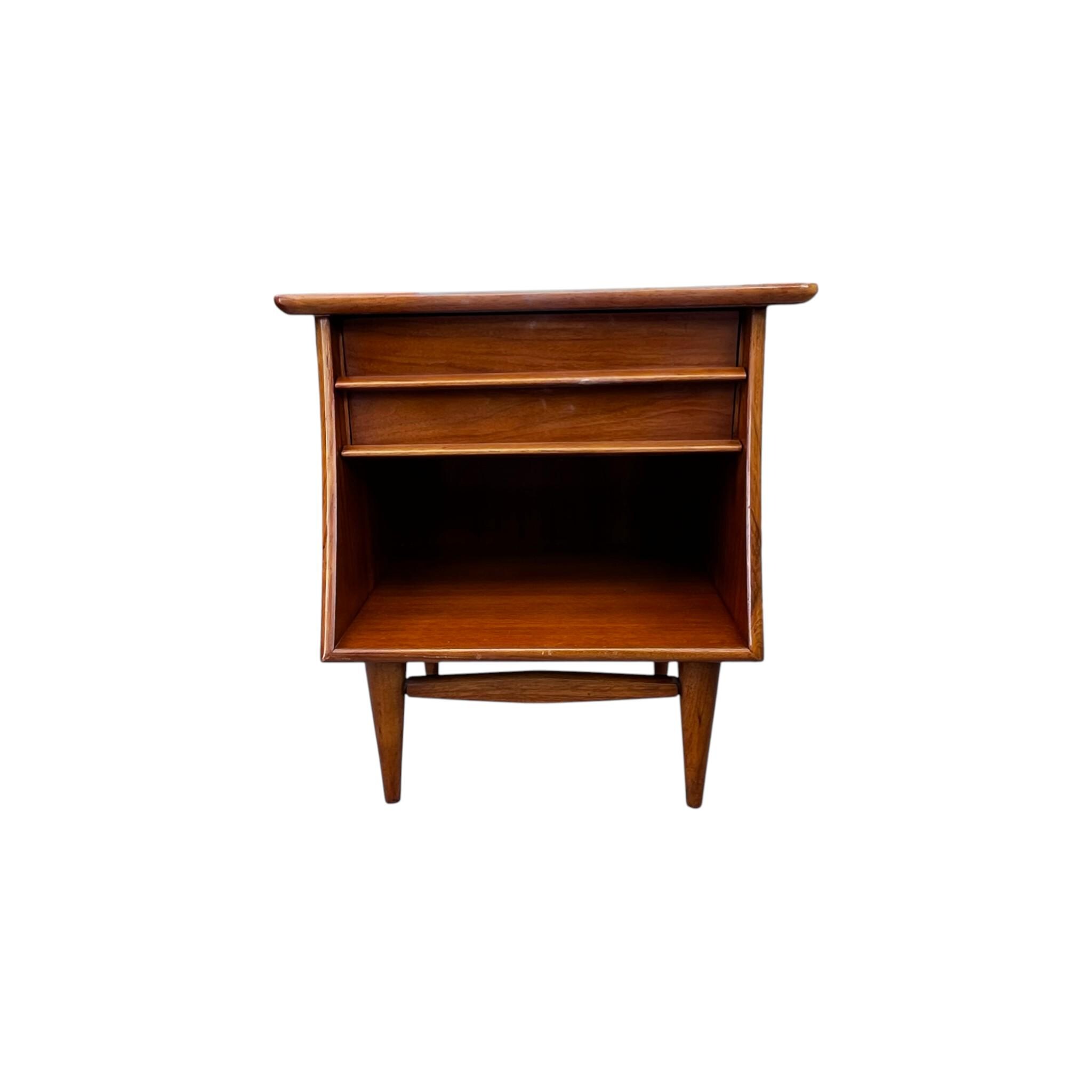 The simple yet stylish mid-century design of this walnut nightstand uses clean modern lines, sculptural wooden drawer pulls, and a vintage walnut finish to make this the perfect addition to any interior. From the Kent Coffey “Foreteller” line, this stunning single drawer end table offers an ideal mix of storage and style for bedside use.