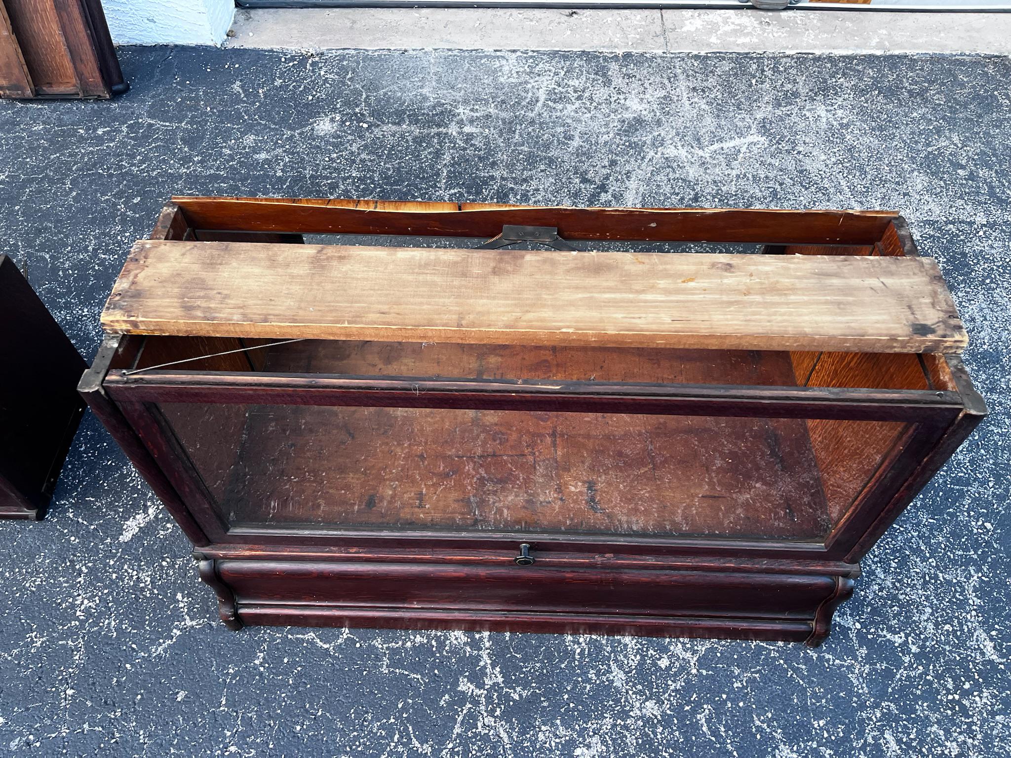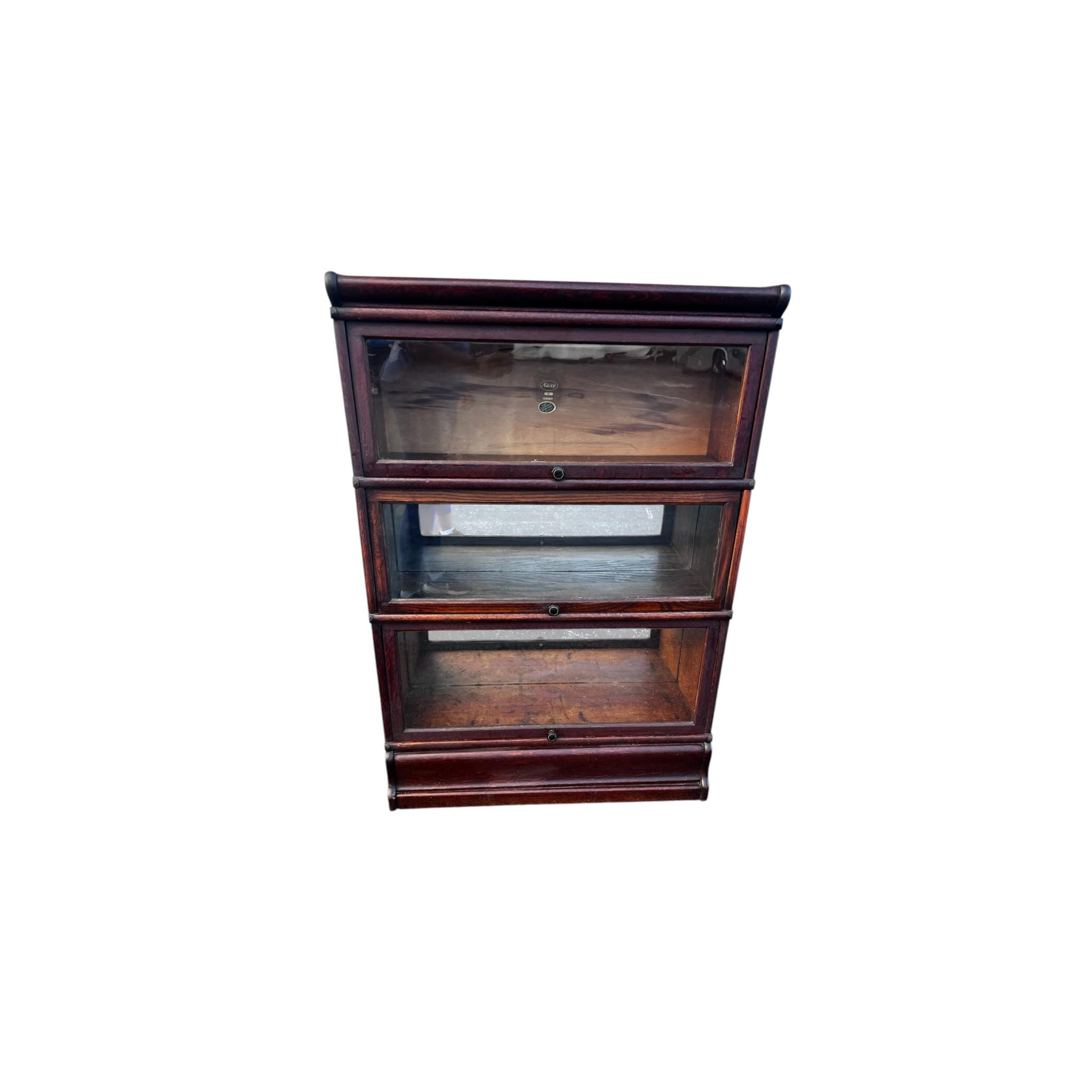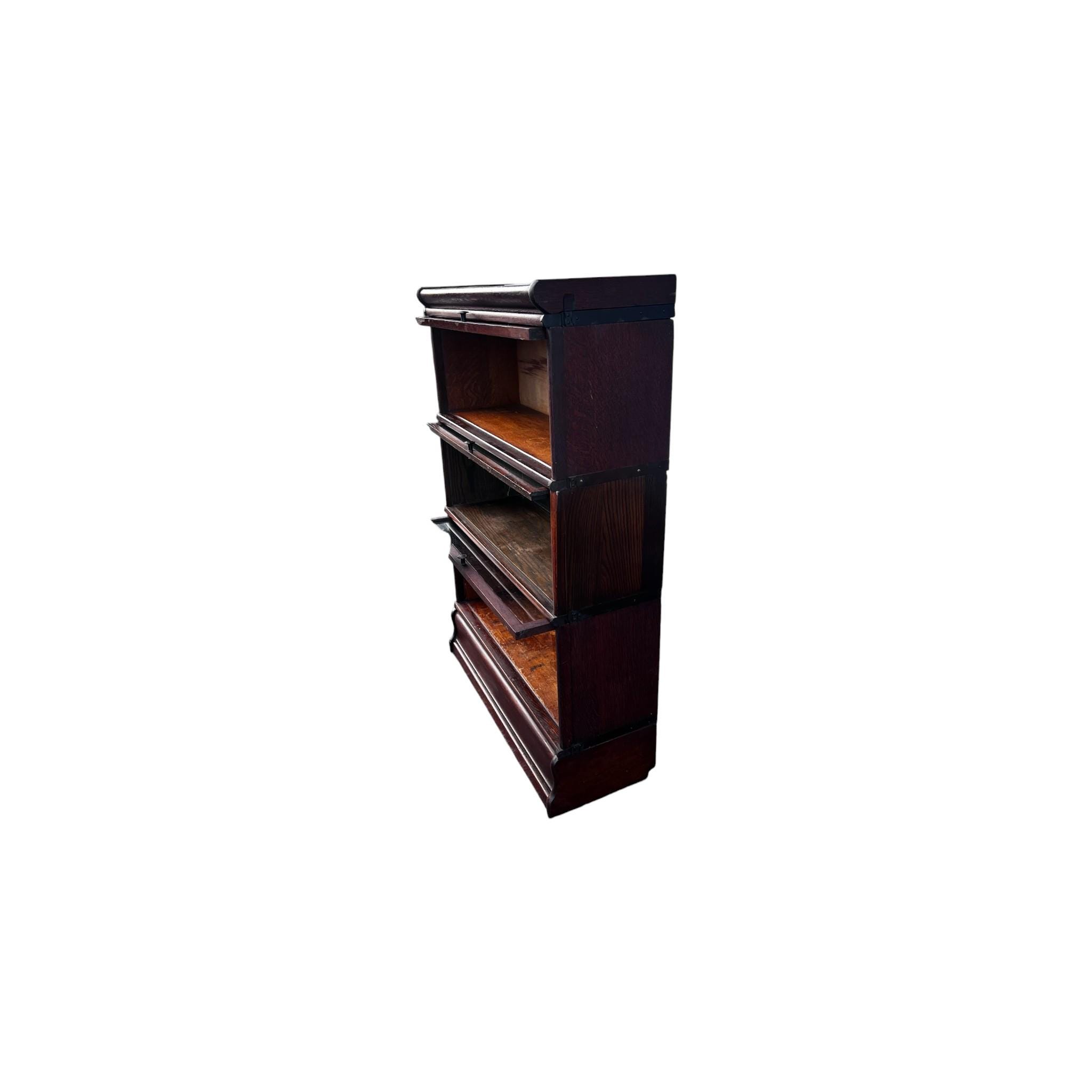 An antique Macey lawyer's or barrister's bookcase with copper flashed bands on the sides and glass doors that open and slide in from the top. . The whole piece is modular consisting of 5 pieces: the top, the bottom and four cabinets that all interlock.