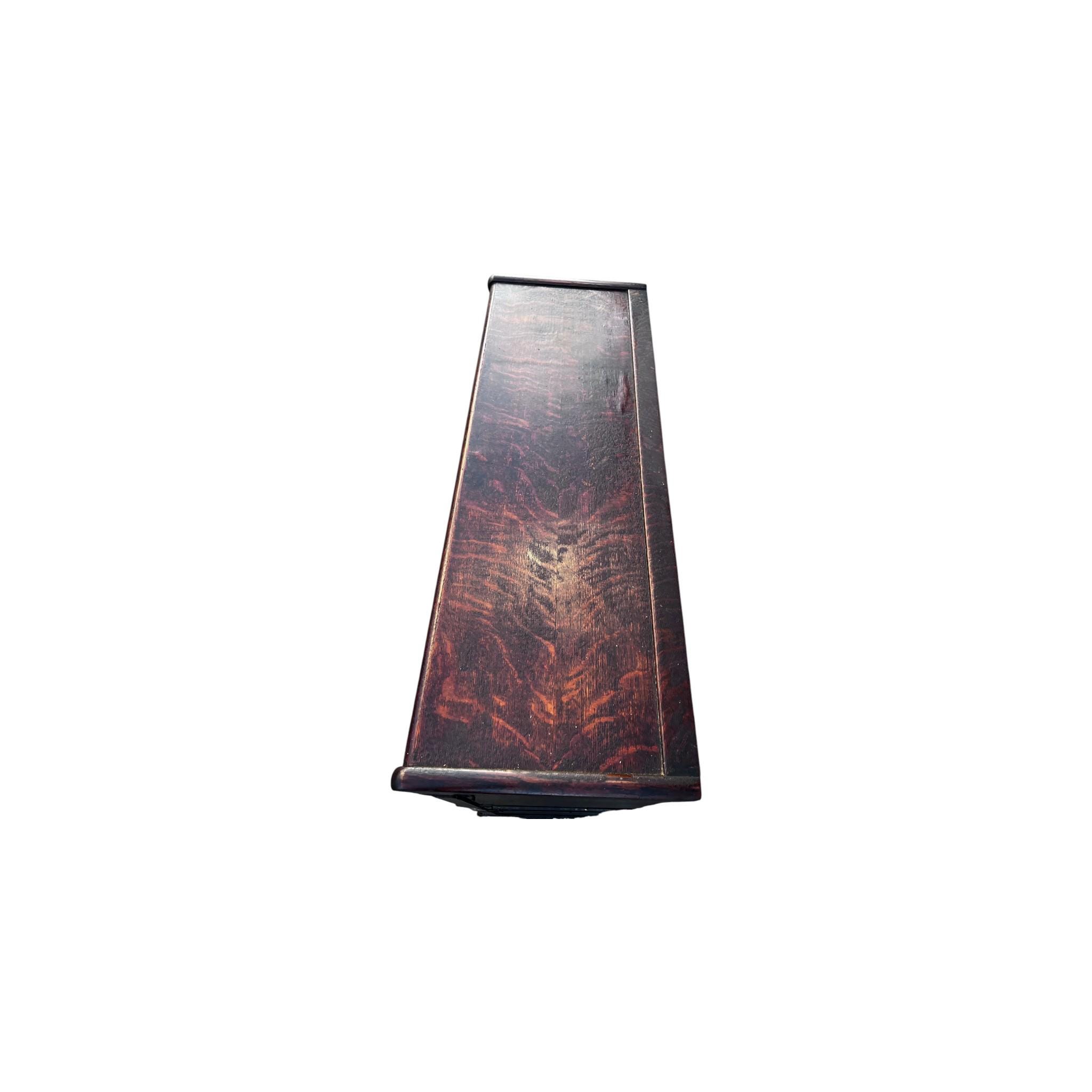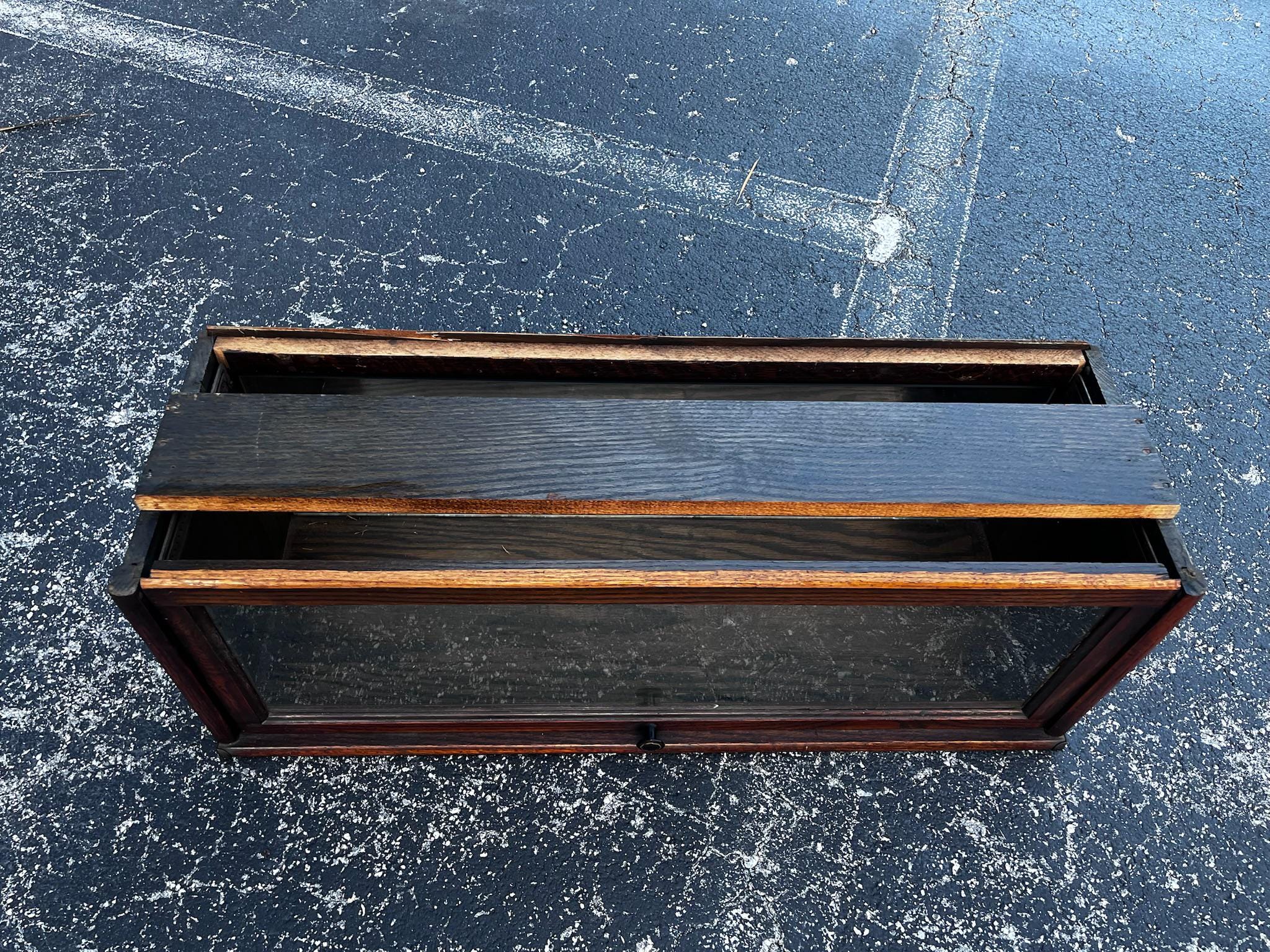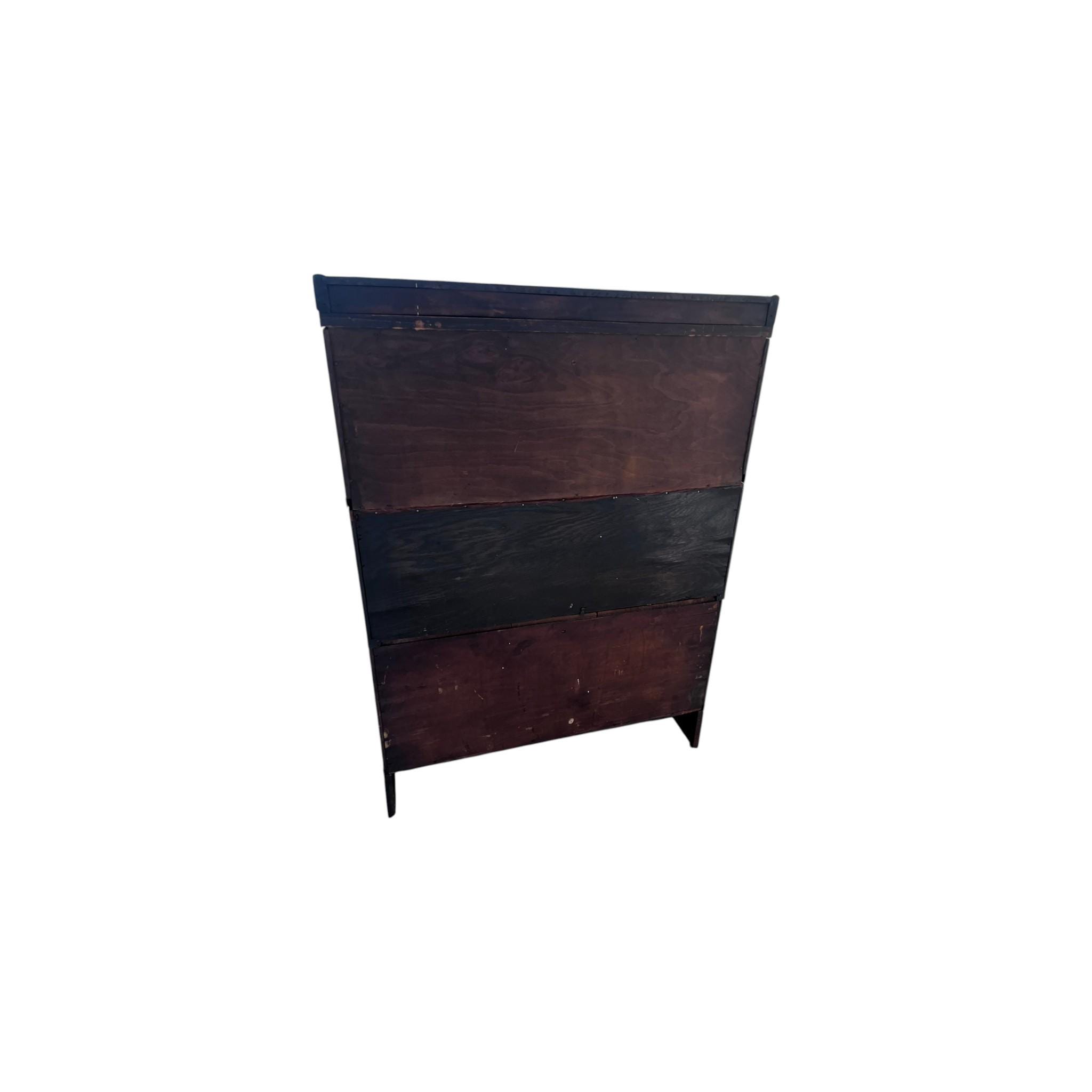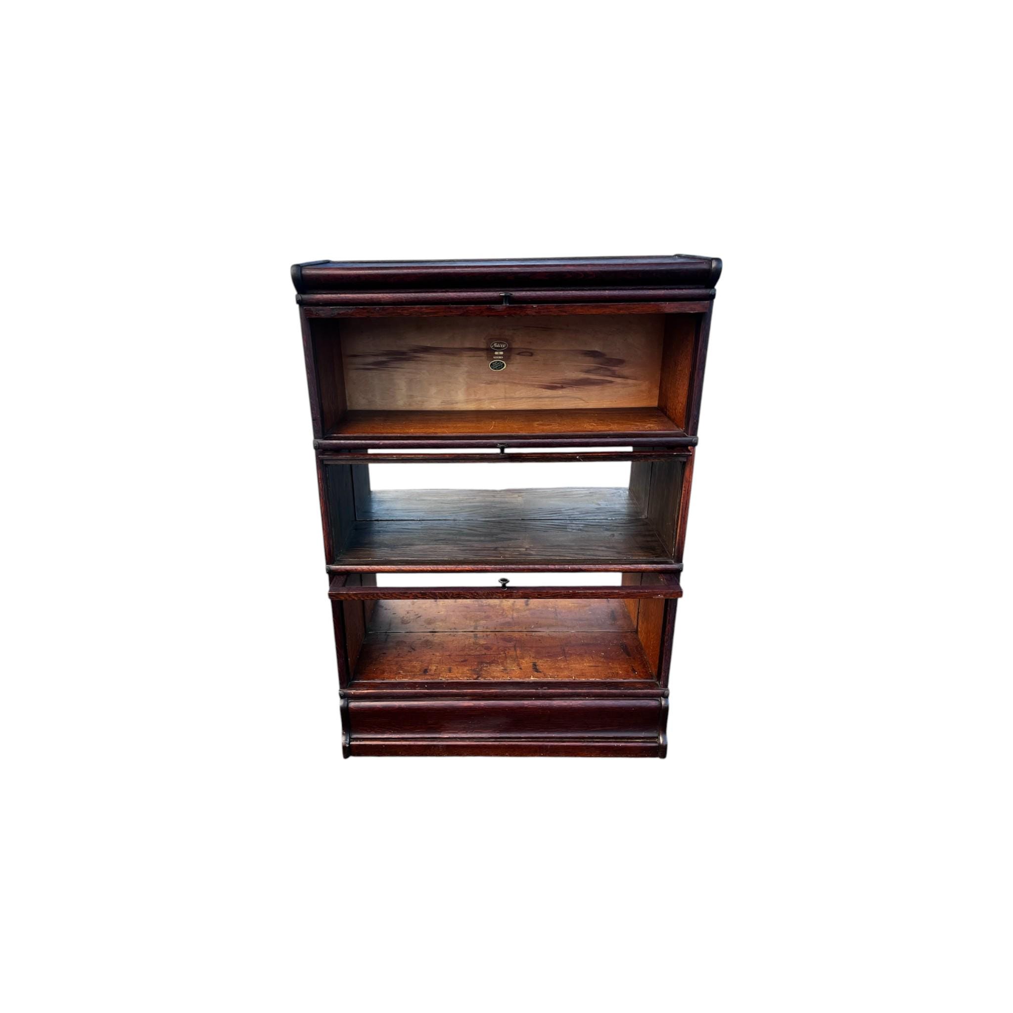 An antique Macey lawyer's or barrister's bookcase with copper flashed bands on the sides and glass doors that open and slide in from the top. . The whole piece is modular consisting of 5 pieces: the top, the bottom and four cabinets that all interlock.
