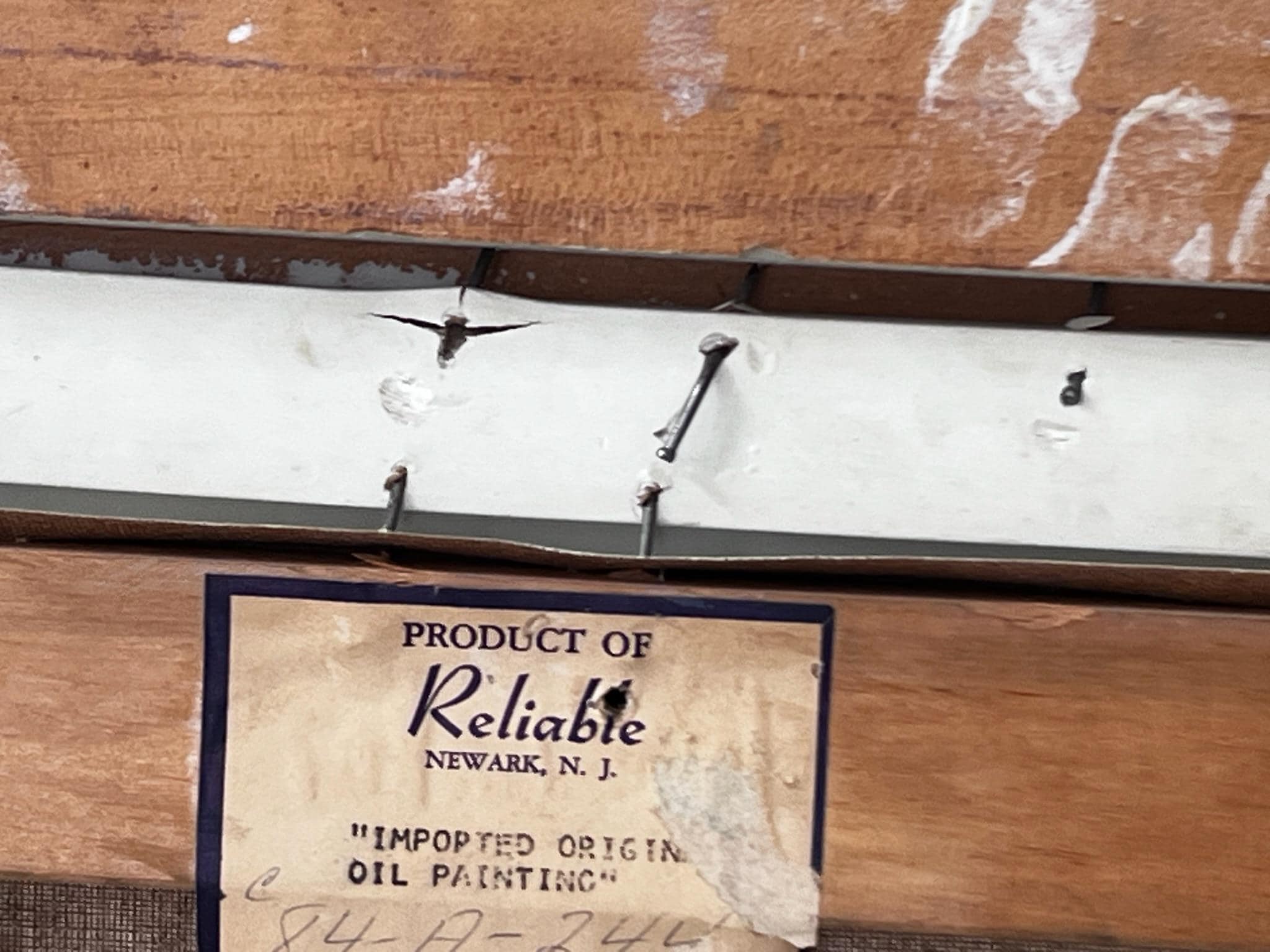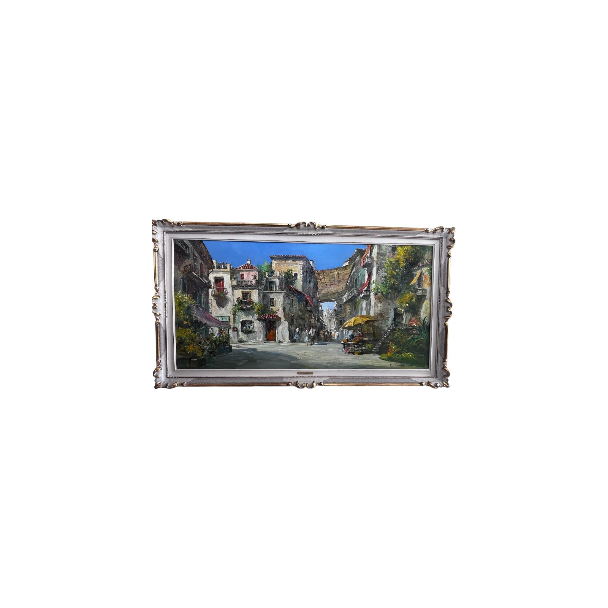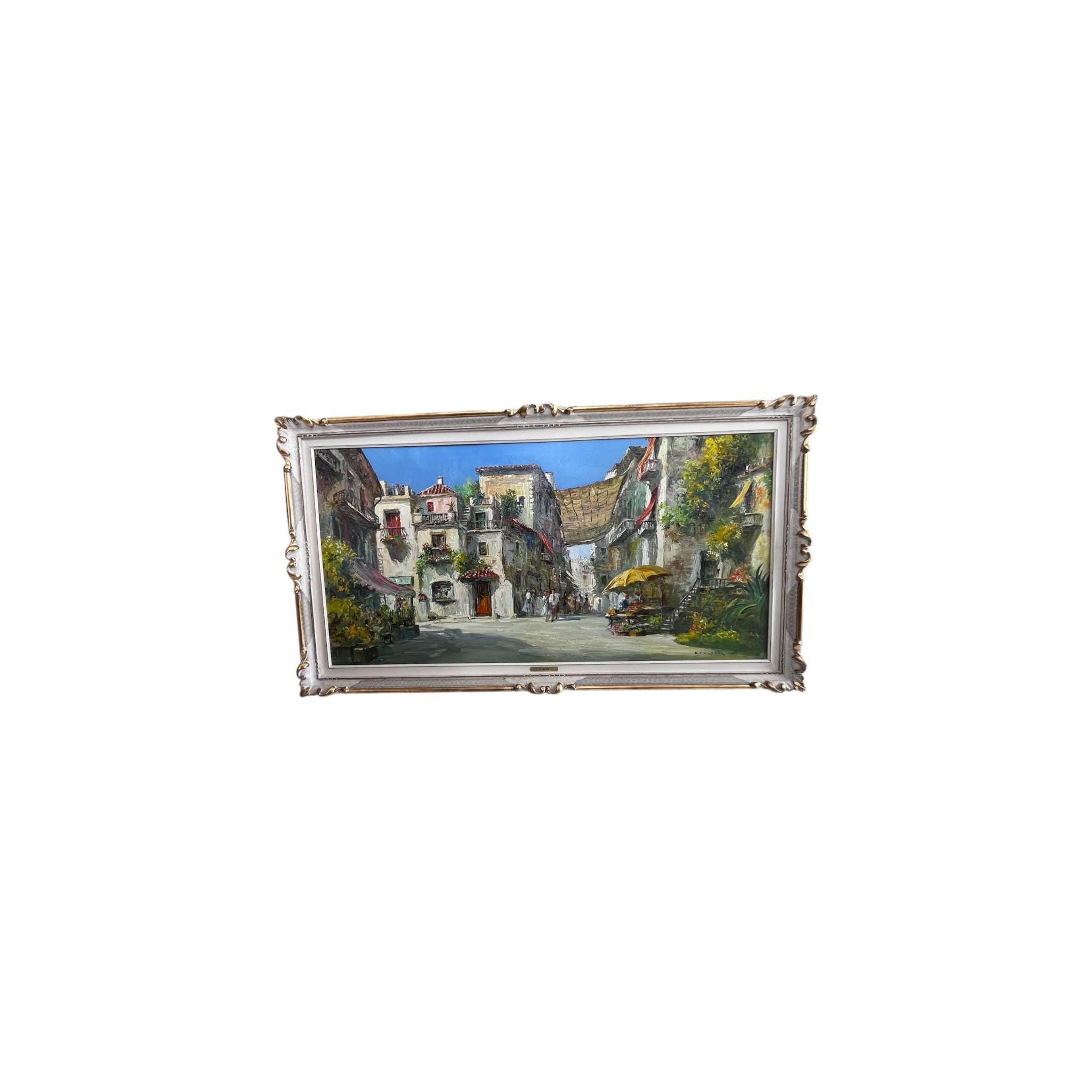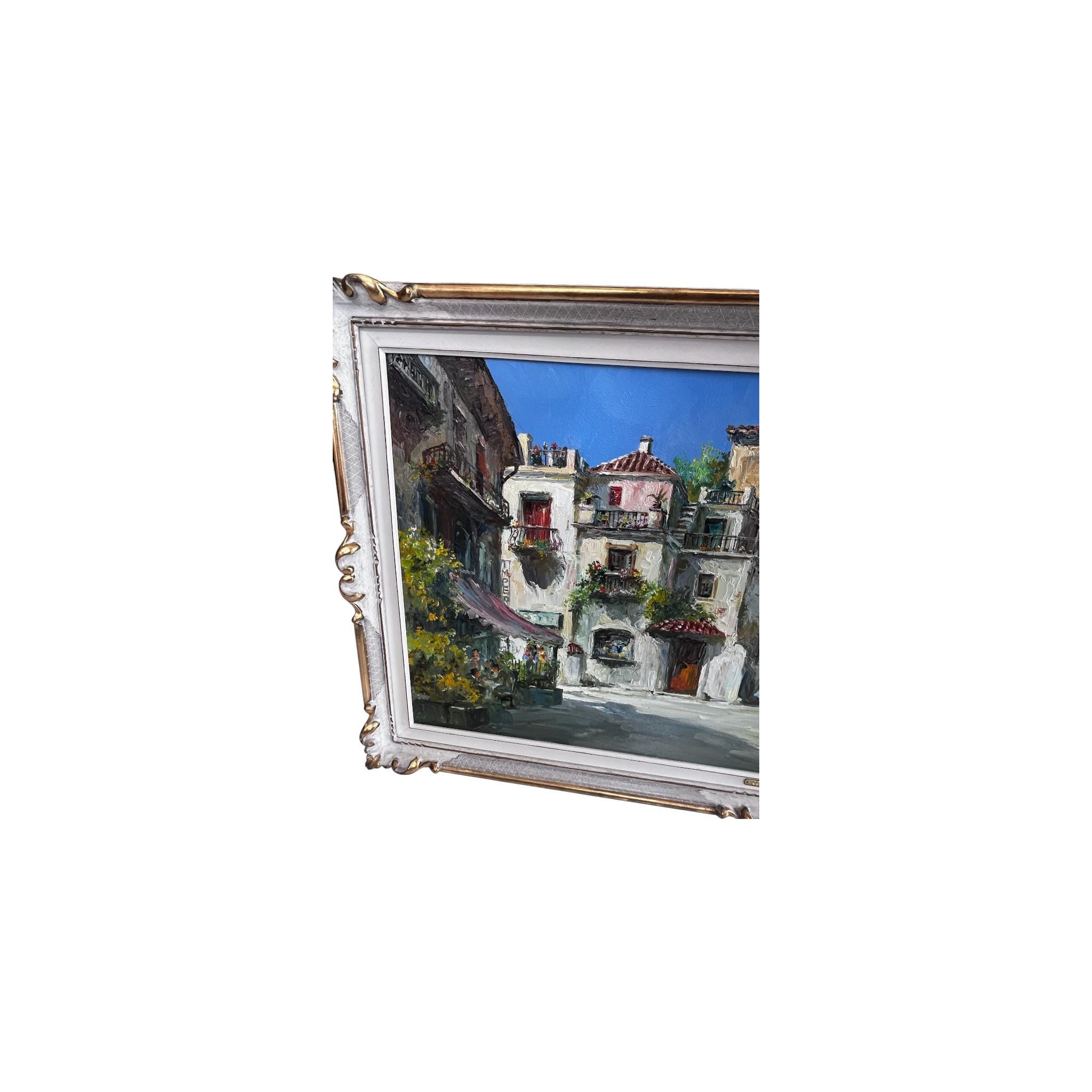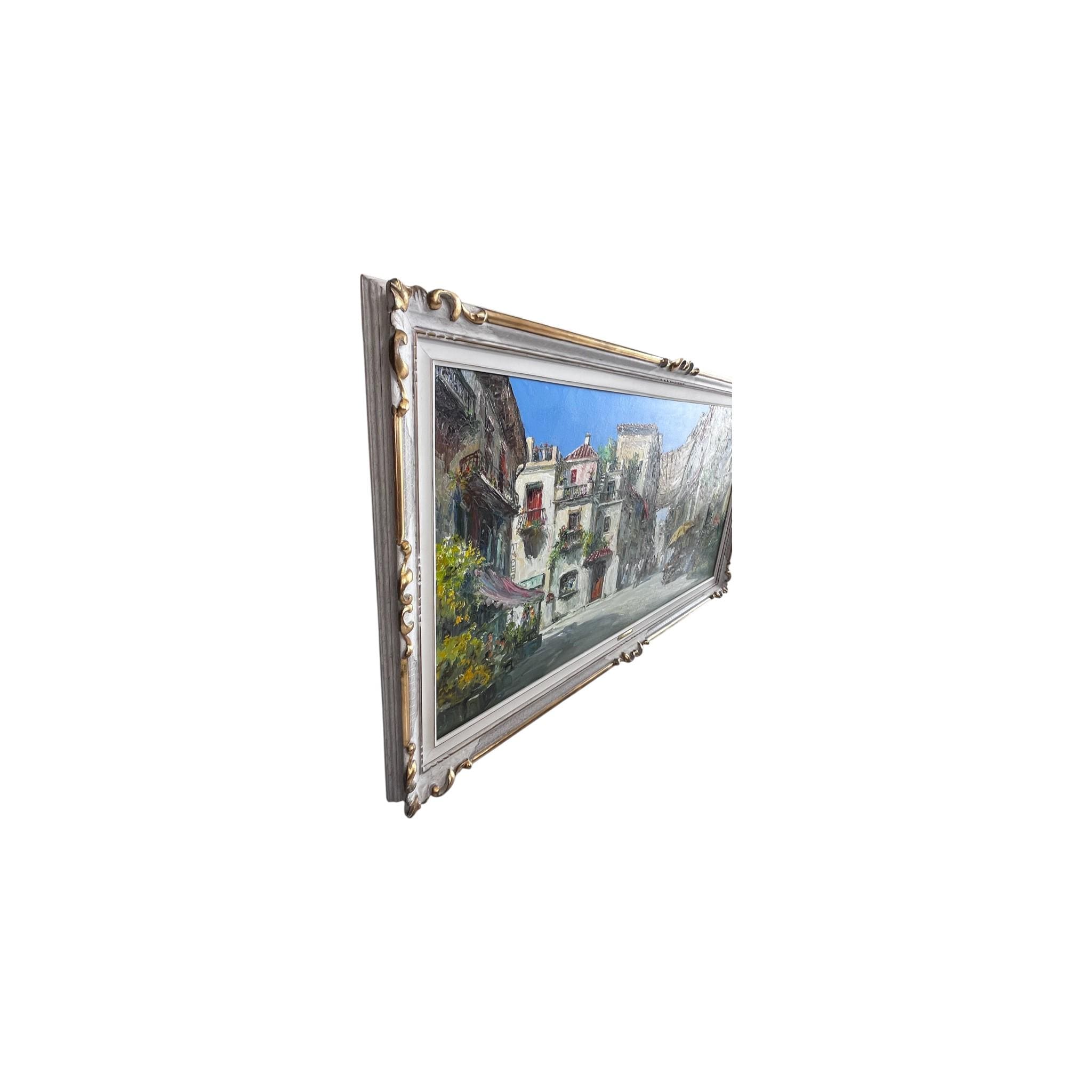 Created with oil on canvas, it has been mounted in a gold and white washed carved wooden frame with a hanging wire attached to the reverse side.