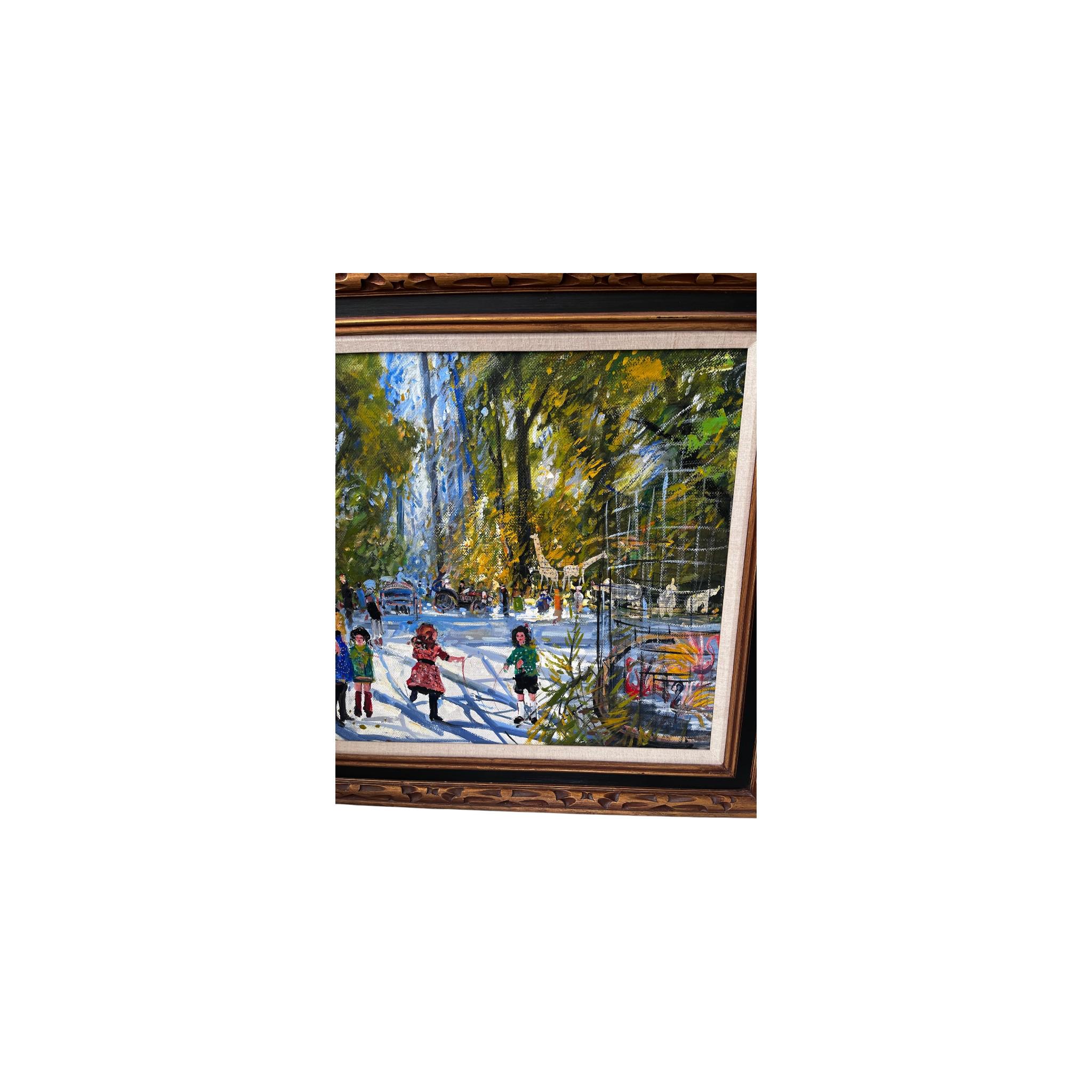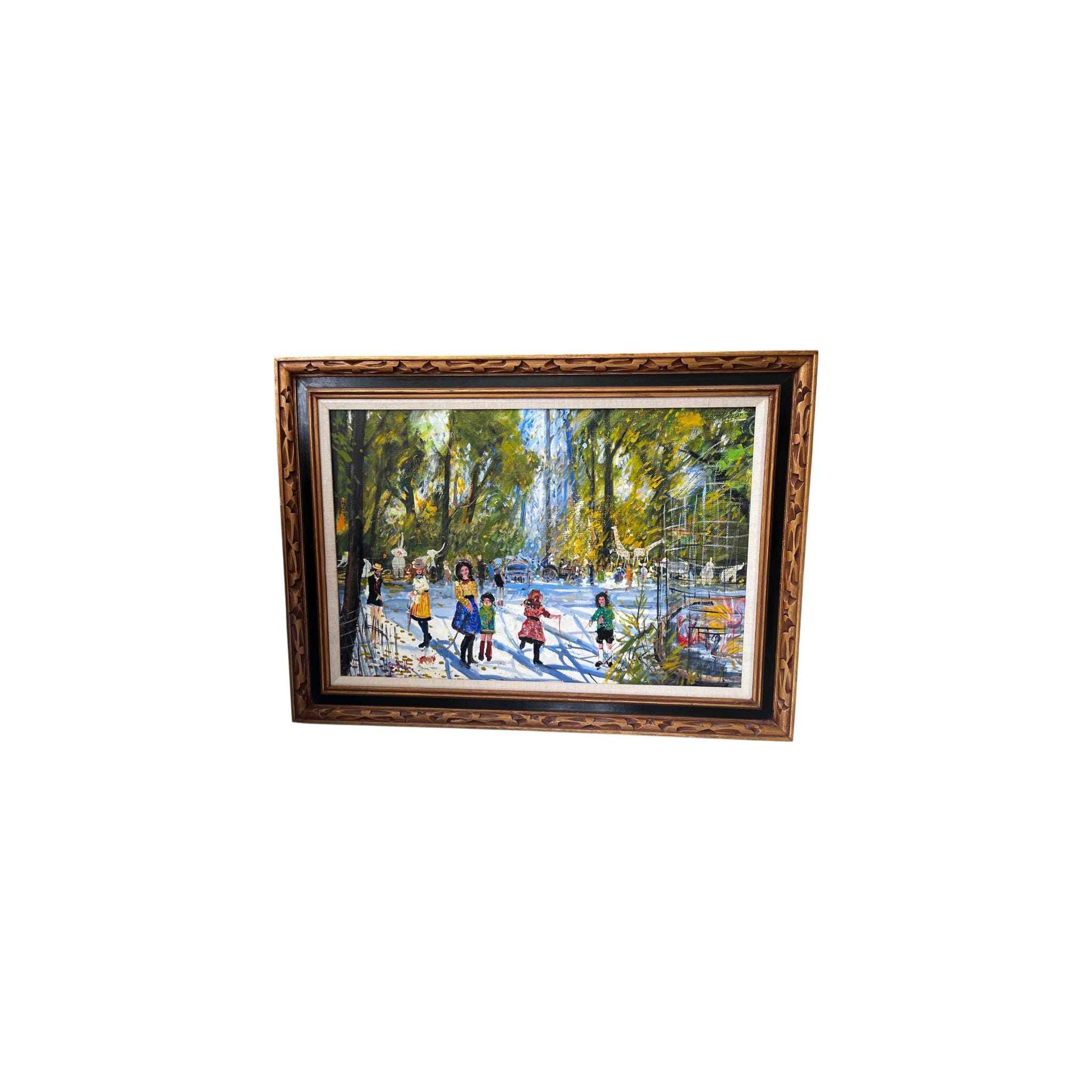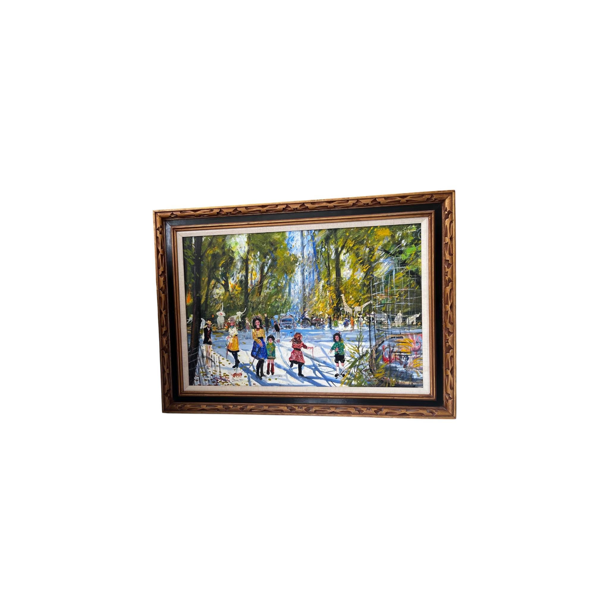 Vibrant impressionist park scene featuring children in colorful dresses walking along a sunlit path with trees, carriage, and whimsical animal figures in the background; heavy brushwork with textured palette knife detailing; oil on canvas; housed in ornate carved wood frame with linen liner; appears mid-century (circa 1950s-1970s)