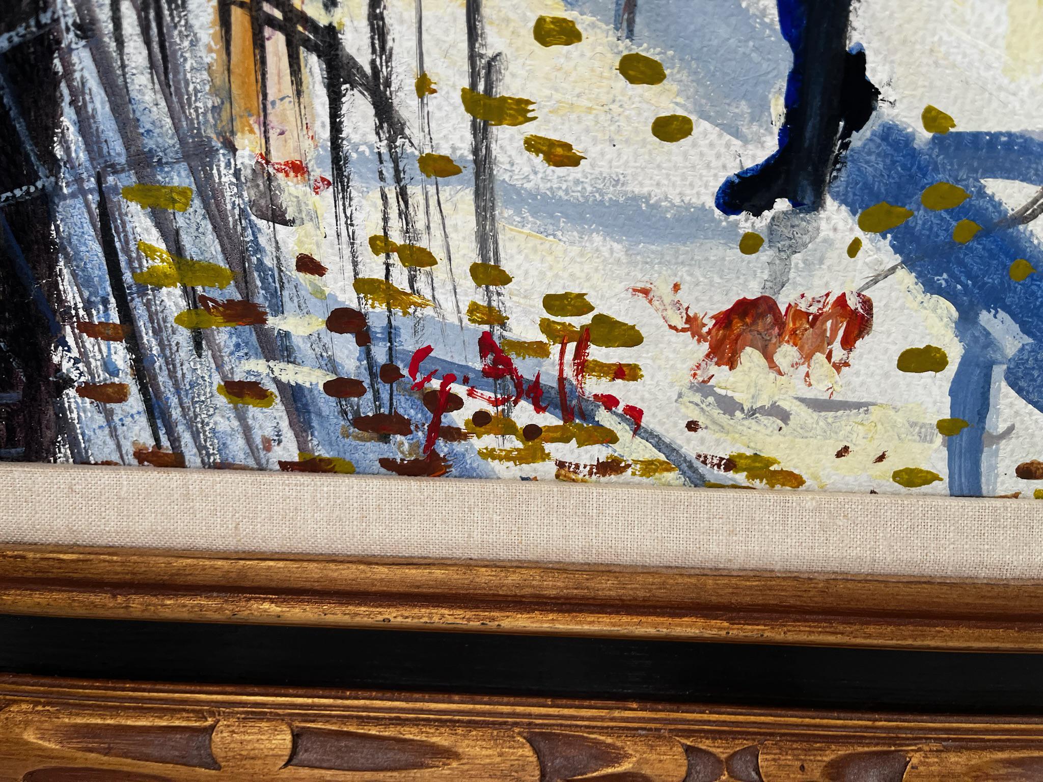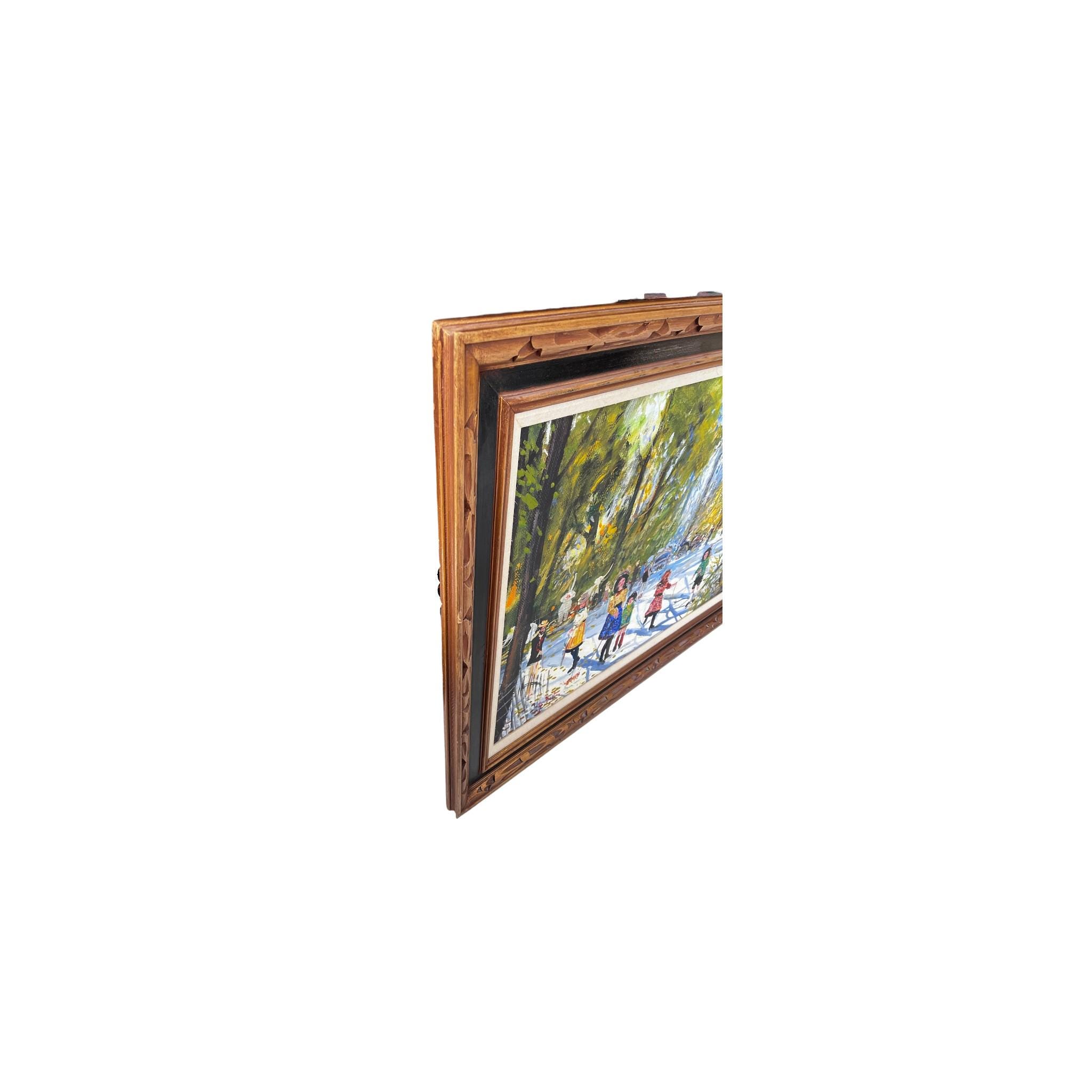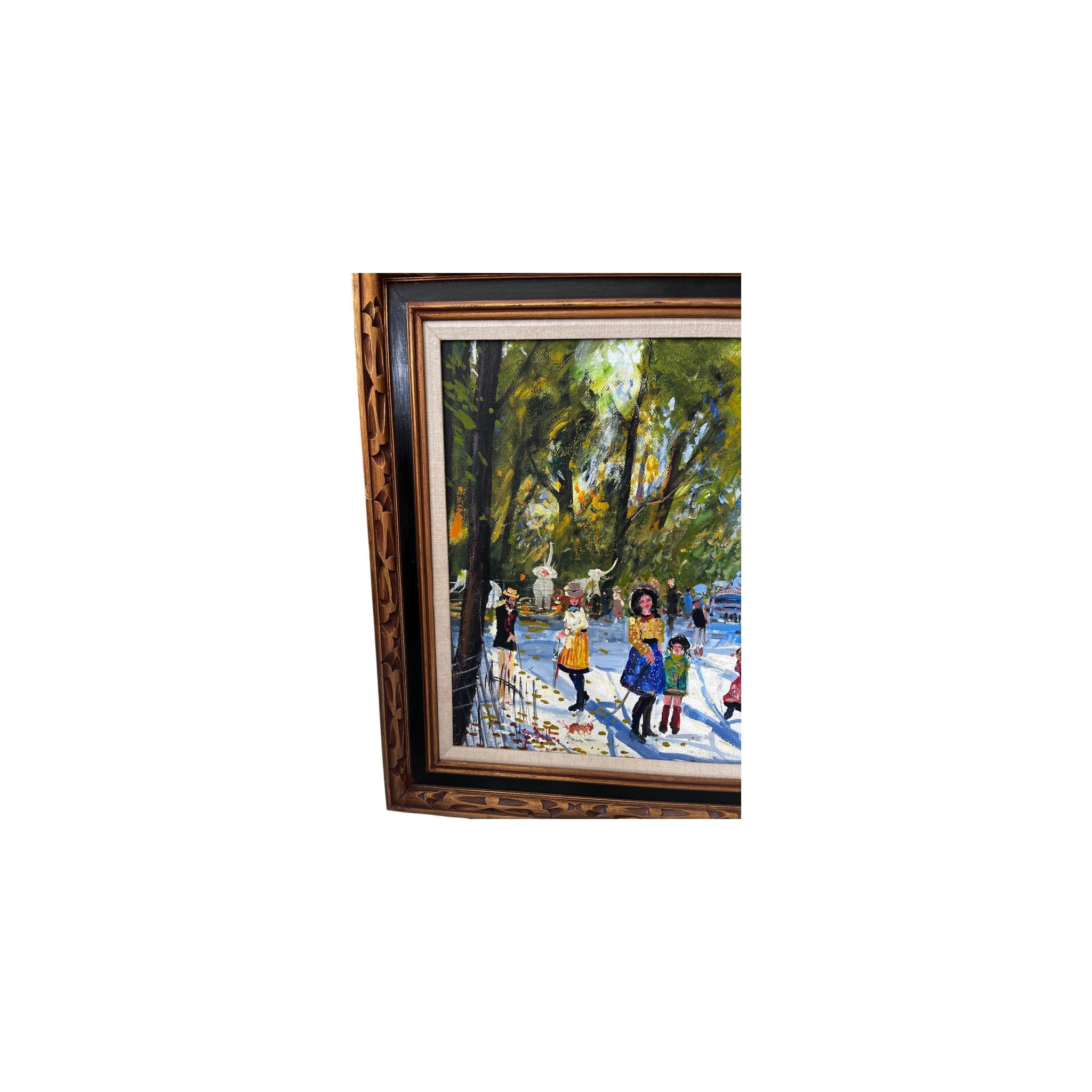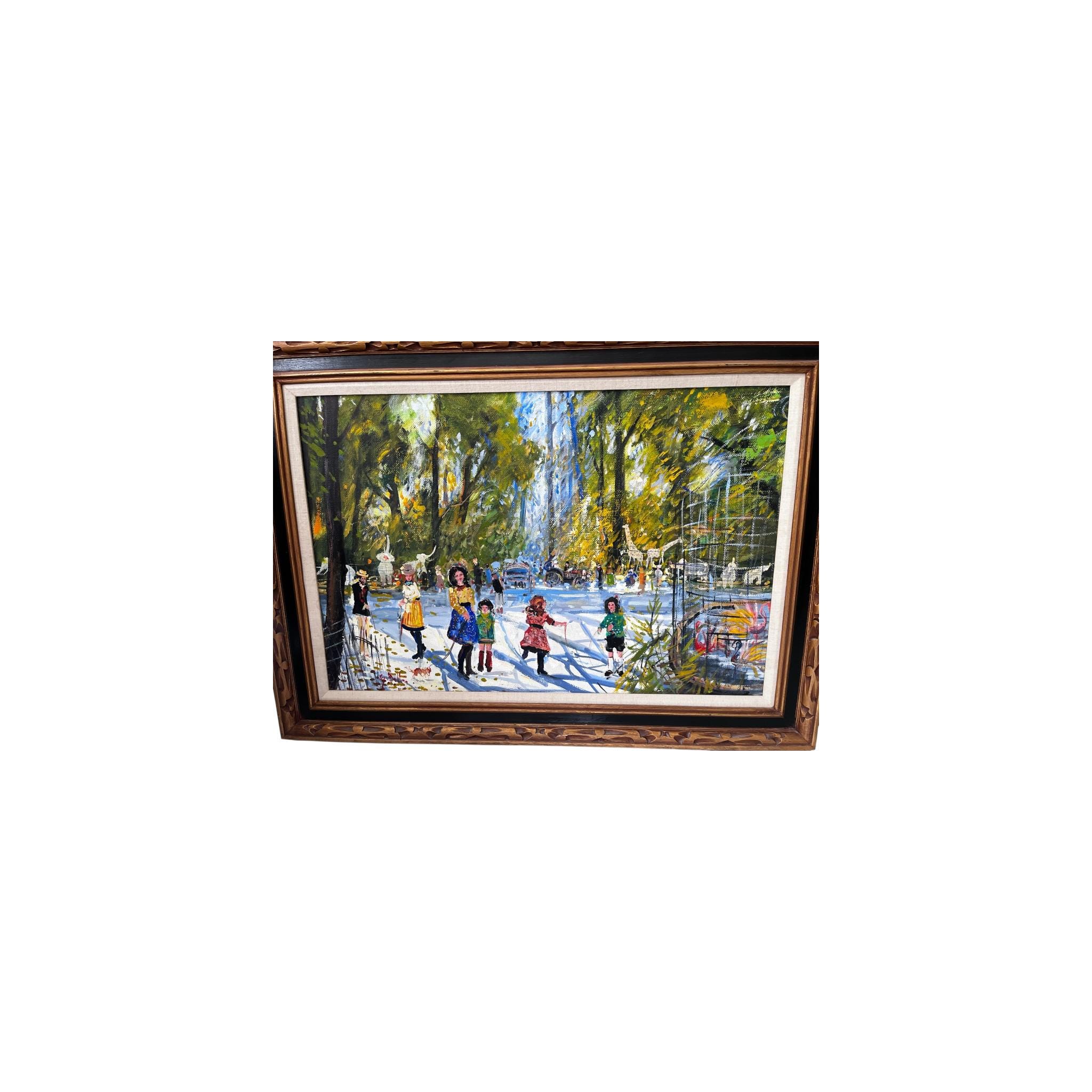 Vibrant impressionist park scene featuring children in colorful dresses walking along a sunlit path with trees, carriage, and whimsical animal figures in the background; heavy brushwork with textured palette knife detailing; oil on canvas; housed in ornate carved wood frame with linen liner; appears mid-century (circa 1950s-1970s)